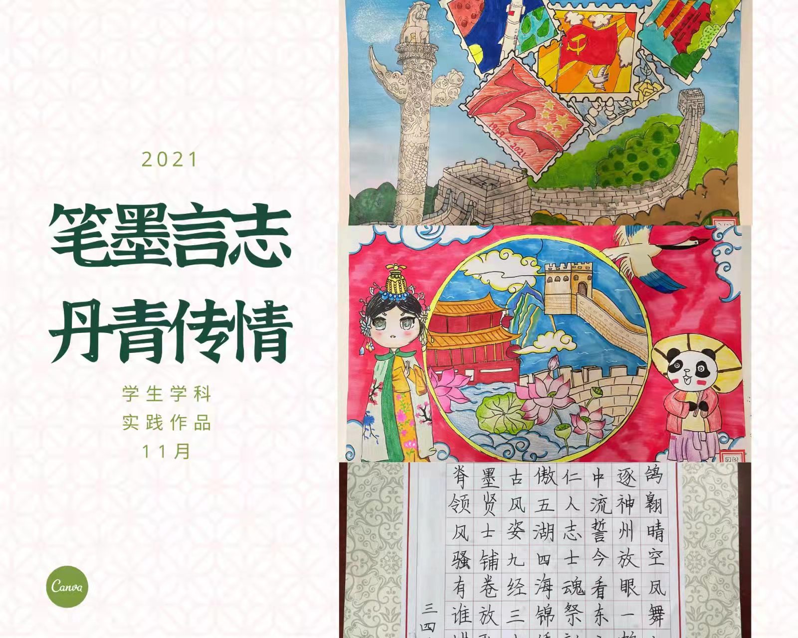 2021年是伟大祖国母亲72岁的生日,当我们唱着雄壮激昂的国歌,目睹着五星红旗冉冉升起,不禁为身为中华儿女而感到自豪与骄傲。为了全面丰富大家校园文化生活,提高学生综合素质,进一步促进我校精神文明建设,展现我校师生的新风貌、新形象,为此和平街一中清友园校区于十月份在学科实践活动中开展了以“歌颂祖国”为主题的“笔墨言志 丹青传情”书画作品创作活动,给校园文化带来了新鲜空气,成为创新校园文化的新亮点。