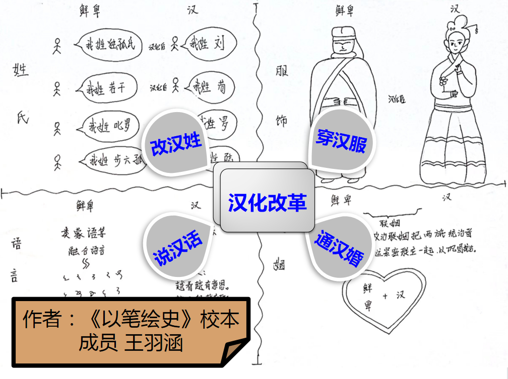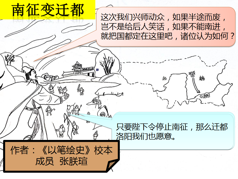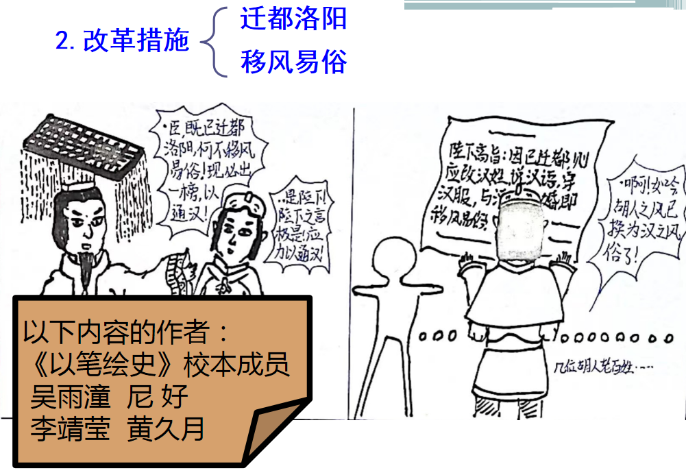 2021年12月8日,北京市和平街第一中学朝来校区的刘怡然老师展示了一节区优青示范课《北魏政治和北方民族大交融》,课堂中大量引用学生选修课《以笔绘史》的作品为教学素材,让离学生很久远的历史知识,非常直观的展示在学生自己面前,让学生有“我的课堂我做主”的感觉,激发了学生学好历史的热情!也为本学科的选修课程做了一个很好的广告。