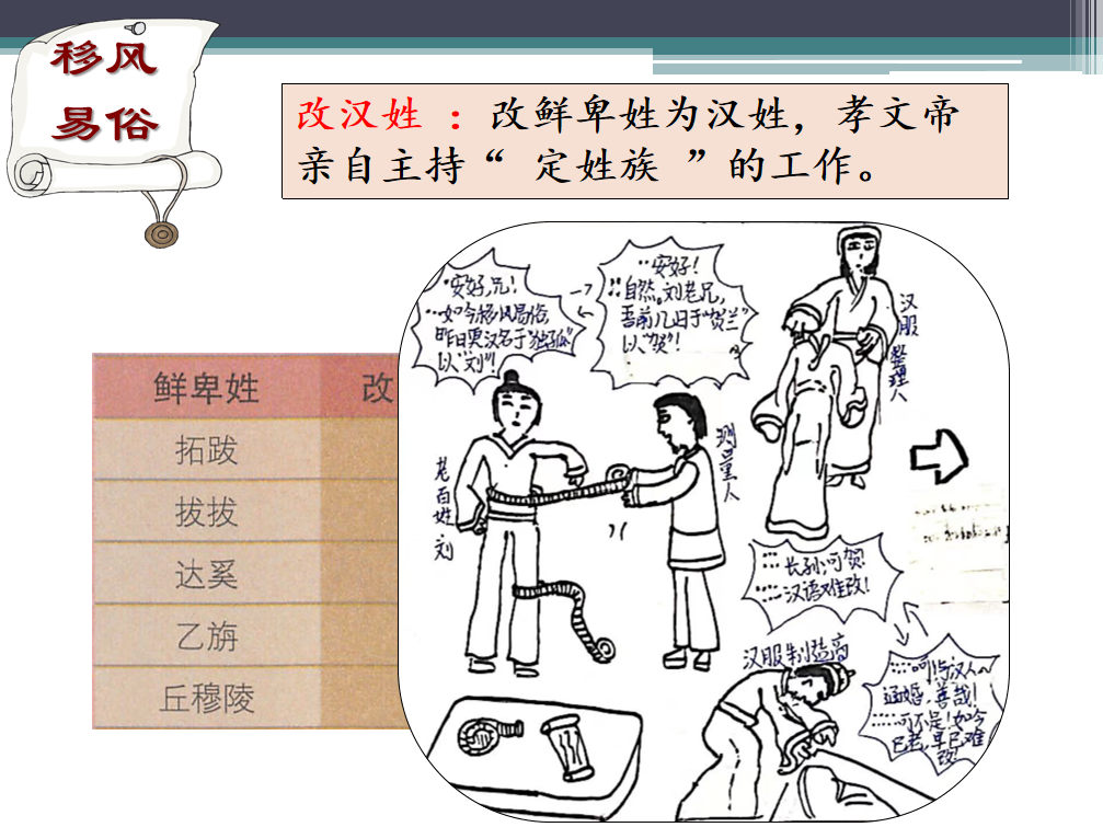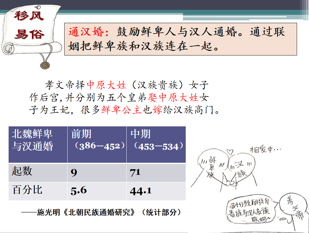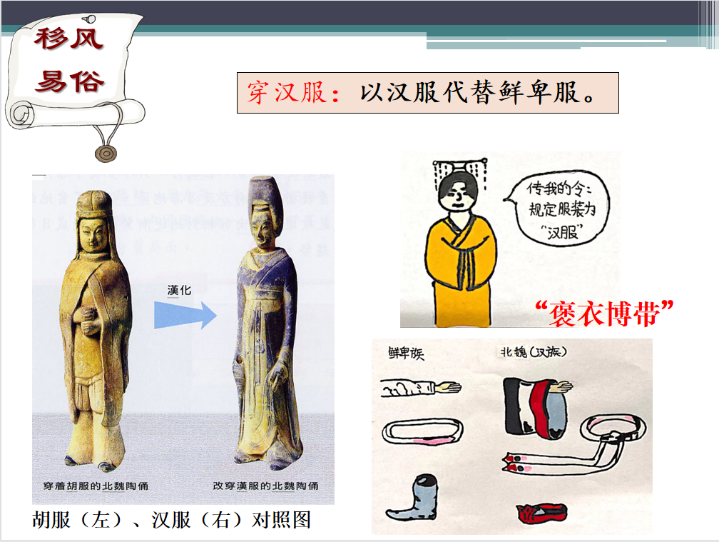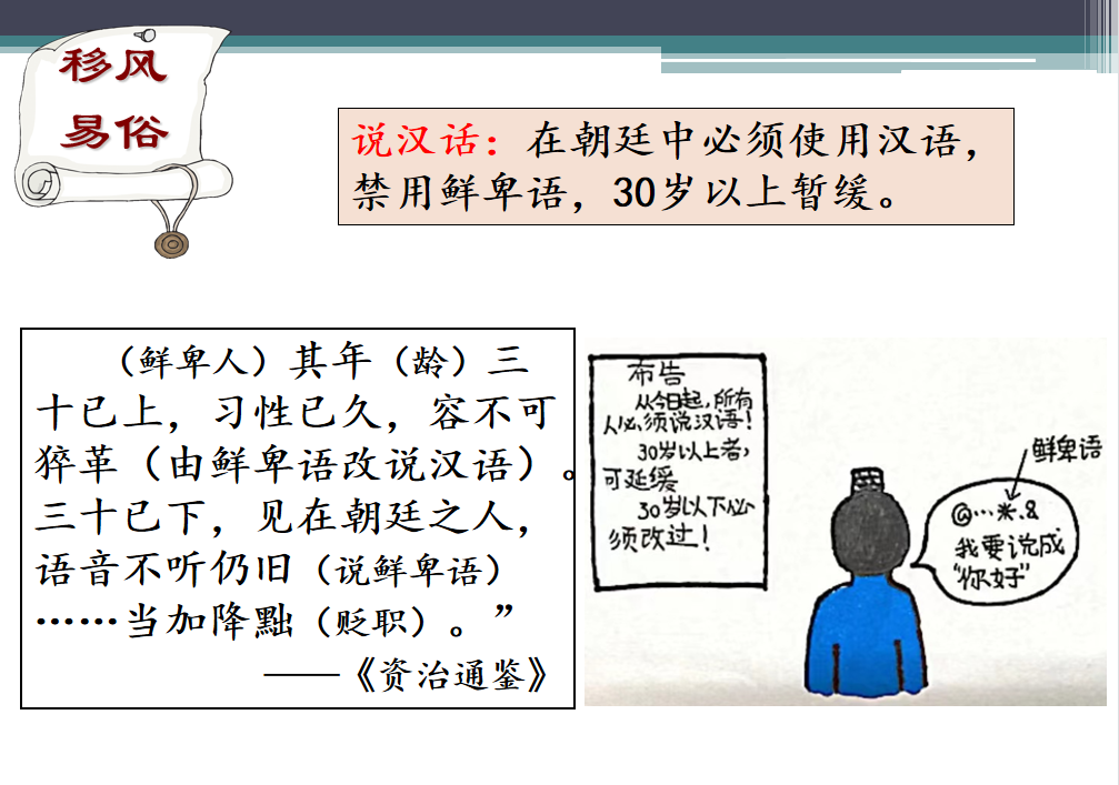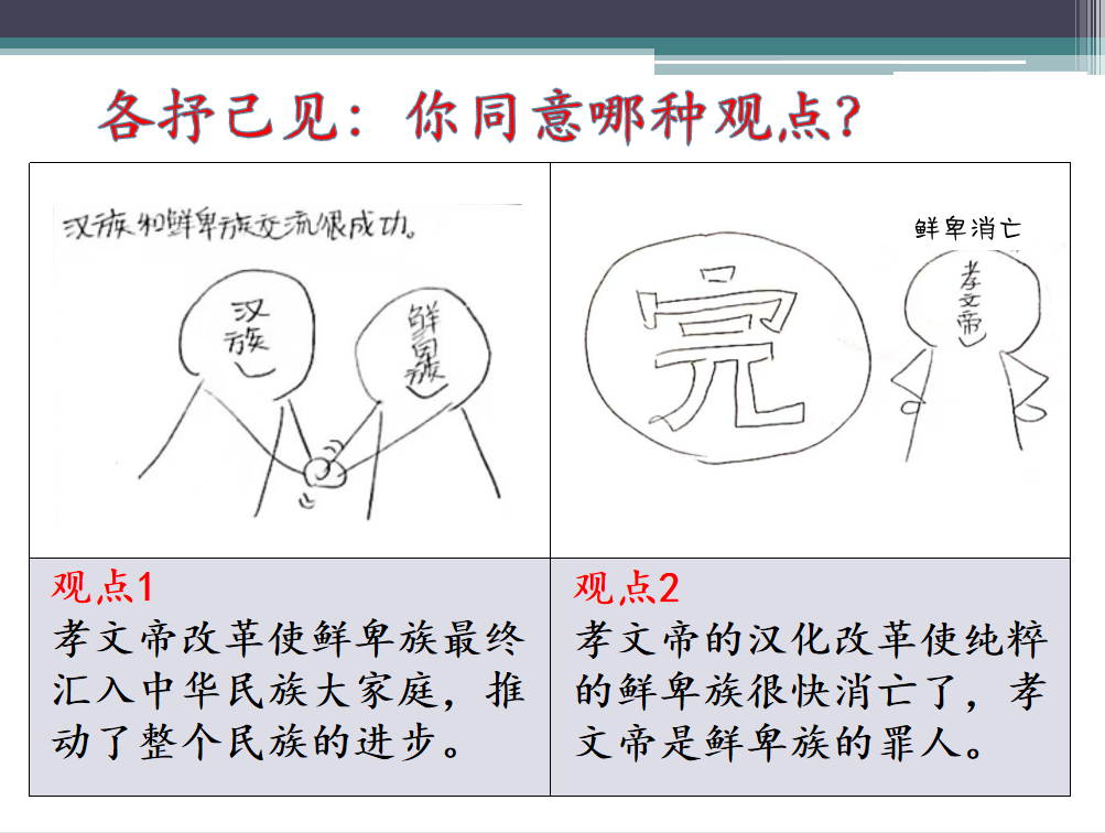 本课是第四单元政权分立与民族交融这一学习主题中,最能体现民族交融这一时代特点。魏晋以来,以鲜卑族为代表的各少数民族与汉族之间在生产、生活、政治、经济、文化等方面互相影响、互相学习,出现了民族交融的趋势,而北魏孝文帝顺应历史的发展进行改革,增强了民族交融,推动了历史的向前发展,这是本节课的基本线索。