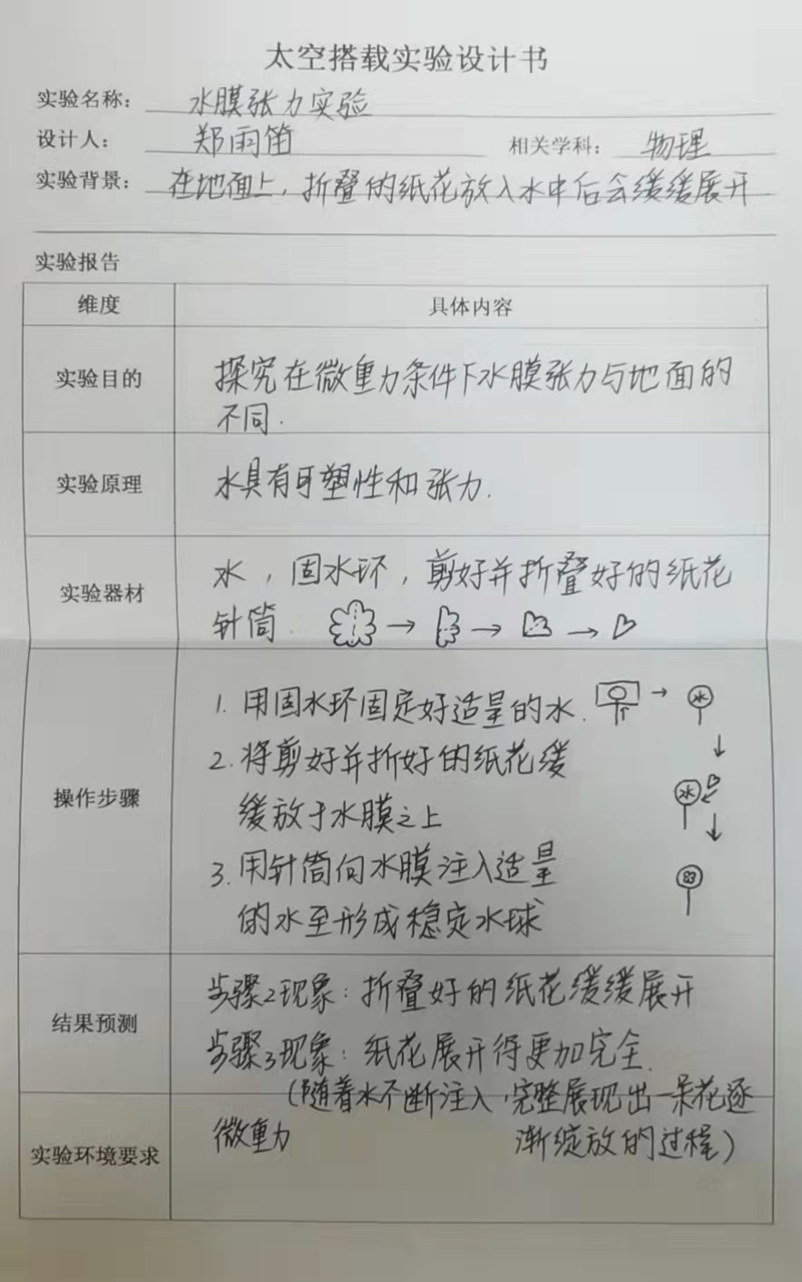 水膜实验创意的设计者之一高一7班的郑雨迪说:“在写设计书和实验过程中都培养了我们严谨、认真的态度,尤其是语言的表达和过程的描述是否清晰易懂。老师们通过天宫课堂为我们讲解各种学科的知识、对比不同且神奇的实验现象,有利于拓宽我们的视野,同时,原先所学的知识也更加生动起来。”高一8班的谭雨涵表示:“虽然我们彼此之间隔着屏幕,但当我看到他们在太空舱里讲课的样子我依旧心潮澎湃。为我们国家有这样专业、敬业、爱业的宇航员而骄傲;为我们国家有这样走在世界前列的航天技术而自豪!”