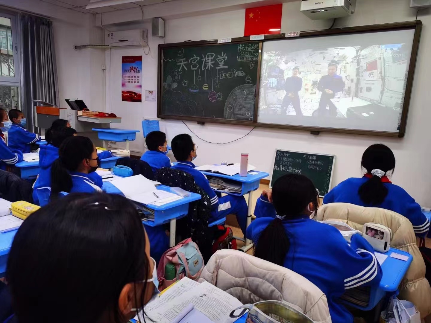 为了让学生们感知宇宙的奥秘、体验探索的乐趣,激发大家对科学的兴趣。北京市和平街第一中学六校区全体学生分别在各校区观看了这场激动人心的课程直播。莲葩园校区学生代表还有幸在中国科技馆地面主课堂和王亚平的女儿一起近距离感受了这场天地连线。