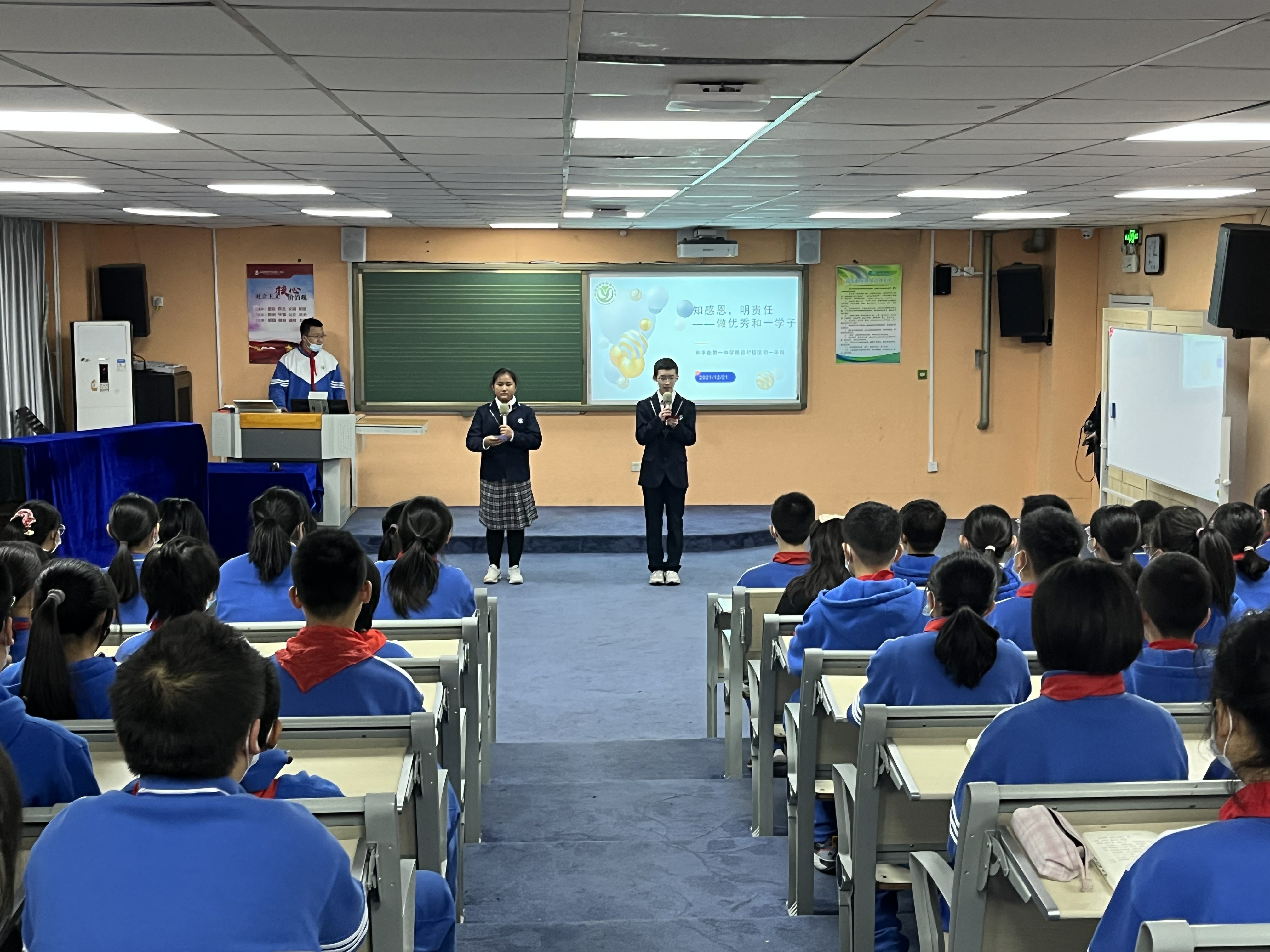冬已深,春尚远,在这紧张忙碌学期的尾声,和平街一中奥运村校区初一年级全体师生齐聚一堂,召开了主题为“知感恩 明责任 做优秀和一学子“年级学生会。