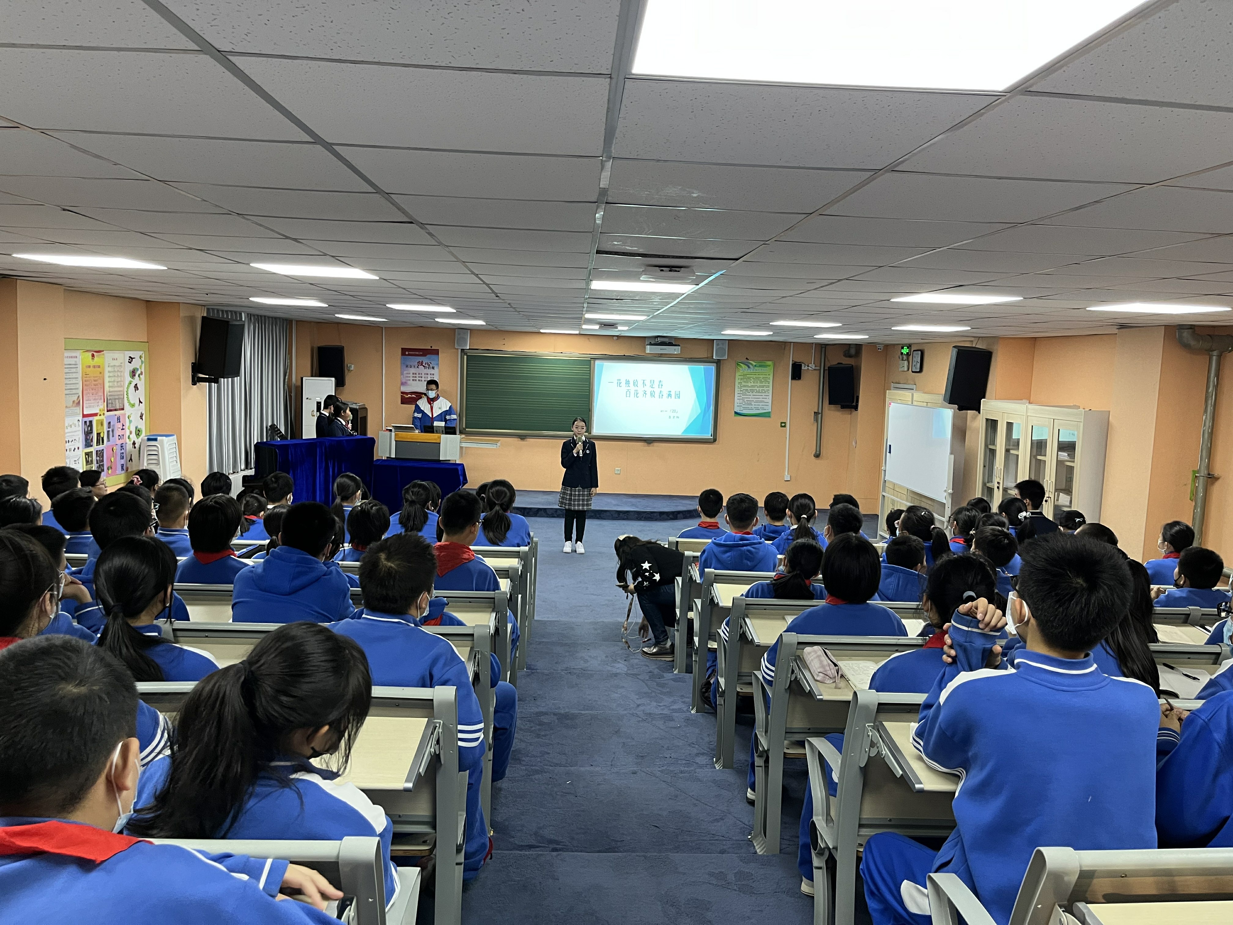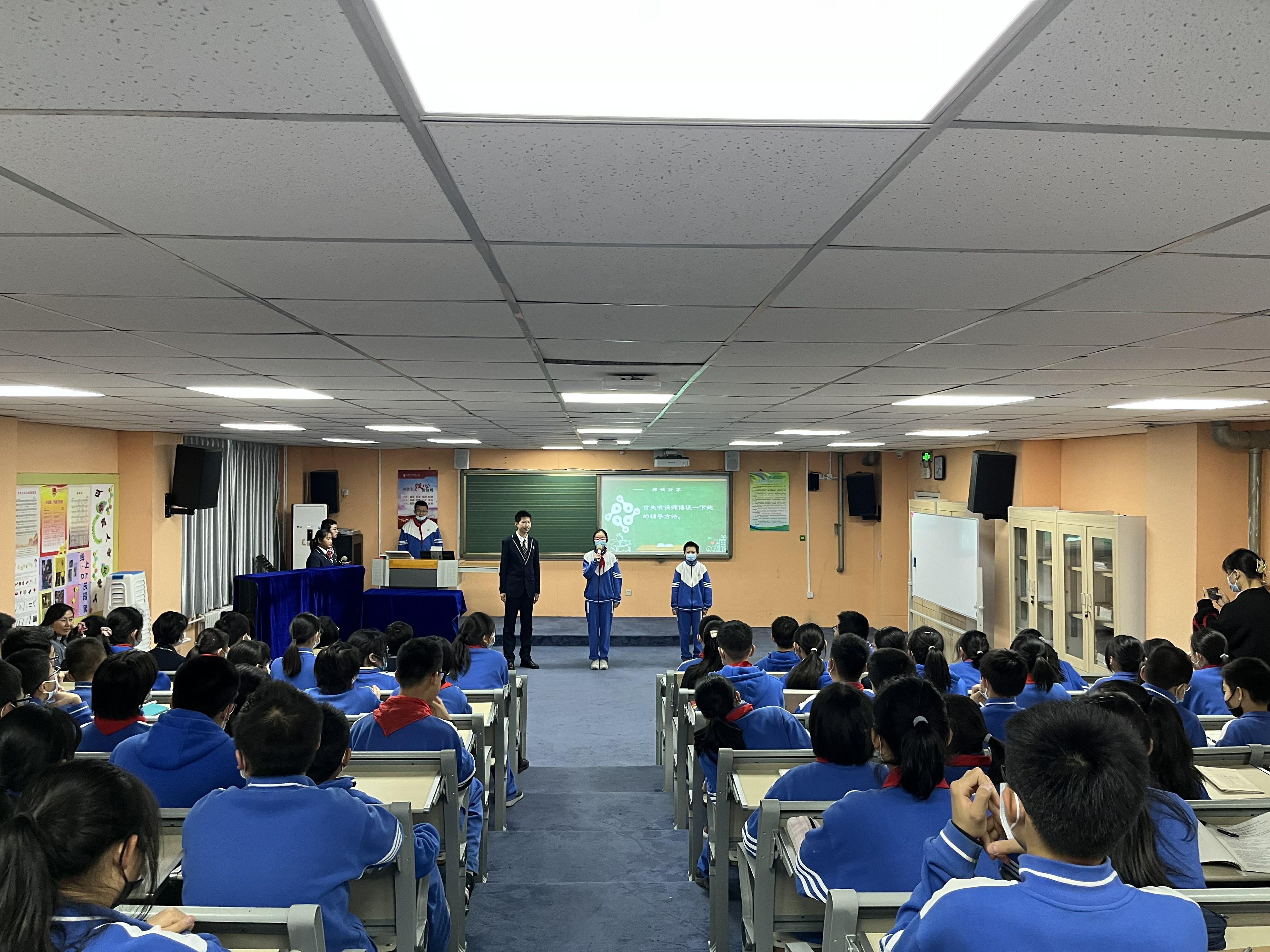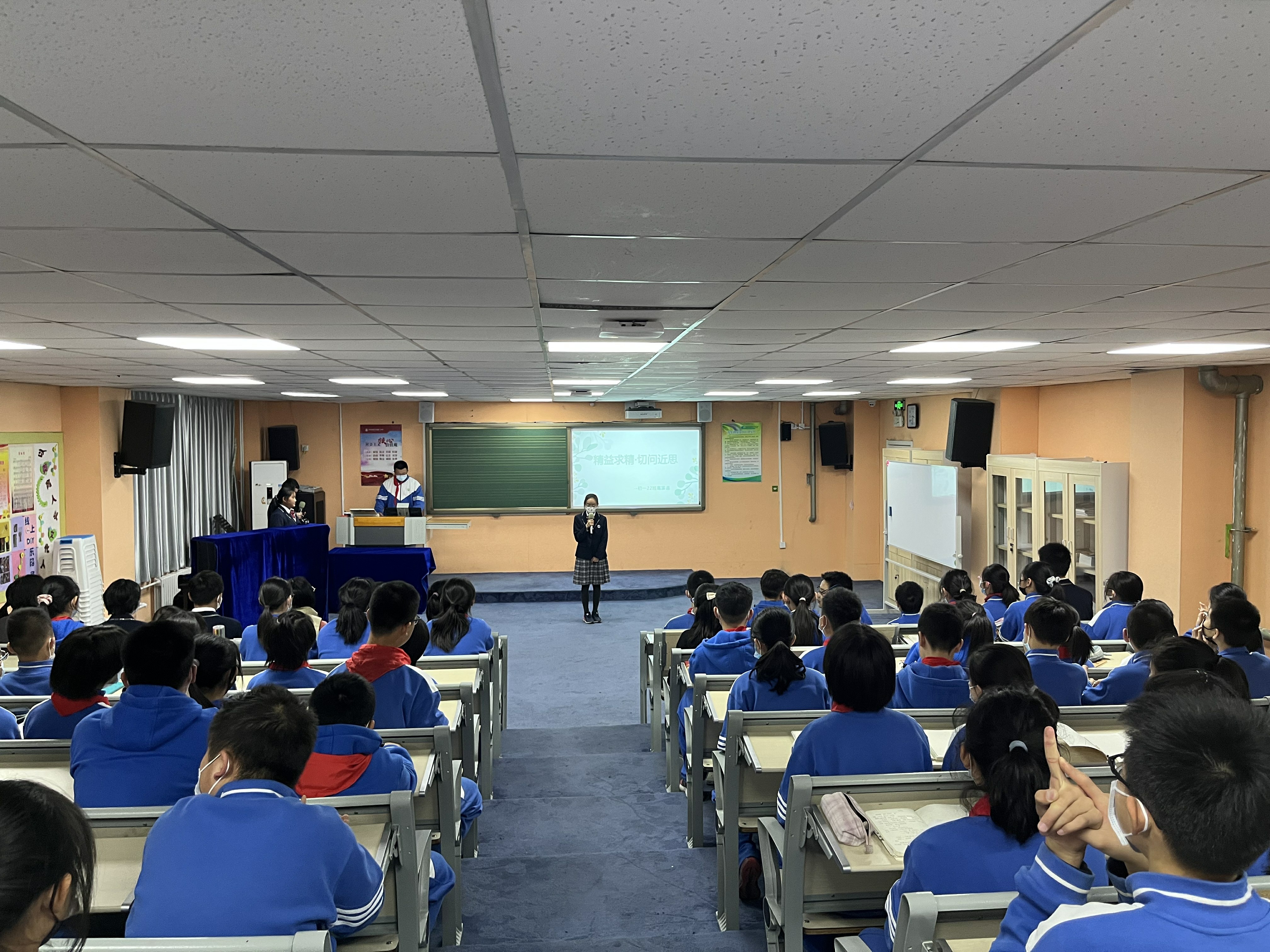 学生会分为“感恩师长”和“文明履责”两大板块。在“感恩师长”板块,初一年级19班王麦琳家长分享了关于习惯的培育;20班苏歆然家长分享了手机管理的进化史;21班田诗媛家长分享了家庭亲子运动的开展;22班安铭雨家长则寄语孩子们走出属于自己的星辰大海……家长们的分享与期望让学生们更懂得父母的不易,懂得感恩父母。21、22班李戊、潘悦可等4位同学以一首《让我怎样感谢你》的中英文双语诗朗诵表达了对老师谆谆教诲的感激之情。“文明履责”板块伊始,20班赵丹等8位同学首先展示了日常学习生活中的几个小片段,提醒学生们时刻谨记自己的责任,从一举一动、一言一行中展示我们的文明风采,让静生美、让敬生德、让静生慧;紧接着,各班学委代表各班交流了对于学习责任的感悟:21班田书宁《晒晒我的英语学习小妙招》从听、说、读、背交流了自己的学习方法;22班高溪遥以《精益求精,切问近思》分享了她们班是如何挑战数学的;20班吕京阳同学则针对小组battle、个人与集体的关系寄语同学们“一花独放不是春,百花齐放春满园”;19班的周家禾同学特邀了本班一对师徒,介绍小组帮扶制度在本班的开展与效果……