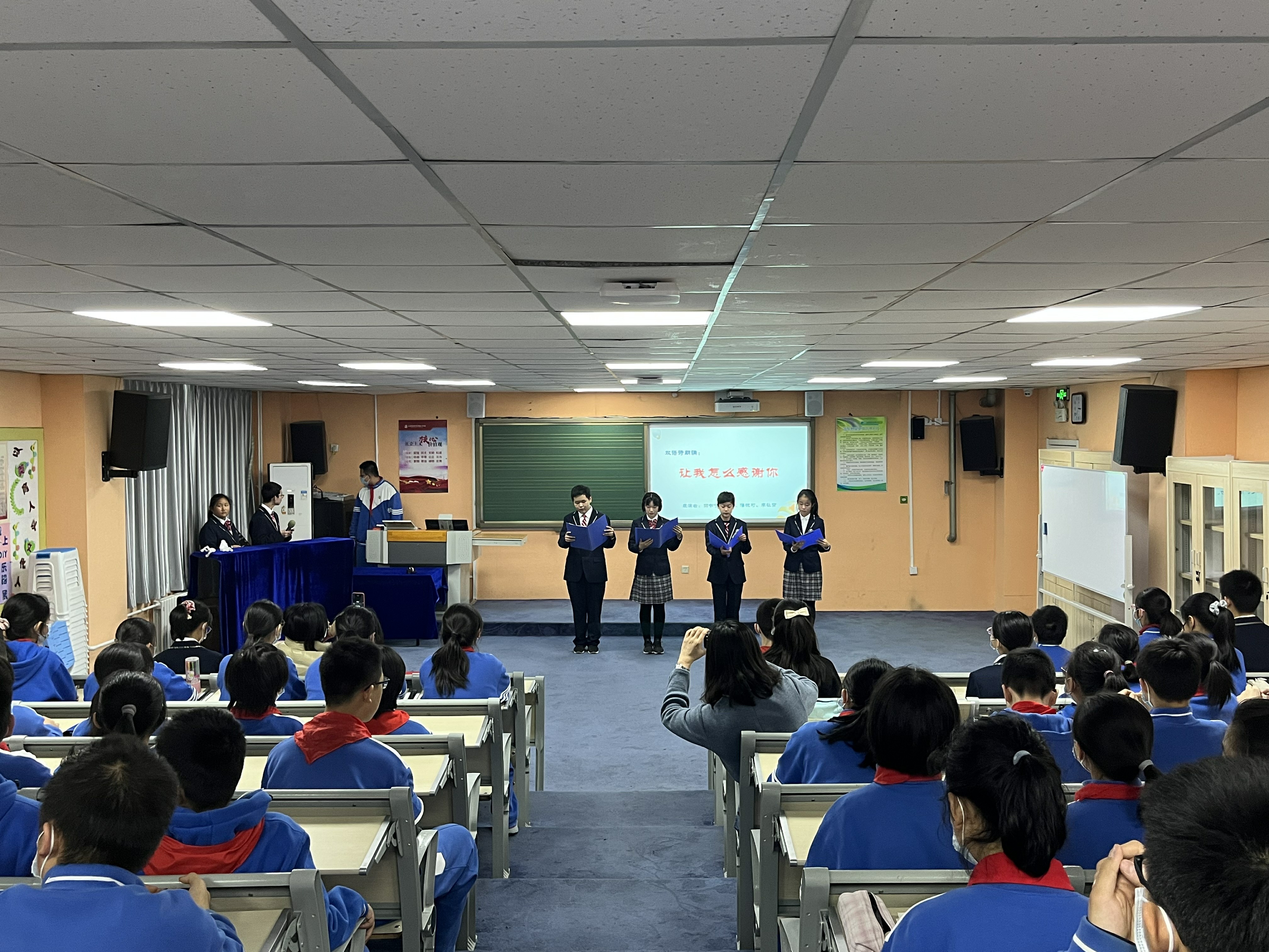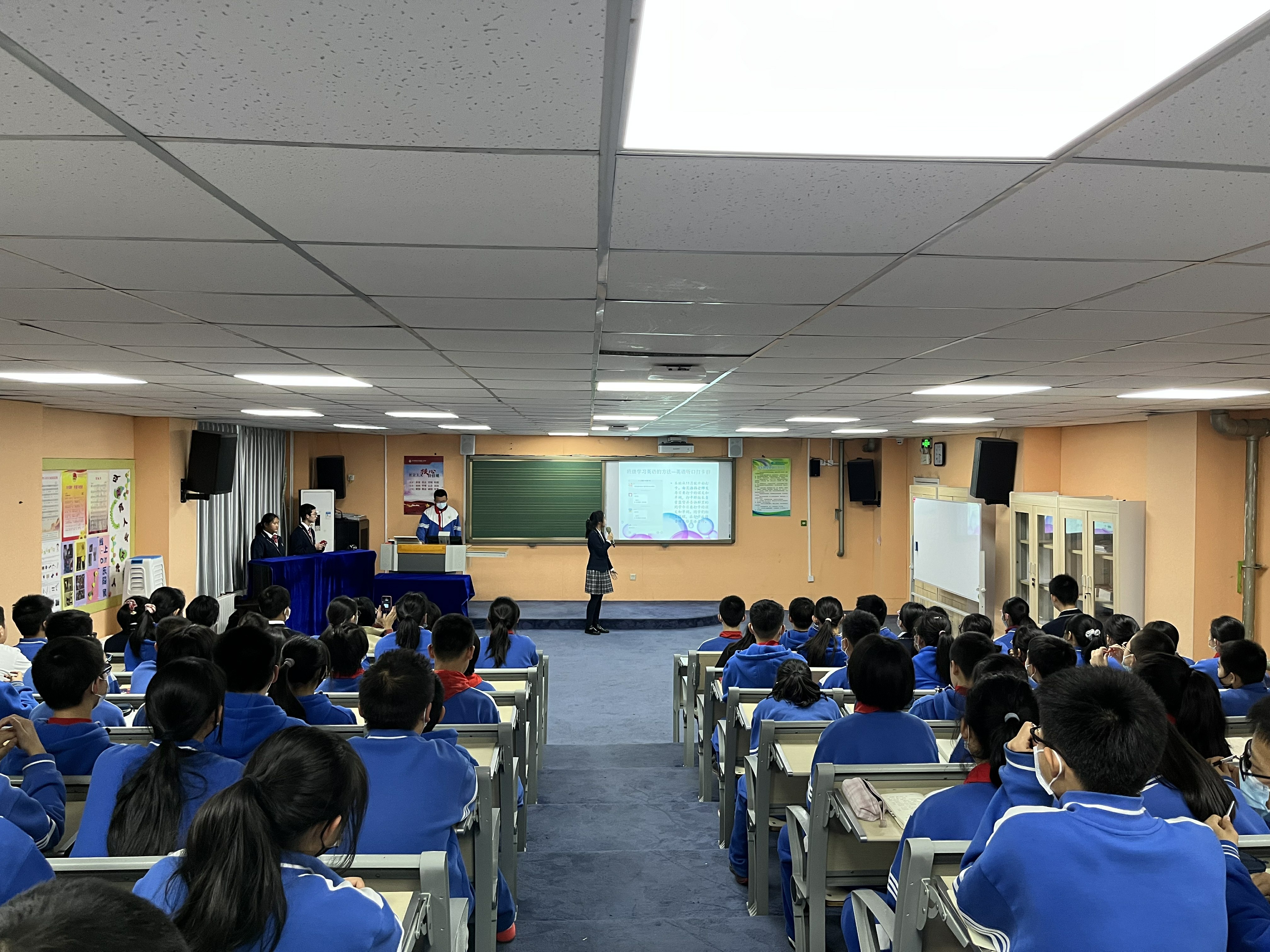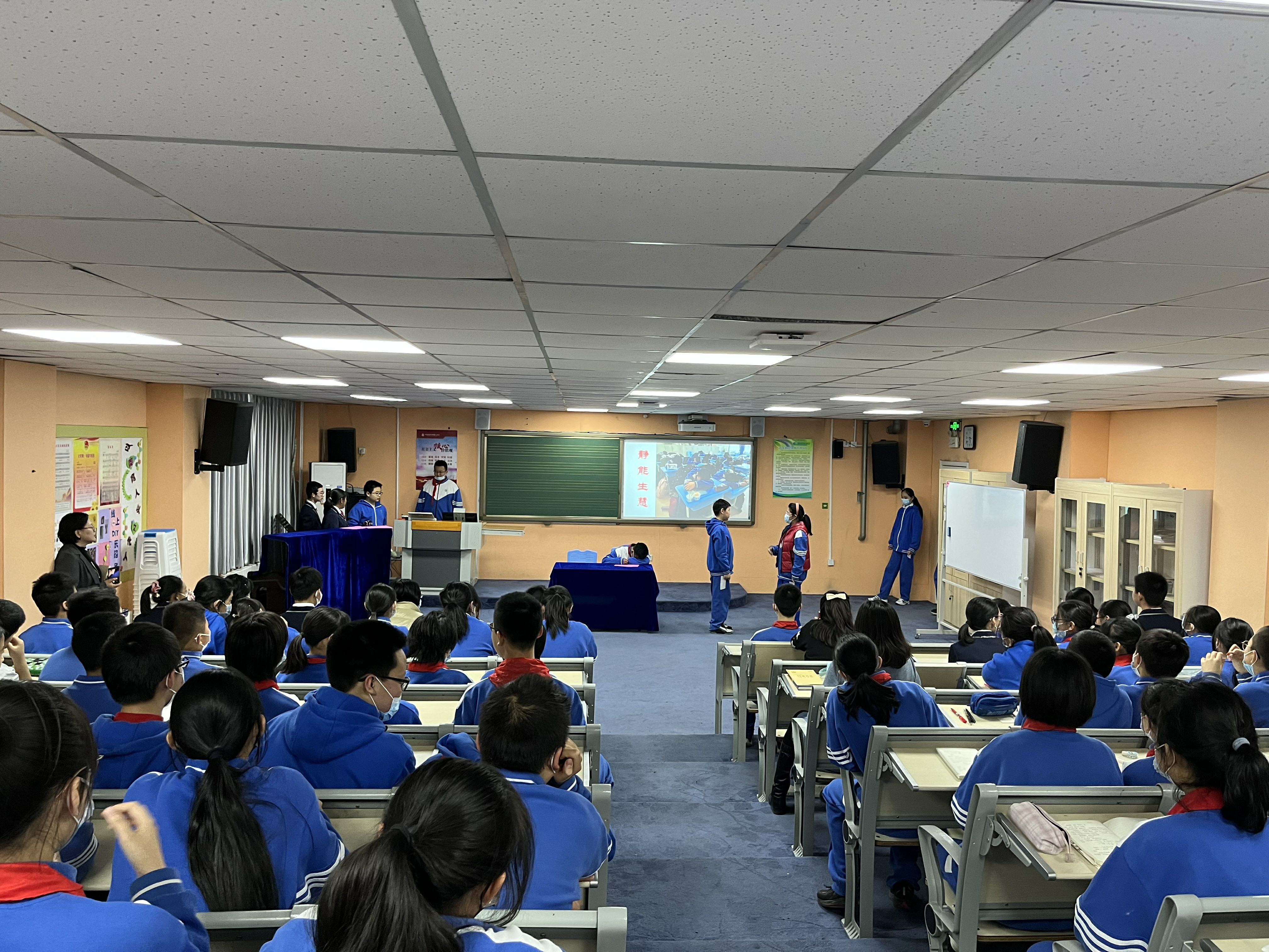 学生会分为“感恩师长”和“文明履责”两大板块。在“感恩师长”板块,初一年级19班王麦琳家长分享了关于习惯的培育;20班苏歆然家长分享了手机管理的进化史;21班田诗媛家长分享了家庭亲子运动的开展;22班安铭雨家长则寄语孩子们走出属于自己的星辰大海……家长们的分享与期望让学生们更懂得父母的不易,懂得感恩父母。21、22班李戊、潘悦可等4位同学以一首《让我怎样感谢你》的中英文双语诗朗诵表达了对老师谆谆教诲的感激之情。“文明履责”板块伊始,20班赵丹等8位同学首先展示了日常学习生活中的几个小片段,提醒学生们时刻谨记自己的责任,从一举一动、一言一行中展示我们的文明风采,让静生美、让敬生德、让静生慧;紧接着,各班学委代表各班交流了对于学习责任的感悟:21班田书宁《晒晒我的英语学习小妙招》从听、说、读、背交流了自己的学习方法;22班高溪遥以《精益求精,切问近思》分享了她们班是如何挑战数学的;20班吕京阳同学则针对小组battle、个人与集体的关系寄语同学们“一花独放不是春,百花齐放春满园”;19班的周家禾同学特邀了本班一对师徒,介绍小组帮扶制度在本班的开展与效果……