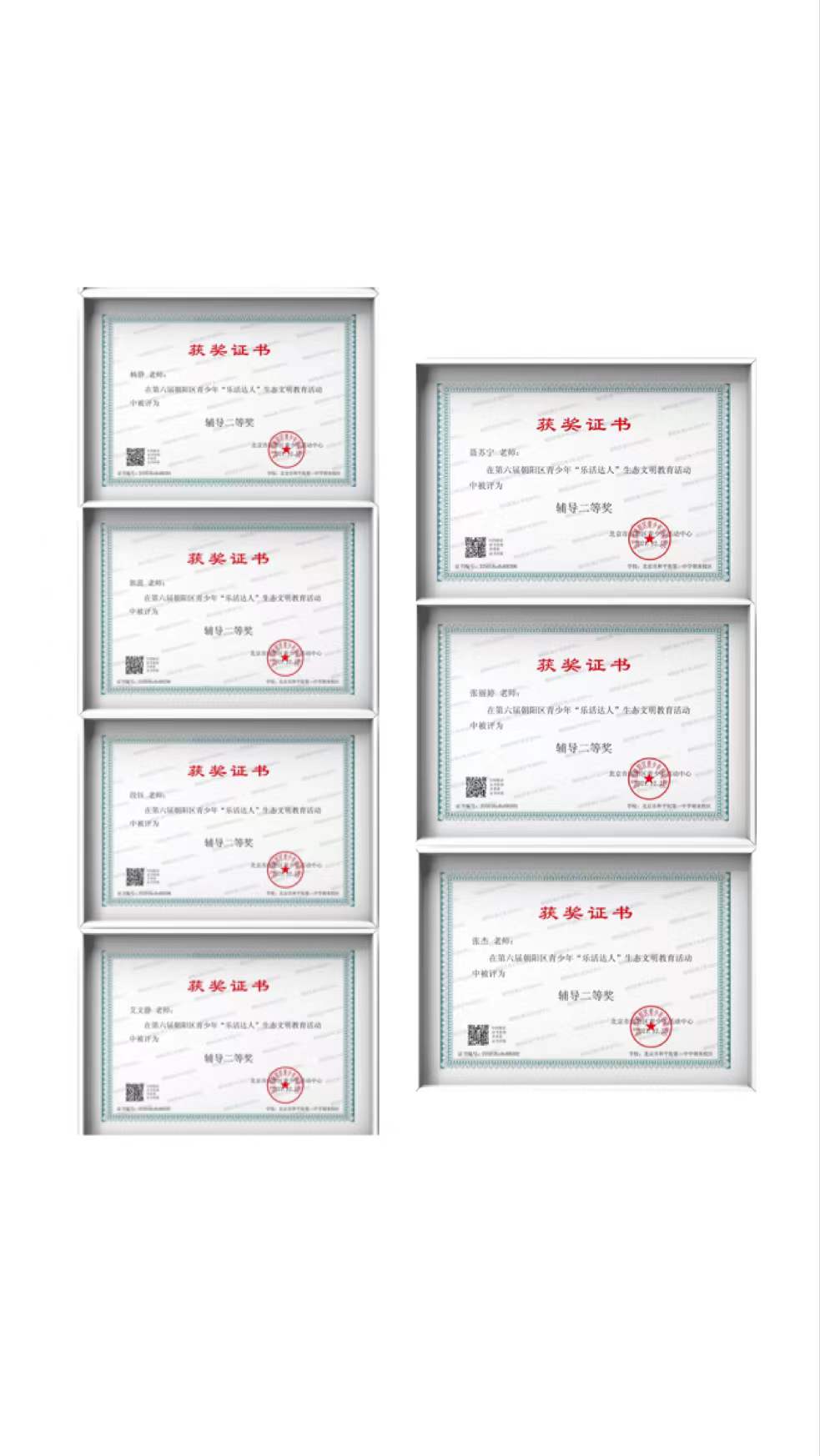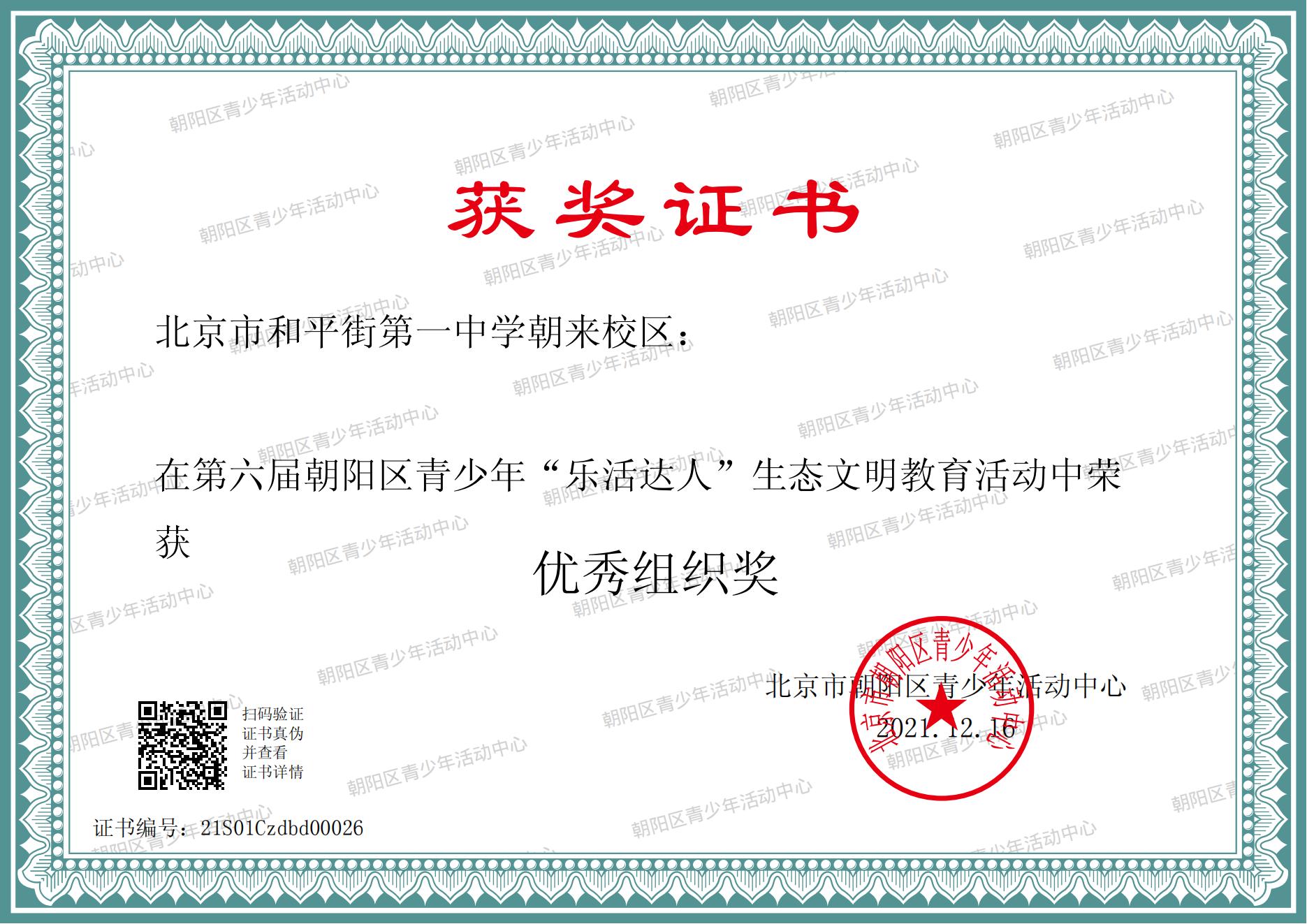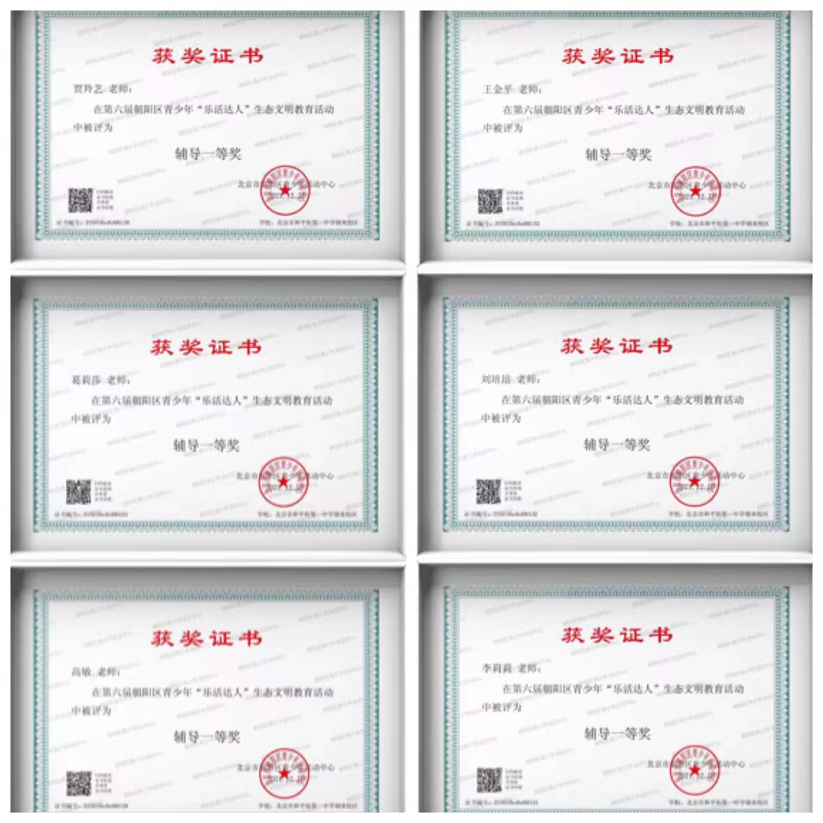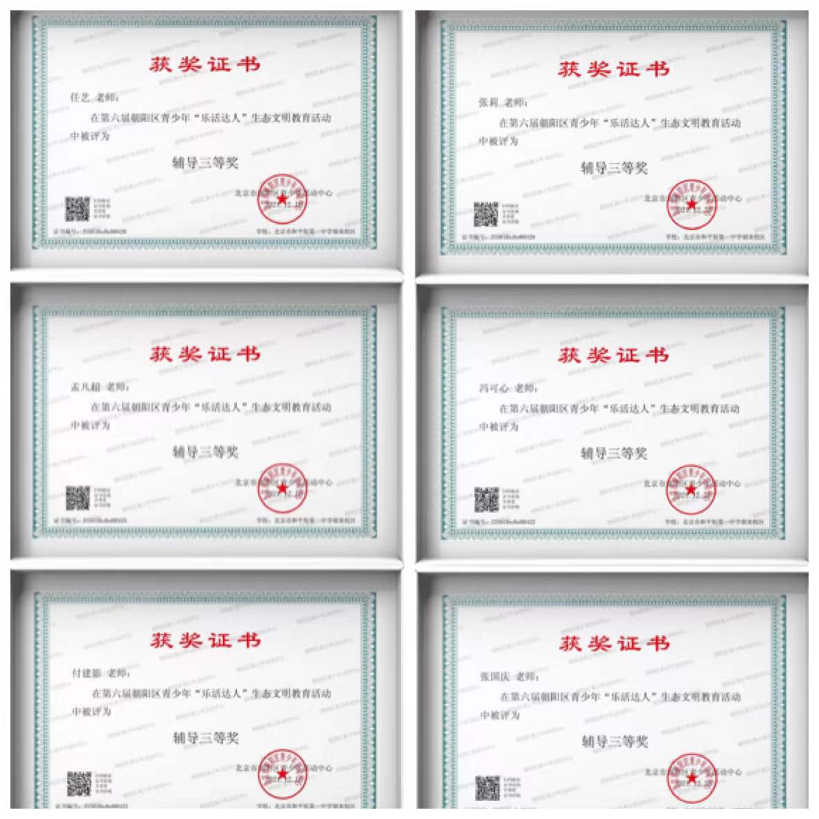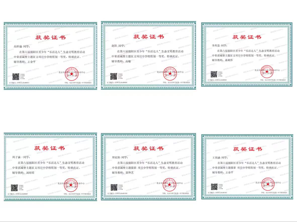 202012月,由朝阳区青少年活动中心主办的第六届阳区青少年“乐活达人”比赛圆满结束。和平街一中朝来校区共推选百余份作品参加比赛,涵盖创意制作、科学研究、文学作品、摄影作品和艺术创作等,其中,征文作品荣获一等奖5人、二等奖14人、三等奖19人,摄影作品荣获一等奖1人、二等奖4人、三等奖14人,科学研究荣获二等奖1人、三等奖1人,艺术作品荣获三等奖3人,创意作品荣获三等奖1人。