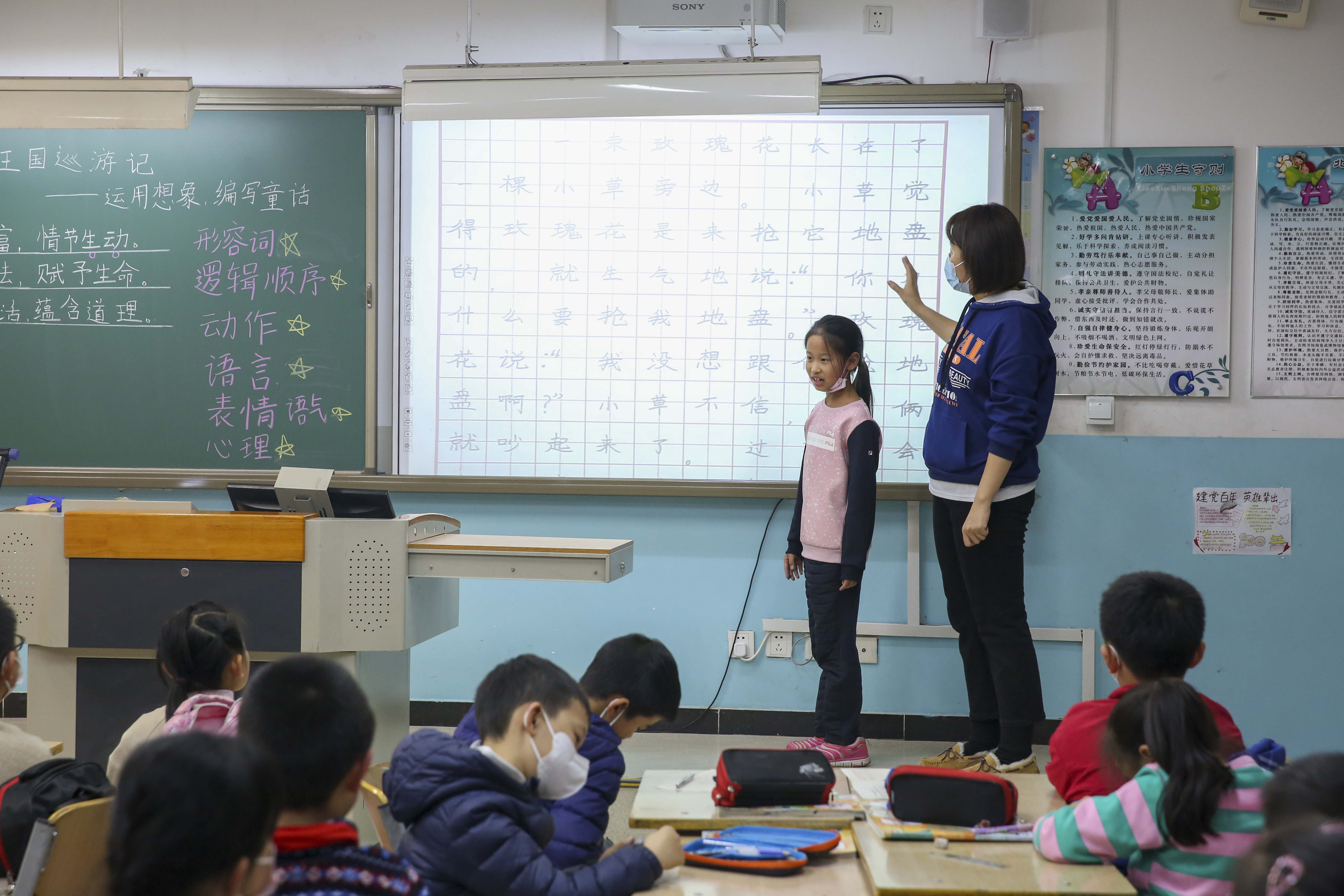 第二课时,赵迎楠老师引导孩子们对自己创作的童话进行品评修改。赵老师首先带领孩子们回顾了生动表达的方法:运用生动的形容词;表达要按照一定的逻辑顺序;综合运用语言、动作、神态、心理等描写方法。赵老师采用小组积分的方式调动孩子们的学习热情。同学们小手如林,热情高涨。在赵老师的精心设计与引导下,同学们在情节创意和生动表达两方面都有了全新的思考和突破。在赵老师启发式的教学中同学们文思泉涌,再一次全情投入到童话创作之中。紧接着,赵老师依次请了三个小组的同学到前台向大家展示自己的童话作品。同学们兴味盎然的读着自己的作品,眼神中透着骄傲和自豪。下面的同学也听得津津有味,感受着童话的神奇魅力。