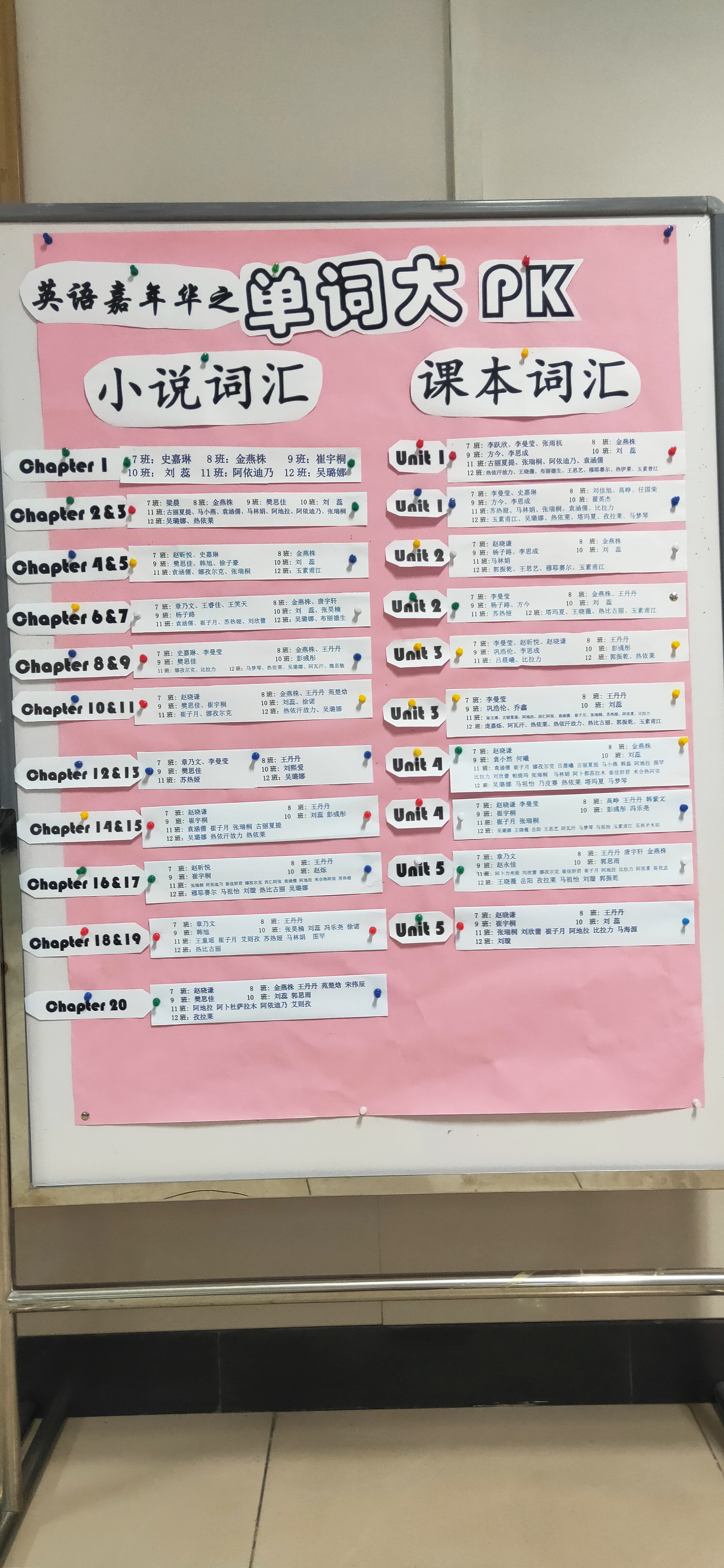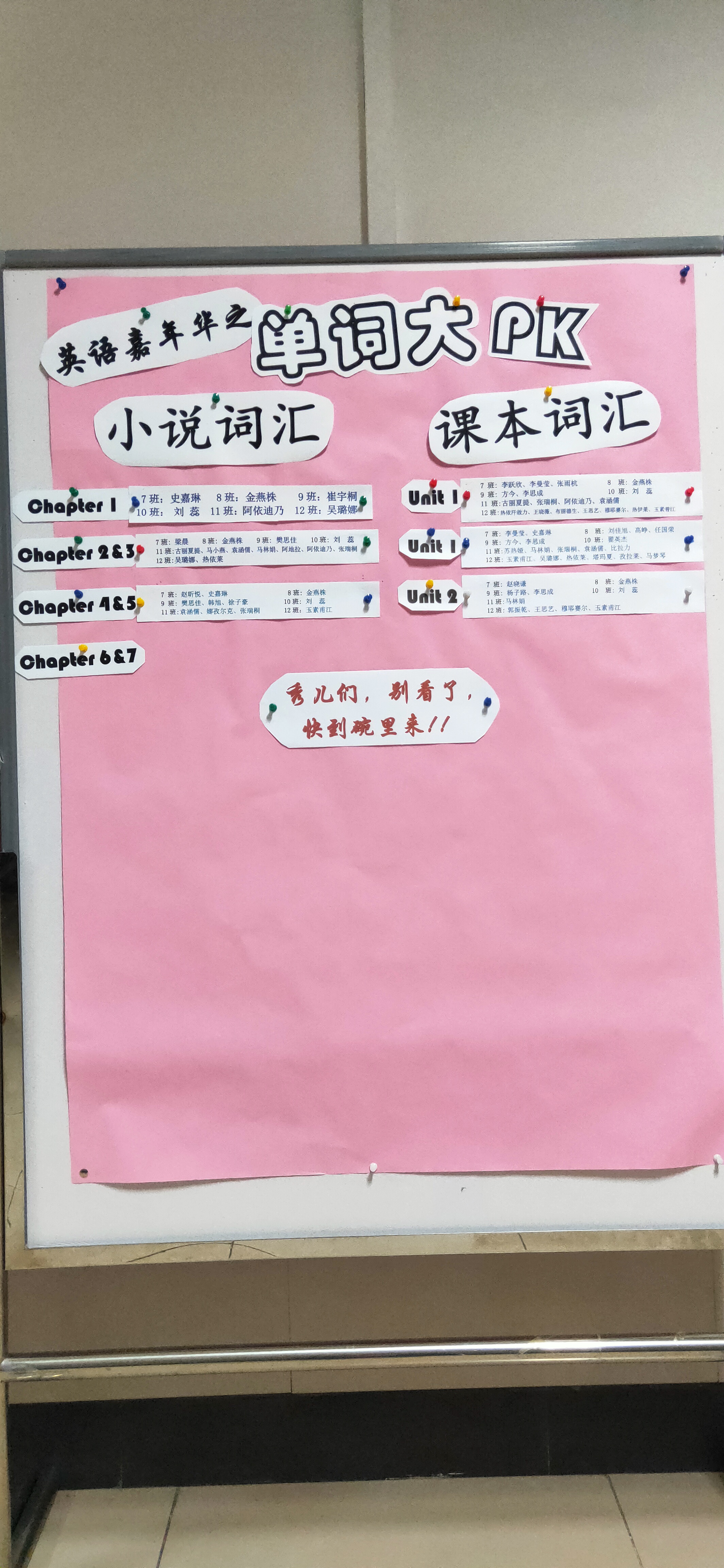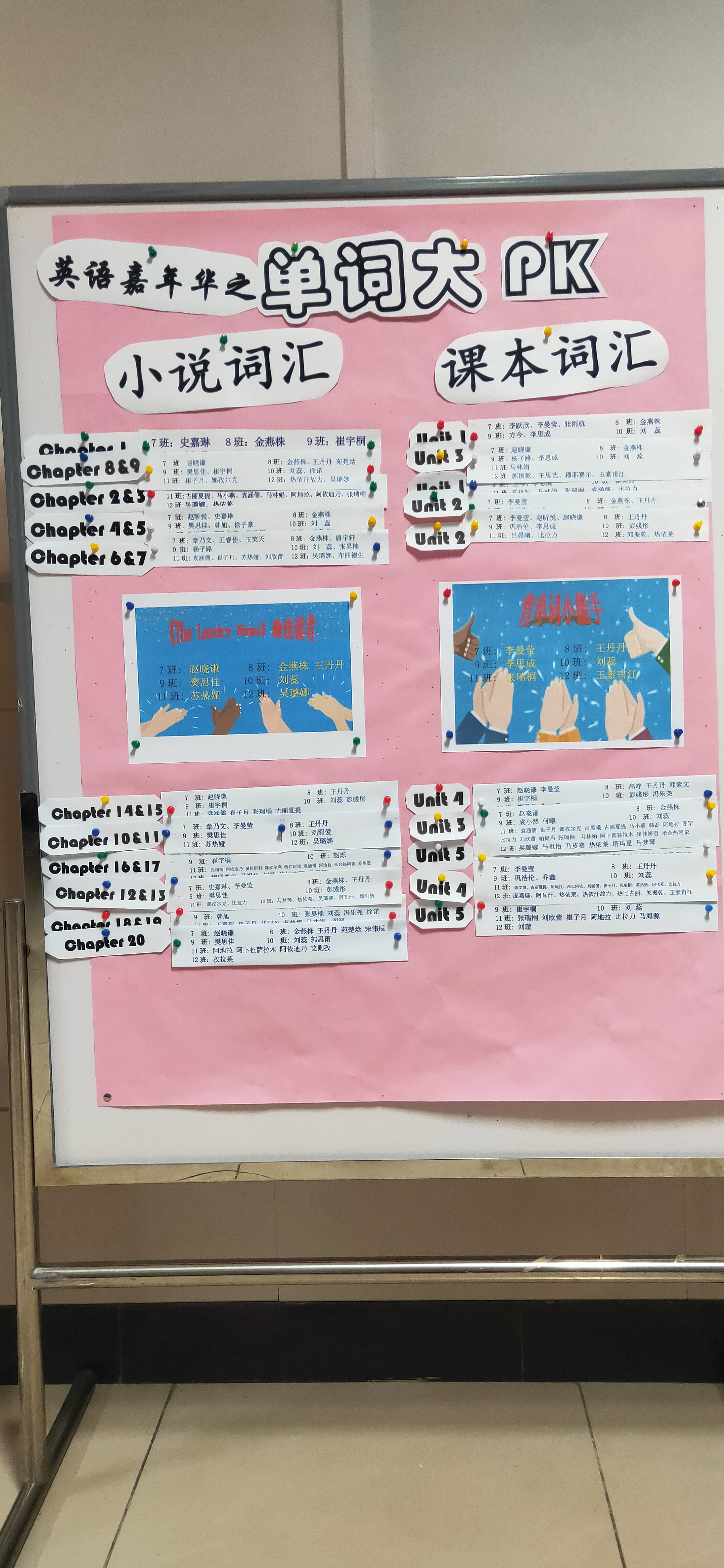 学期初,高二英语备课组的三位教师共同商讨并确定阅读书目。为了促进并检测词汇积累情况,实现课外阅读和课内学习同步走,通过展板设小说词汇榜和课本词汇榜两个板块,每周将每班成绩最高者张榜表彰。