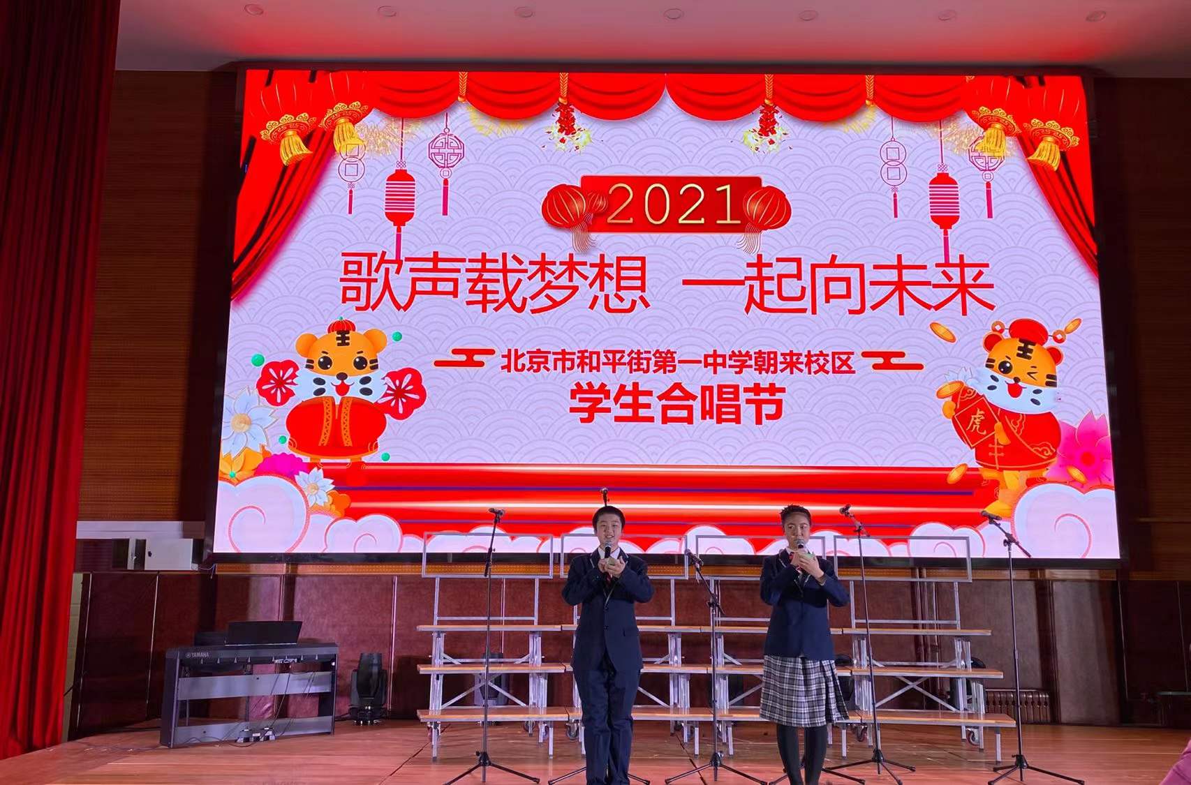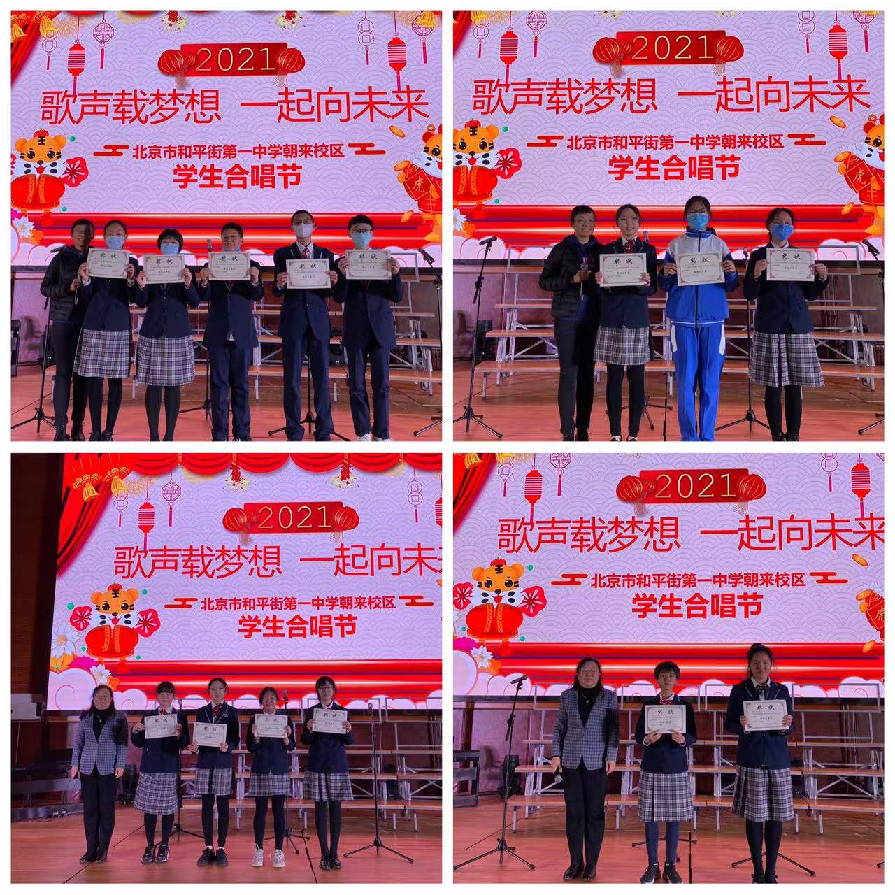 合唱现场,《我和我的祖国》、《唱支山歌给党听》、《山河已无恙》、《保卫黄河》、《红星闪闪》、《明天会更好》、《歌声与微笑》、《童年》、《少年》以及《我相信》等一首首耳熟能详的歌曲表达了师生对党对祖国的歌颂与赞美之情,抒发了心怀希望、用理想谱写幸福的决心。最后,合唱团的同学们唱响冬奥主题曲《一起向未来》,庆贺北京成为首个“双奥之城”,引导大家关注冬奥,为即将到来的冬奥会助力。