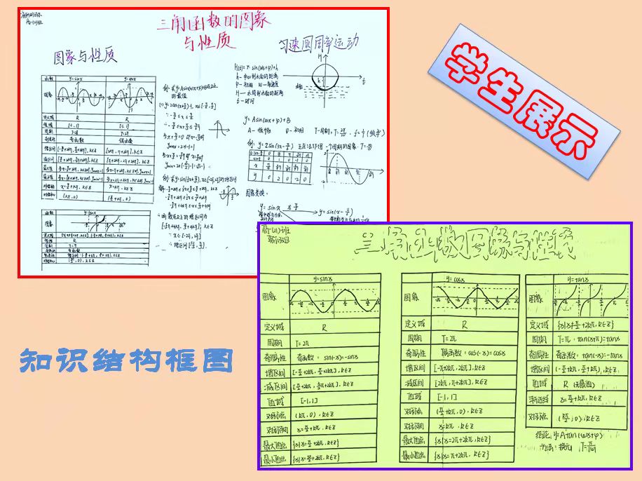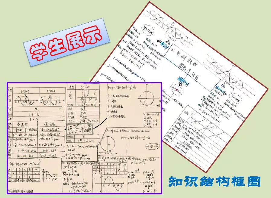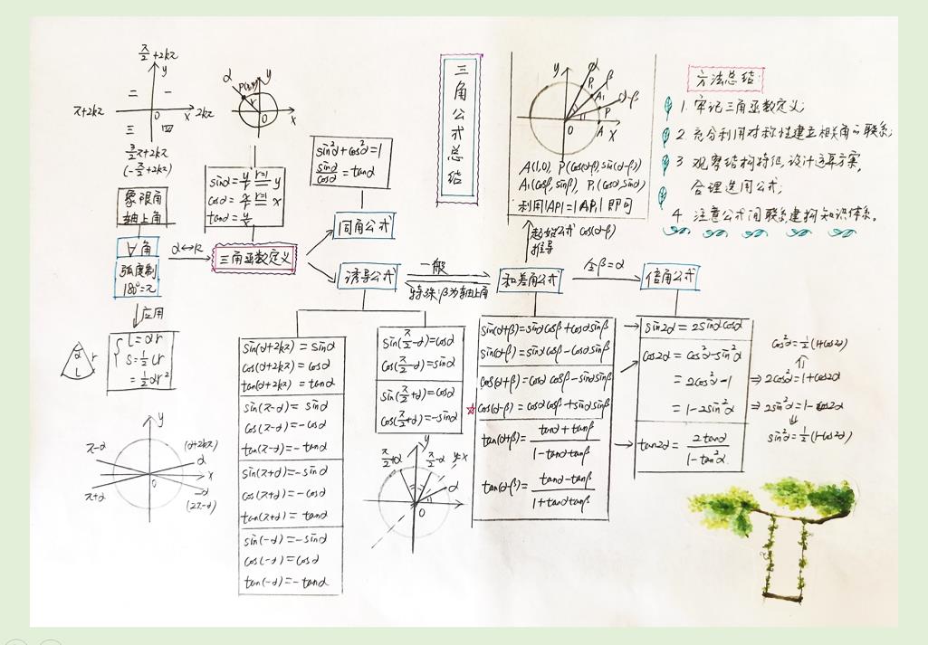 为此,刘波老师和王云霞老师分别绘制了两个单元的结构图,对学生进行了具体示范和指导。比如在“三角公式”单元中,要体现出“三角函数定义是所有公式的本源,还可以标出“诱导公式” 与“和差角公式是特殊与一般的关系等。对于学生意识不到的问题,我们又强调了一些细节,比如要突出中央关键词,要用同颜色彩笔标注同一层级的主题词,注意版面布局的美观性等等。