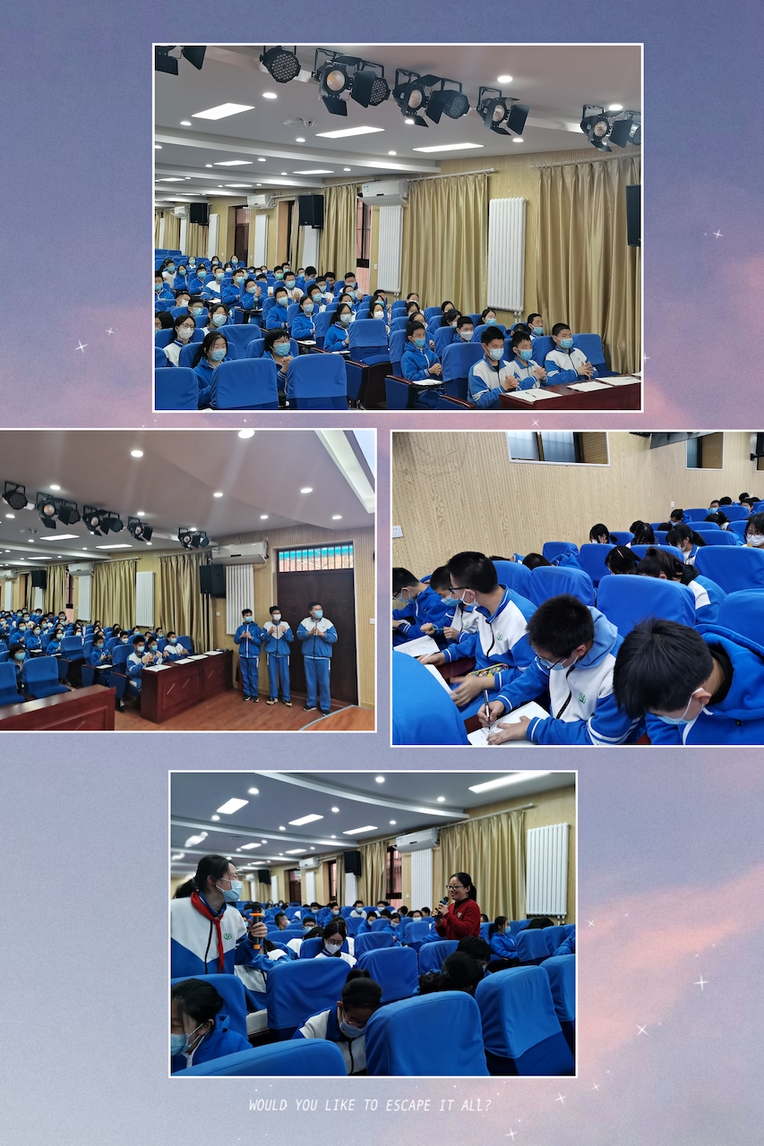 在临近期末考试学生心理压力凸显的关键时间点,学校持续关注学生身心健康。为调节学生期末复习氛围,提高学生自信心,缓解学生考前心理焦虑情绪,1月4日下午班会时间我校区初二年级开展本学期最后一次心理韧性提升课——“为学习加油 为努力喝彩”。本次课继续采用线上与线下相结合的方式进行,4个班级在礼堂参加现场课,其余班在教室参加腾讯会议。本次专题课由我校区心理梁爽老师主讲,初二年级班主任和全体学生一起参加。