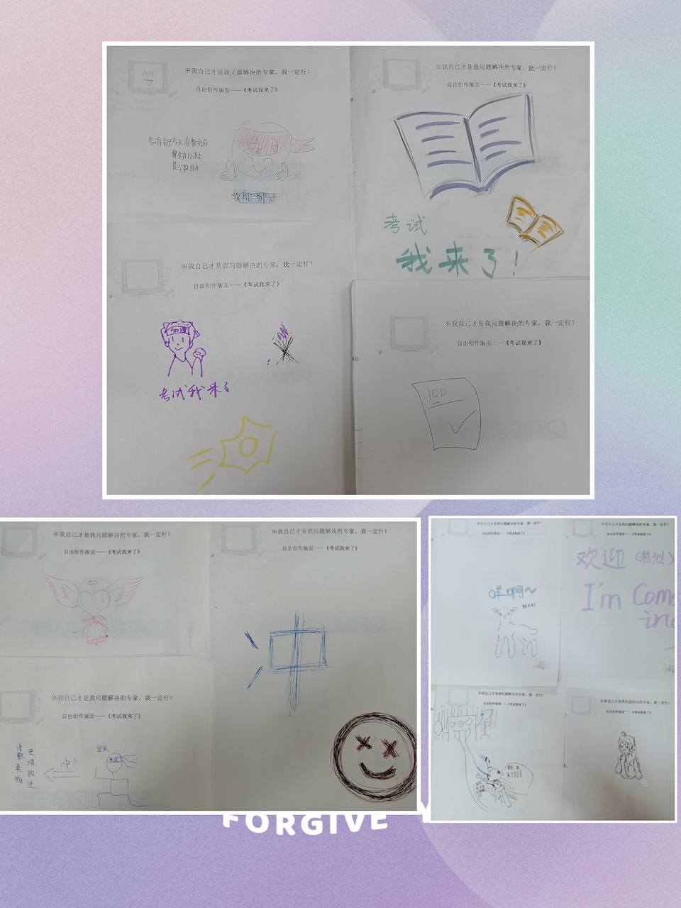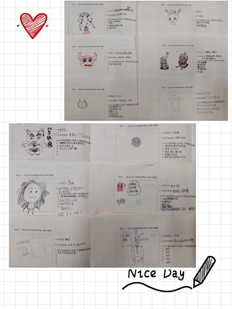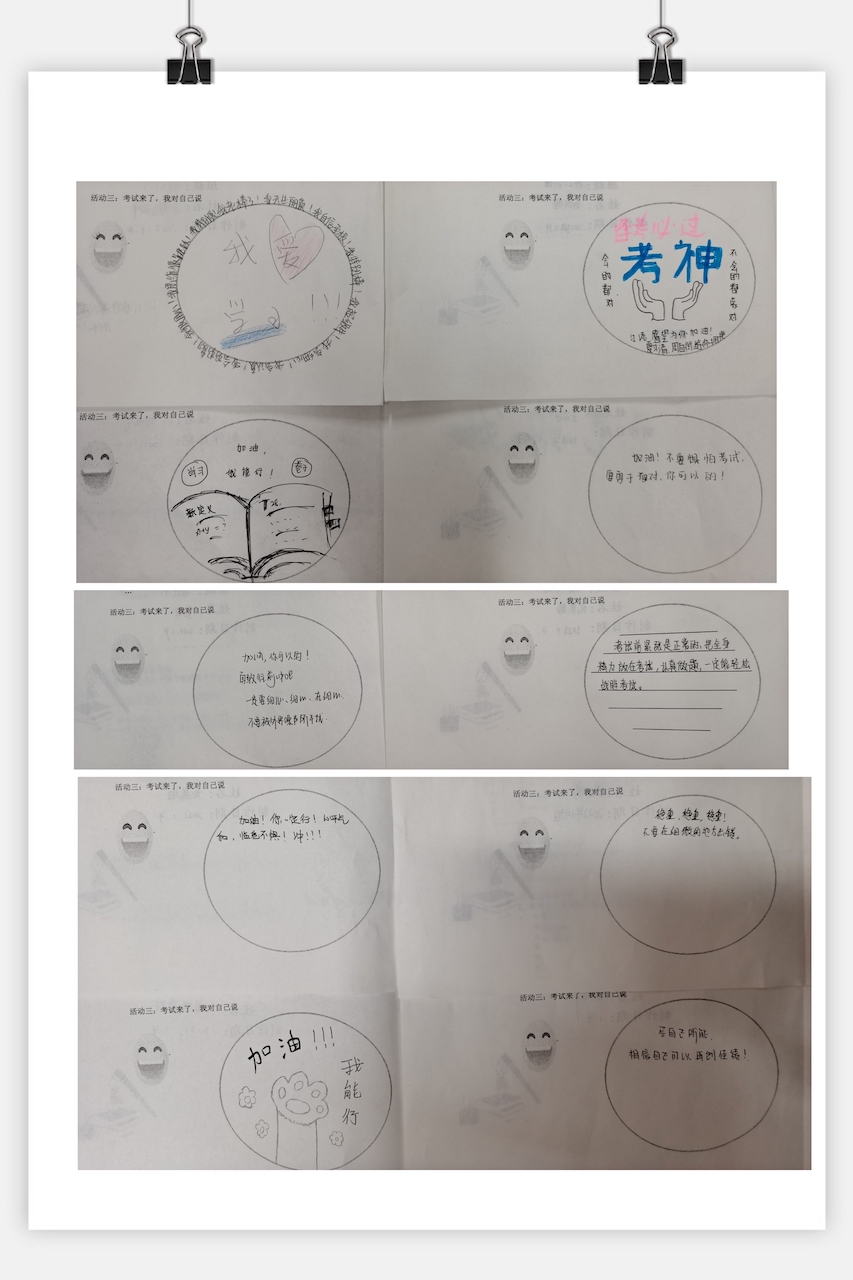 本次课程的内容包括:热身活动、考前助力宝典、学习经验交流、假期学生心理热线四个环节。通过手指操、绘画、经验交流等丰富的活动,学生正确认识考前的负面情绪,掌握一些调节情绪、舒缓压力的小策略、小技巧,激发学习潜力,增强信心,使学生能以积极阳光的心态迎接考试。通过活动学生体验积极心理暗示的神奇力量,调整心态,轻松应考。