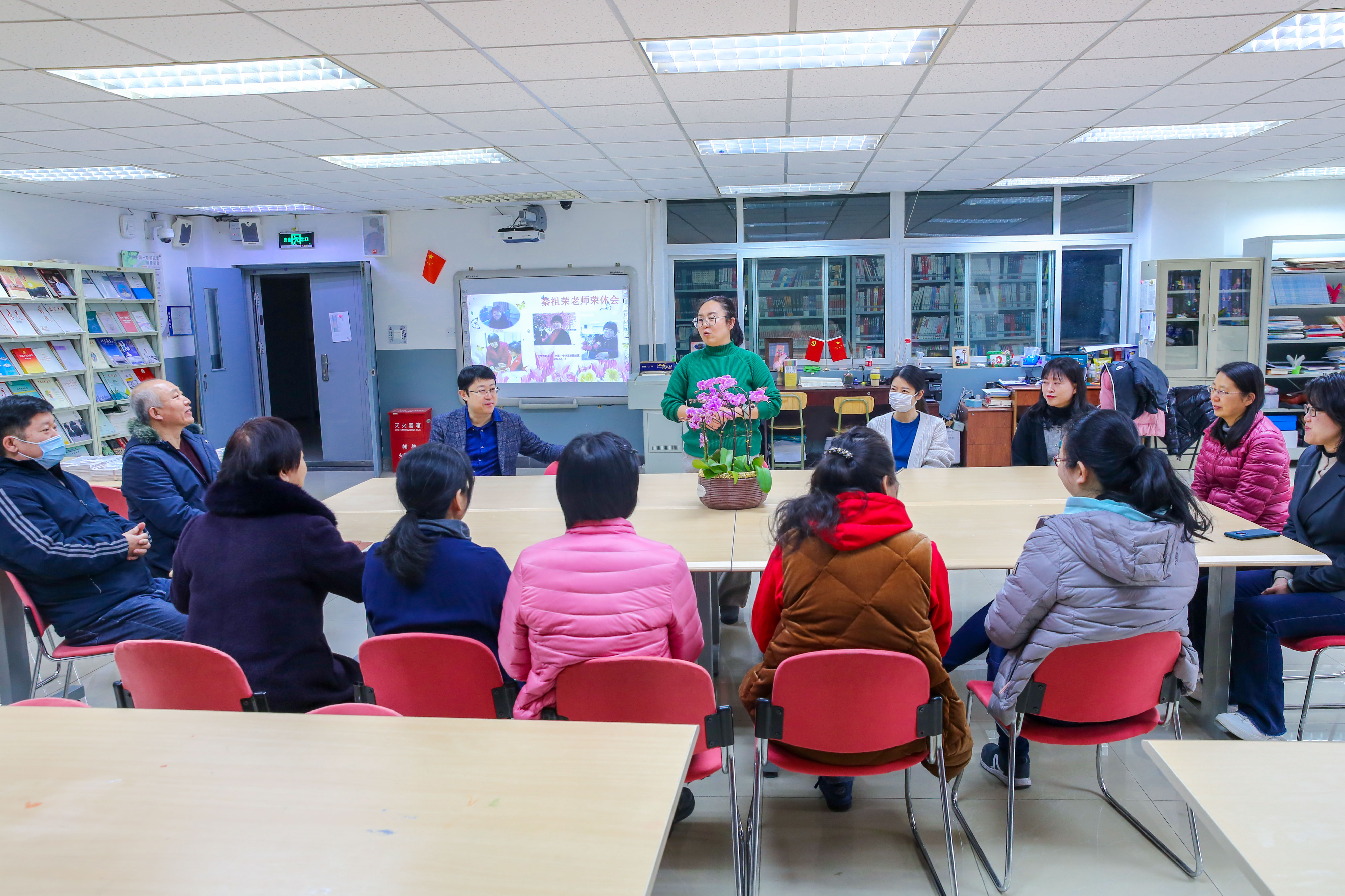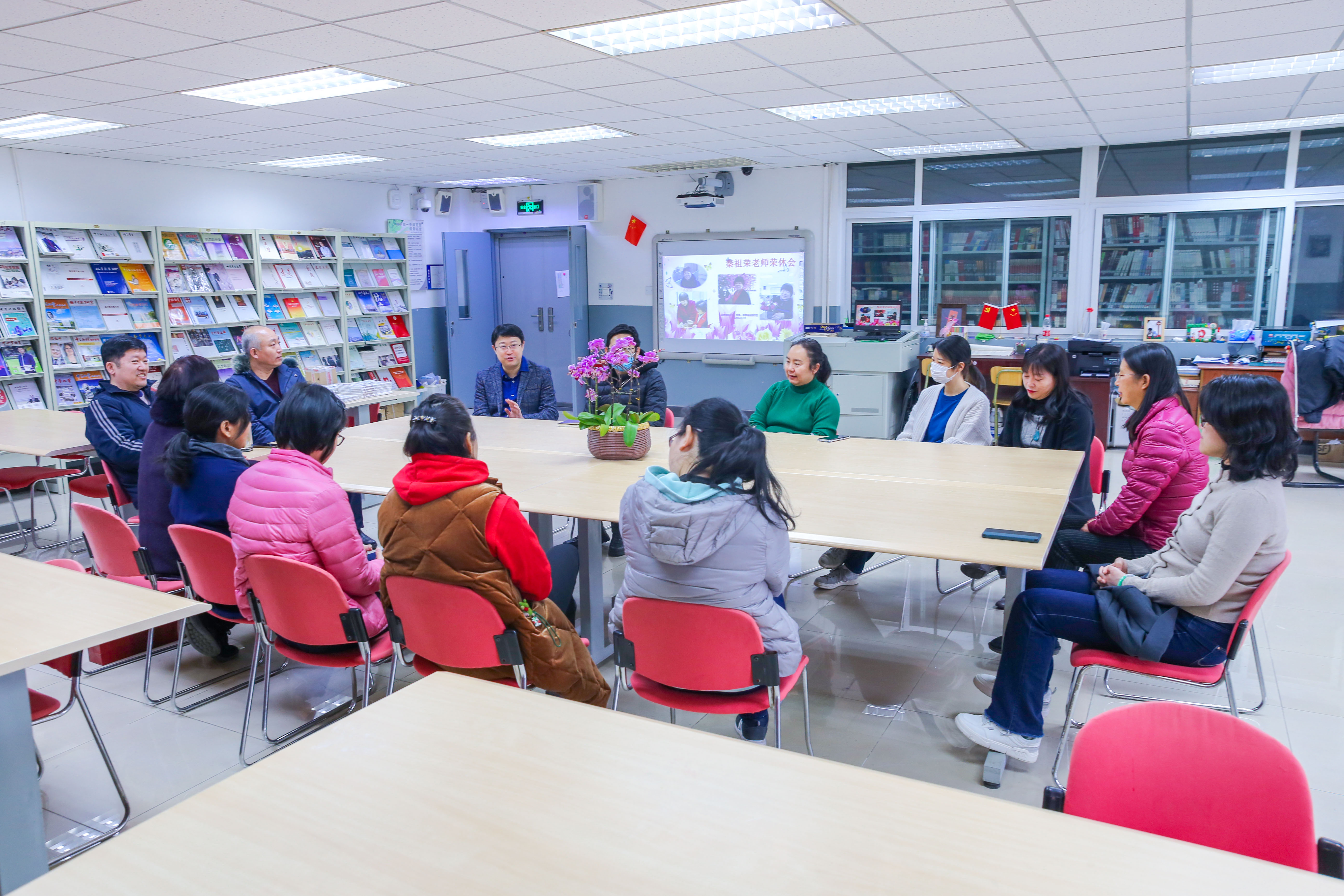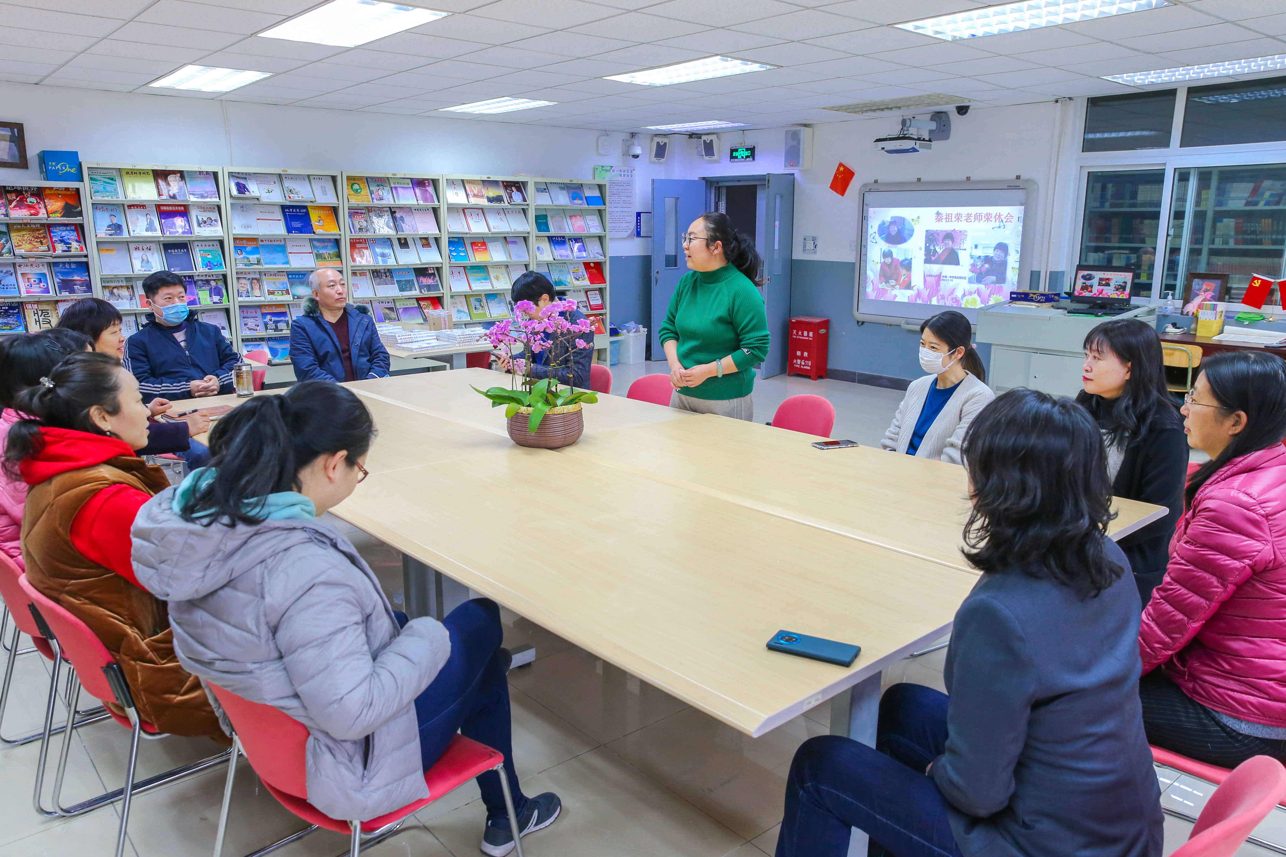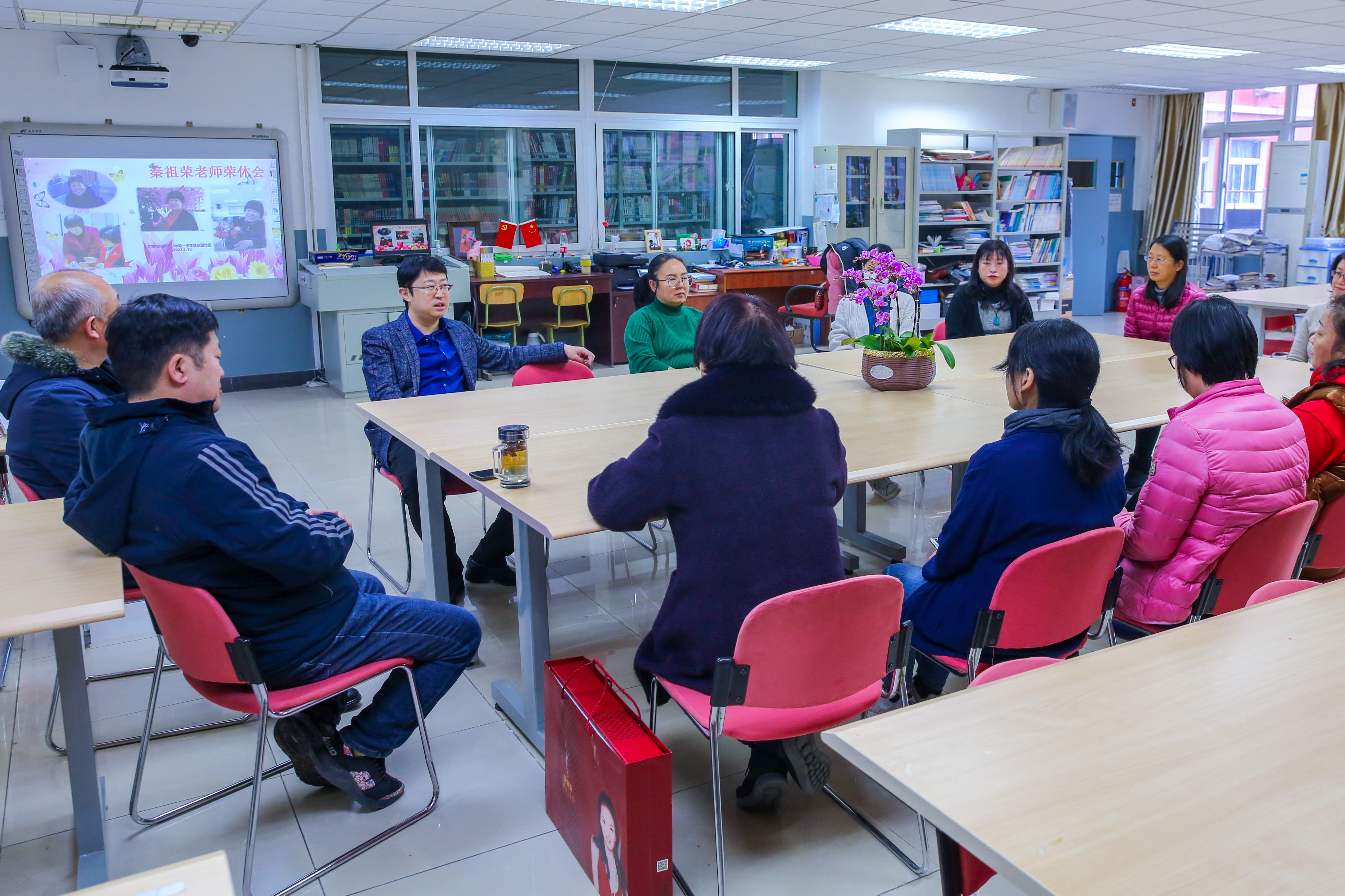 2022年1月18日上午,和平街一中莲葩园校区阅览室内笑语盈盈,温暖如春,退休教师欢送会正在举行。校区主管校长杜鹏、中层干部和全体教务处职员齐聚一堂,热烈欢送秦祖荣老师光荣退休。