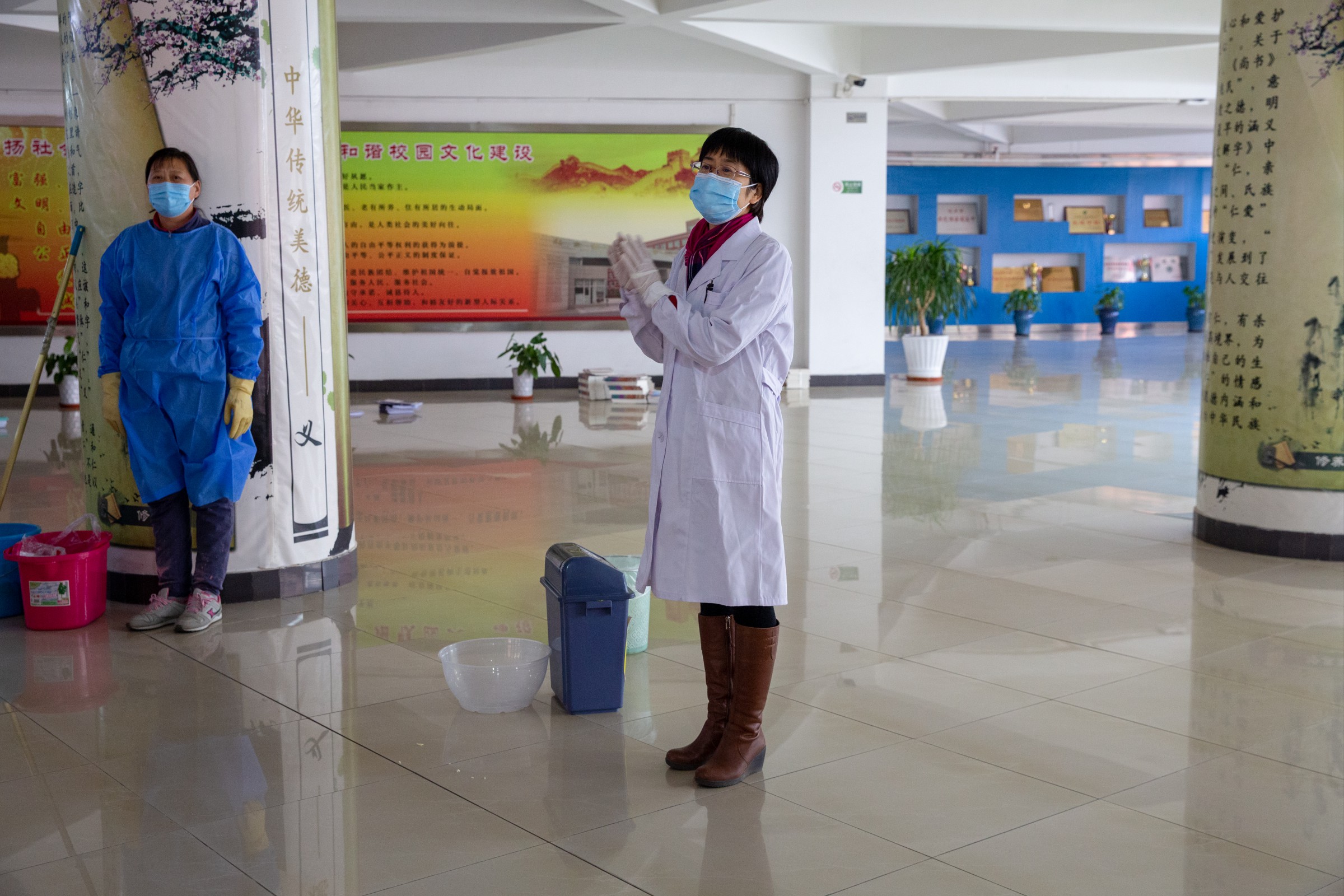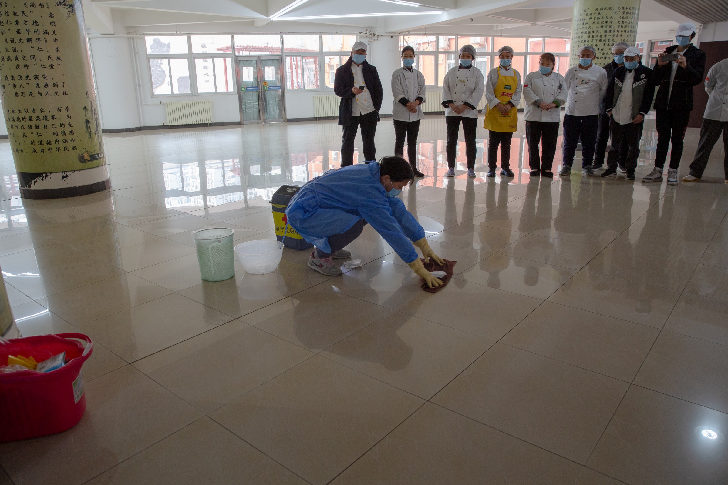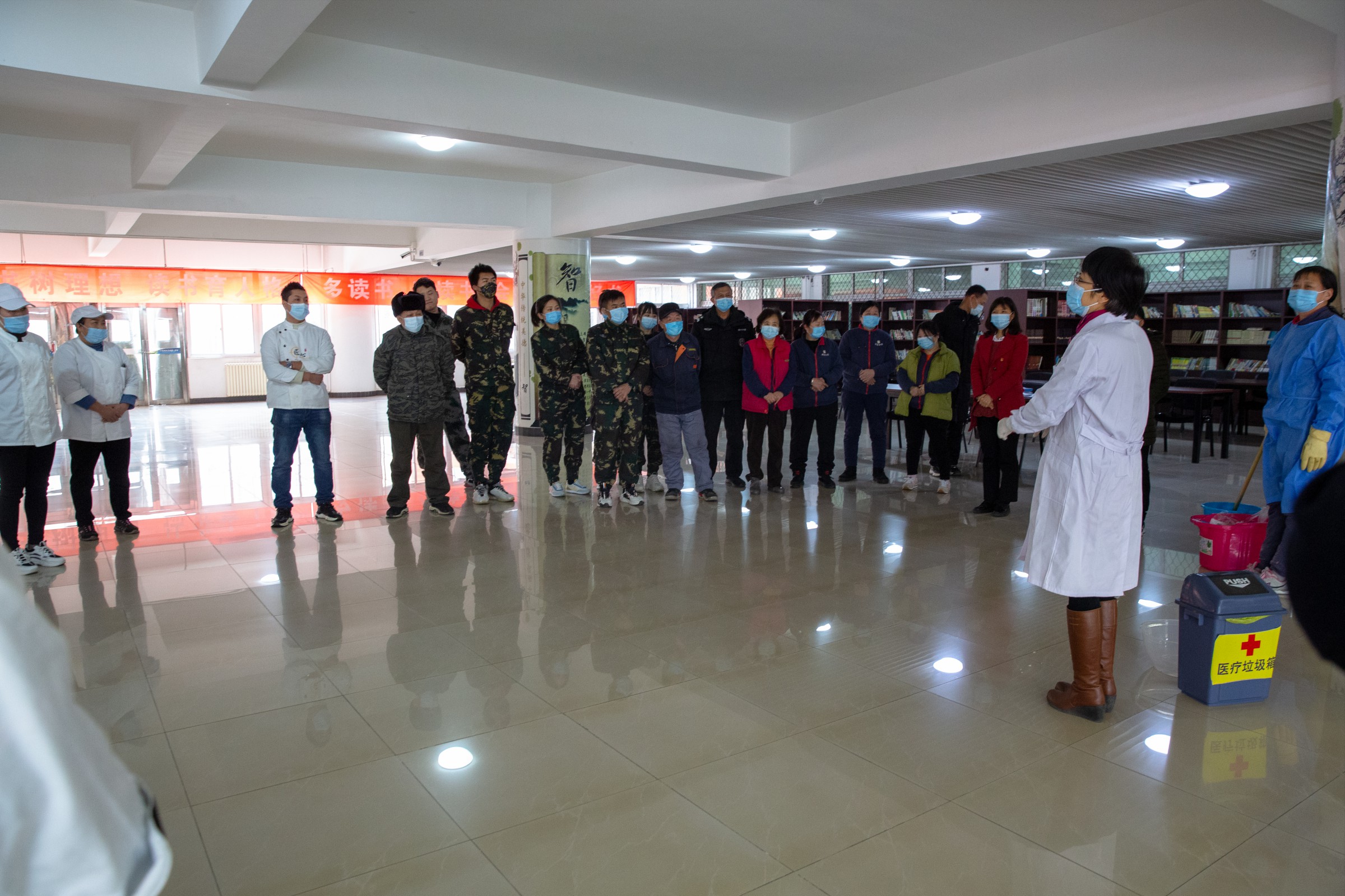 为普及传染病防控知识,防止传染病在校园流行播散,保障师生的身体健康和生命安全,在期末校内人员较少的情况下,莲葩园校区总务处组织食堂物业员工、宿舍管理教官、保安人员,在22年1月18日下午开展了一次传染病防控演练。