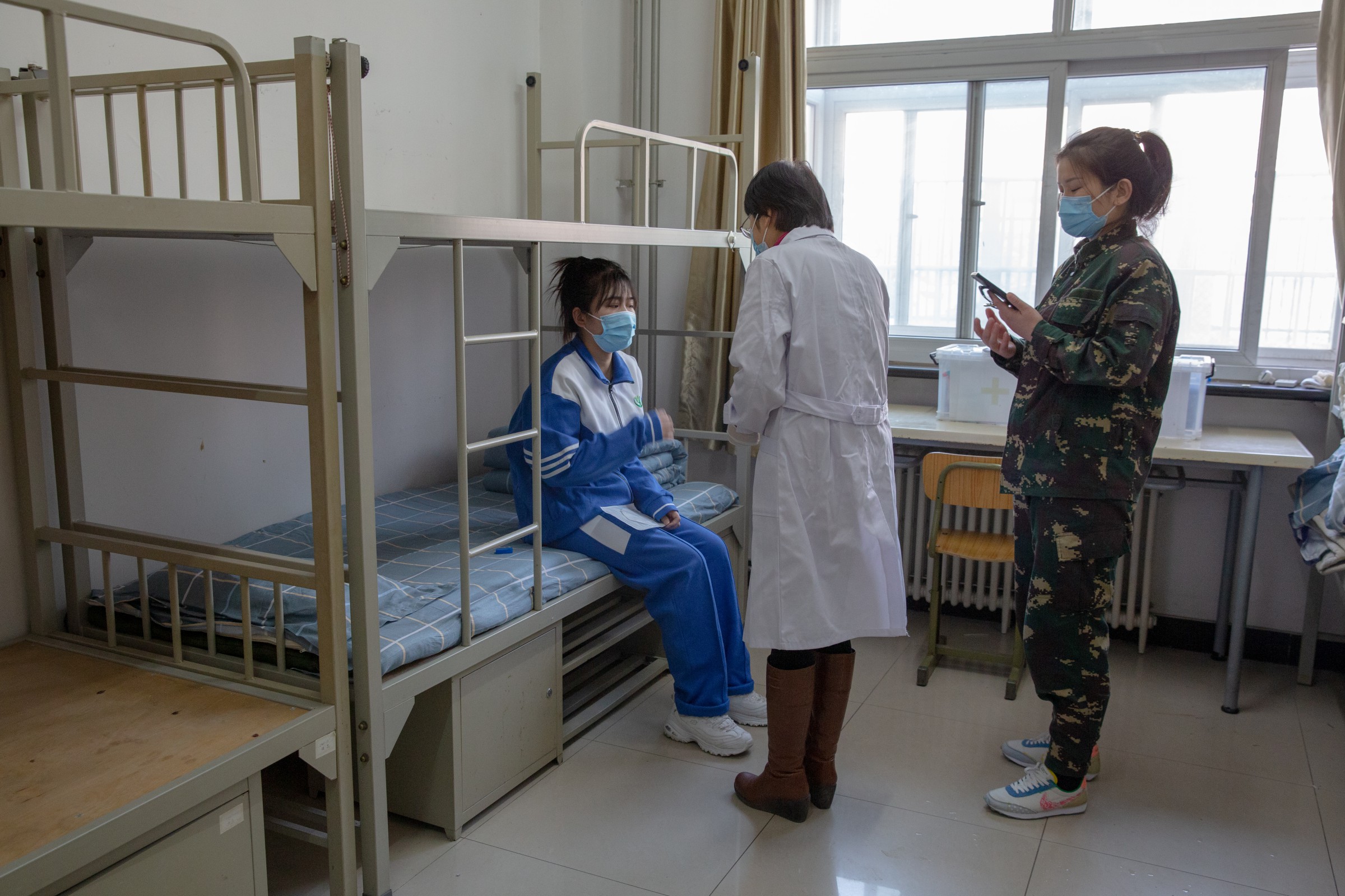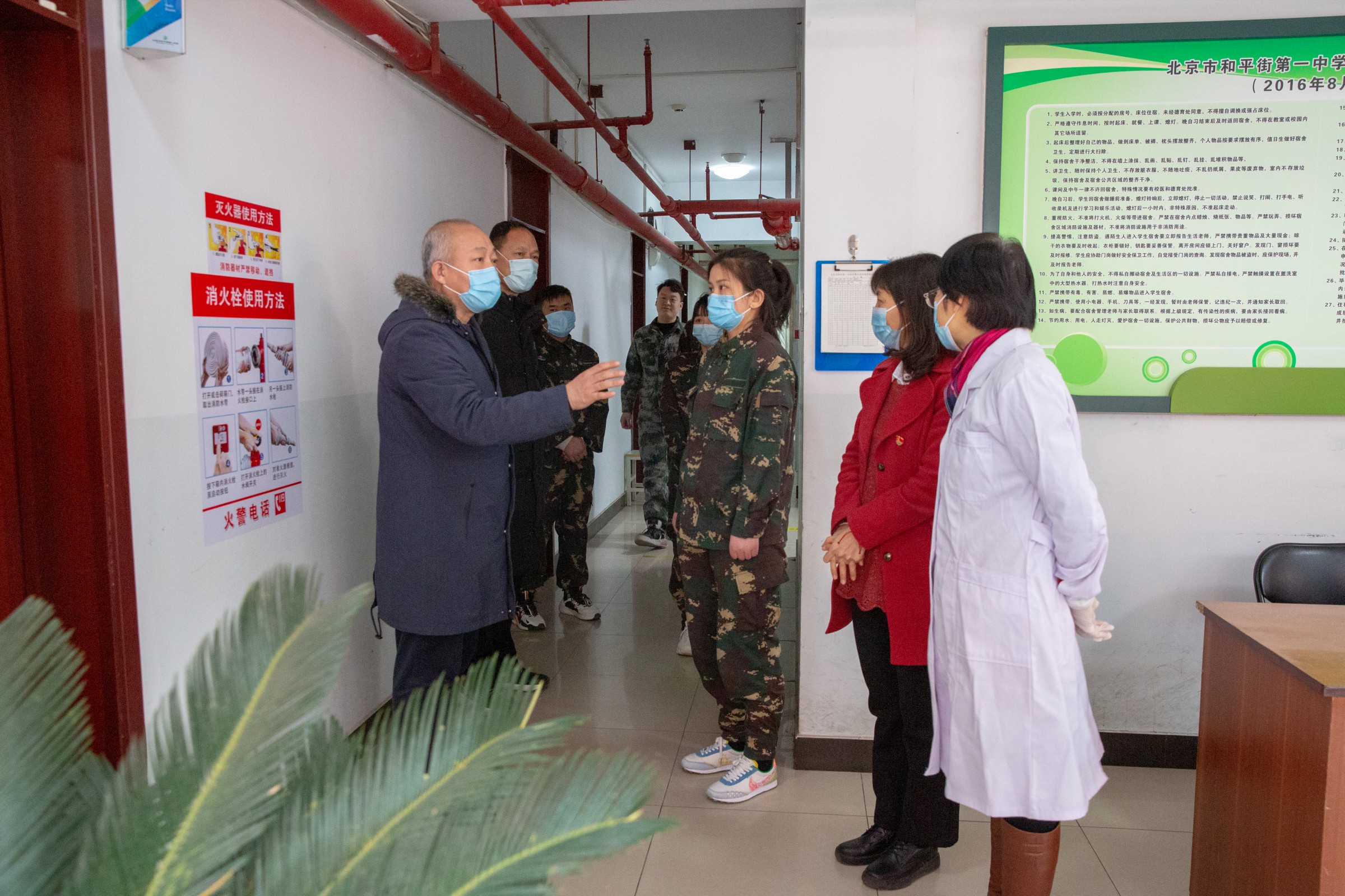 演练的第一项内容是模拟学生在楼道呕吐,物业员工及时到位、正确处理呕吐物的整个过程。张春伶大夫对处理过程进行专业点评,强调了容易忽略的细节部分,并就常见问题进行了现场提问,被点到的员工均能正确回答。演练的第二项内容是模拟内高学生在宿舍发热,教官、内派老师、校医及时转移学生、上报、处理的过程。