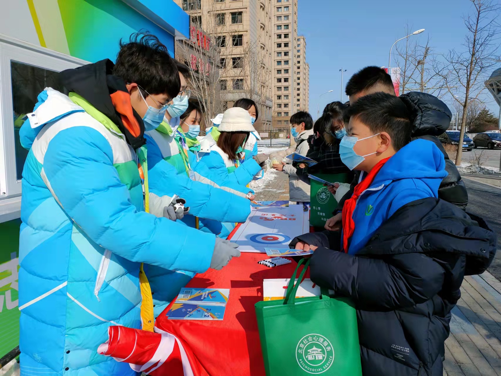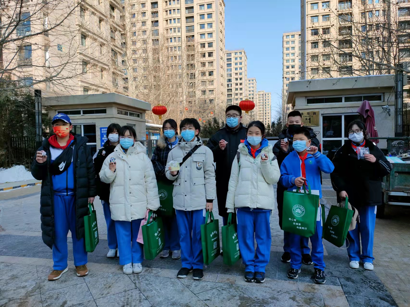 2022年2月15日元宵节,和平街一中奥运村校区学生代表和奥运村街道社会心理服务中心人员一起来到国家速滑馆,送给在寒风中执勤的志愿者们自制冰墩墩和“暖心加油包”,还送上元宵节温馨祝福。