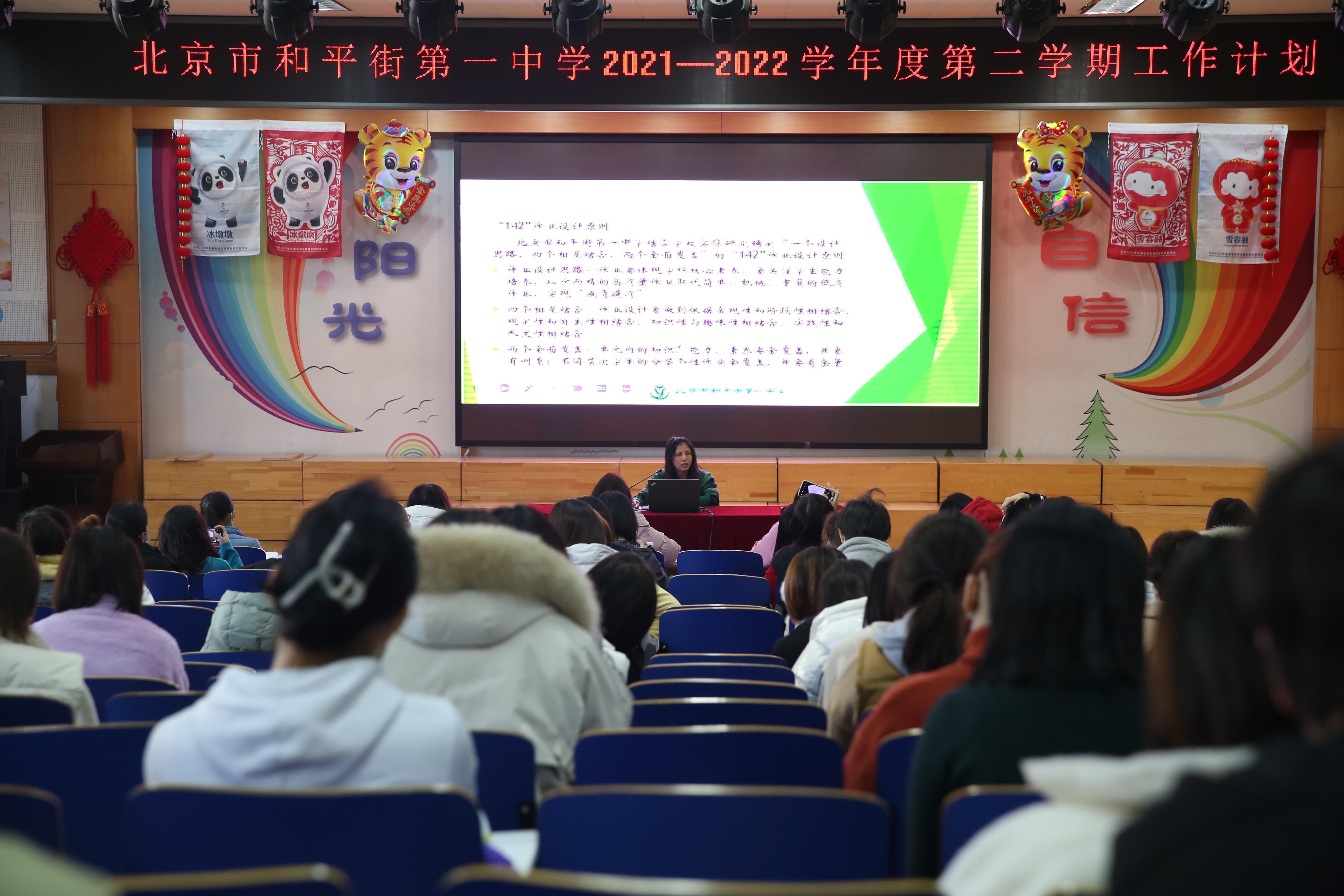 殷校长首先带领老师们认真学习了“北京市和平街第一中学2021-2022学年度第二学期工作计划”。她从学校整体的指导思想、工作思路、工作内容三方面入手,结合校区“双减”工作落实、校本课程特色、班级文化建设、教师发展目标,明确我校以“和美”“和健”“和创”课程为主要载体,围绕给定的教学质量目标做好教育教学工作,确保全校教学质量目标的达成,细致入微地为老师们做了详细地讲解,并提出新学期的新要求。