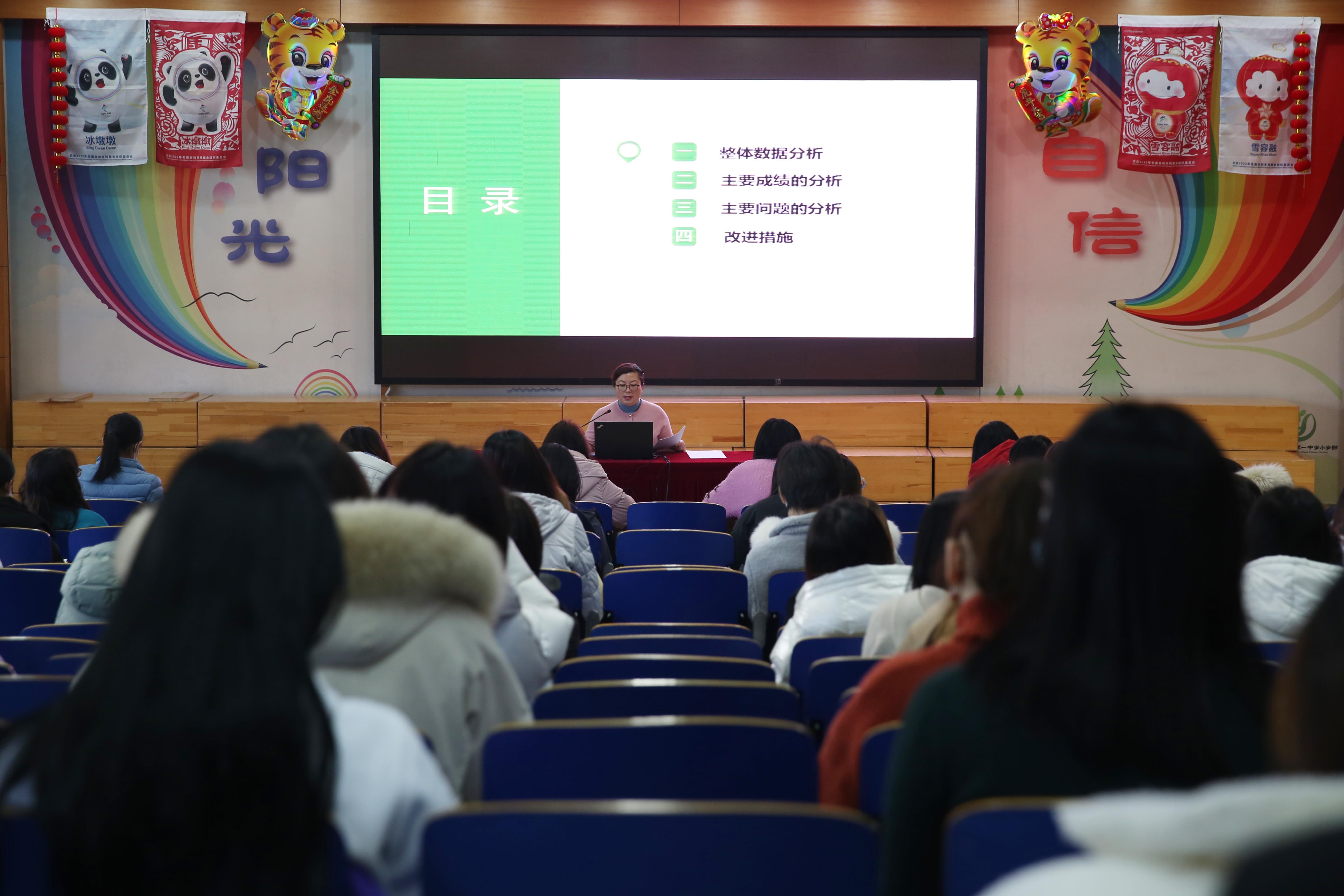 教导处马靖主任从学校层面做了2021——2022学年度第一学期的期末质量分析报告。她用具体的数据分学科、分年级对学生学业成绩测试情况进行了深入细致地分析,使老师们从不同层面,不同角度对教学情况有了清晰地了解。在对教学成绩进行分析的同时,也指出了当前教学中存在的问题,提出了解决问题的方法,并希望老师们抓住自己身边的每一个学习机会,把教育教学工作做出特色。