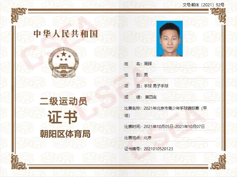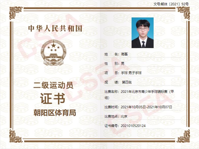 2019 级手球队队长、朝阳区手球队队长