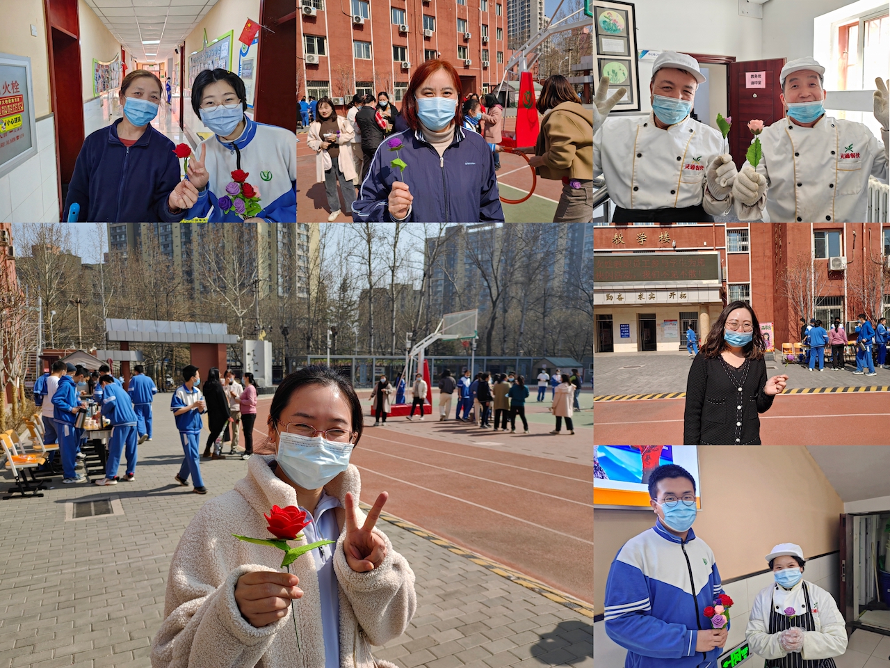3月8日上午课间操,全校学生在操场上送上“成语串烧”的花式祝福,为女性教职员工带来欢乐与感动。中午,初一初二学生会同学精心组织了午间游艺活动以及“品茶会”,并为全校的教职员工送上一朵小花,带去节日的祝福,整个活动充满了欢声笑语。下午,我们组织各班代表,前往和平东街社区以及光熙门地铁站,为女性工作人员,送上节日的祝福。同时,我们还为守护我们平安的武警战士送上了学生的亲笔信《致敬最可爱的人》以及手工花篮,表达了全校区学生对武警战士的感谢。