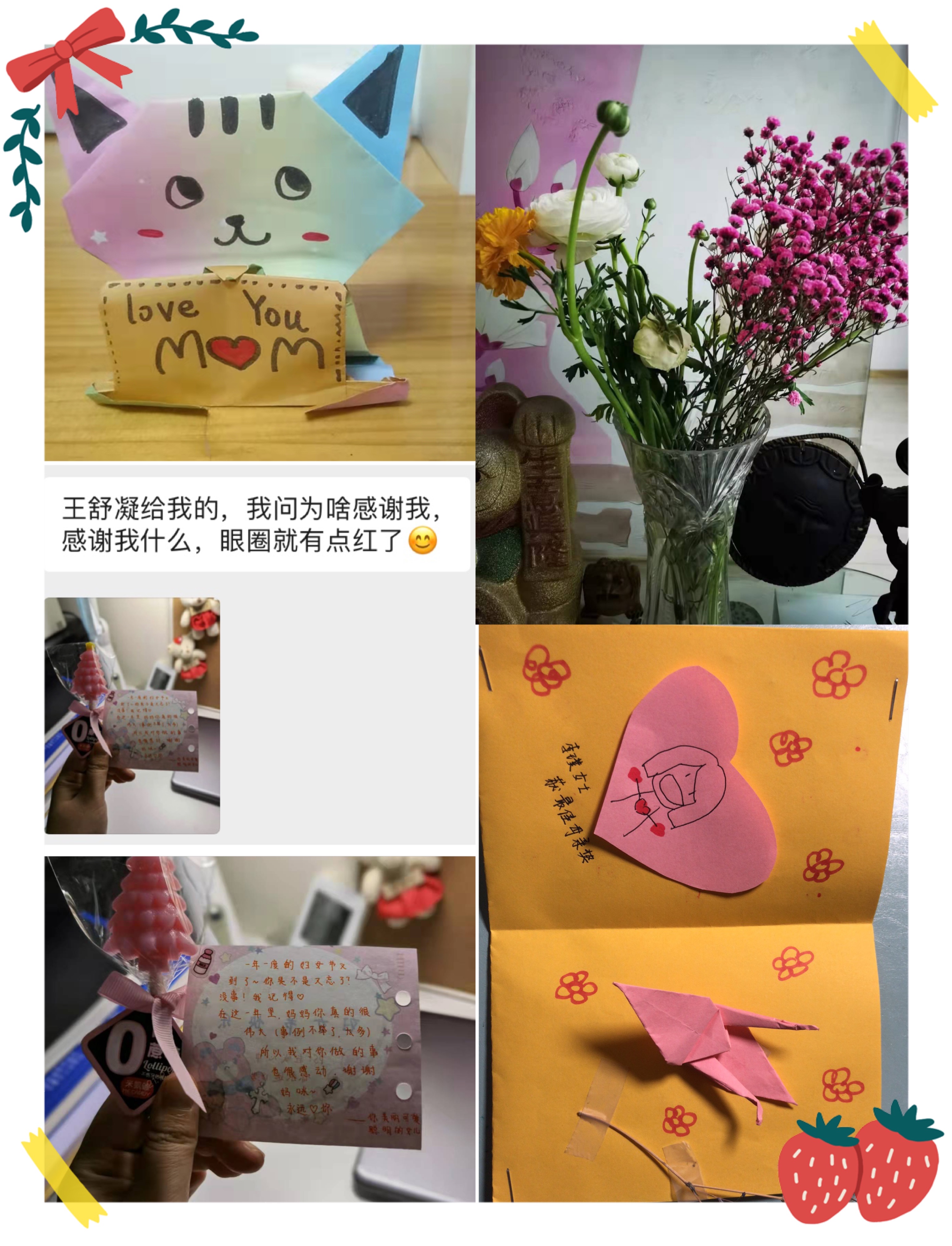 节日前后,同学们纷纷行动起来,有的同学给家里的女性长辈献上美丽的花束;有的同学为妈妈泡了一杯暖心的热茶或为她们揉揉肩按按腿,帮助她们缓解一天的疲劳;有的同学为妈妈制作了精美的节日卡片,为她们送上了温暖的祝福。在学校,同学们也通过贴心的祝福、认真完成作业、上课认真听讲、尊重老师、制作手抄报等形式表达对女性老师的感恩,初二年级的同学们还为老师们亲手制作了千纸鹤。