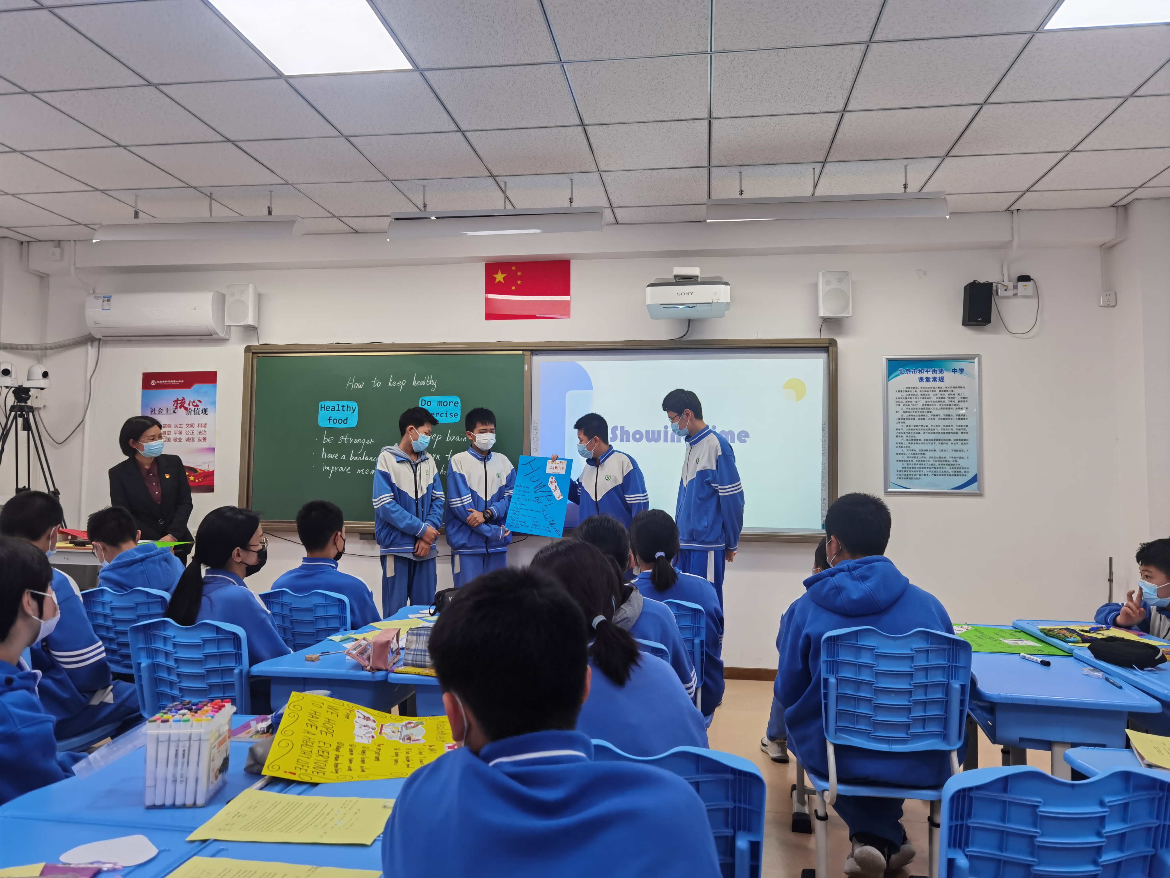本次教研活动分为课堂教学观摩,授课教师说课和专家点评指导等多个环节。奥运村校区王珊珊老师为老师们带来了一节精彩的初二英语听说研究课《How to keep healthy》。本节课整合了七上M4 Healthy Food 和八下M4U2 Healthy Living的话题,是一节关于“卫生与健康”的复习课。为了提升学生的听说能力,王老师深入分析听力文本,对听力材料进行了细致深入的解读。在活动设计方面,老师以学生为中心,组织了课前演讲、思维导图绘制和海报制作等形式多样的活动,调动学生参与课堂活动的积极性。王老师还根据学情,设计了A、B层的学案,让不同层次的学生都能够根据自身情况,主动选择适合自己的学习活动。这节课也充分激发了学生听的兴趣,培养了听的能力,拓展了学生的思维,增强了学生的信心,具有很强的示范性。