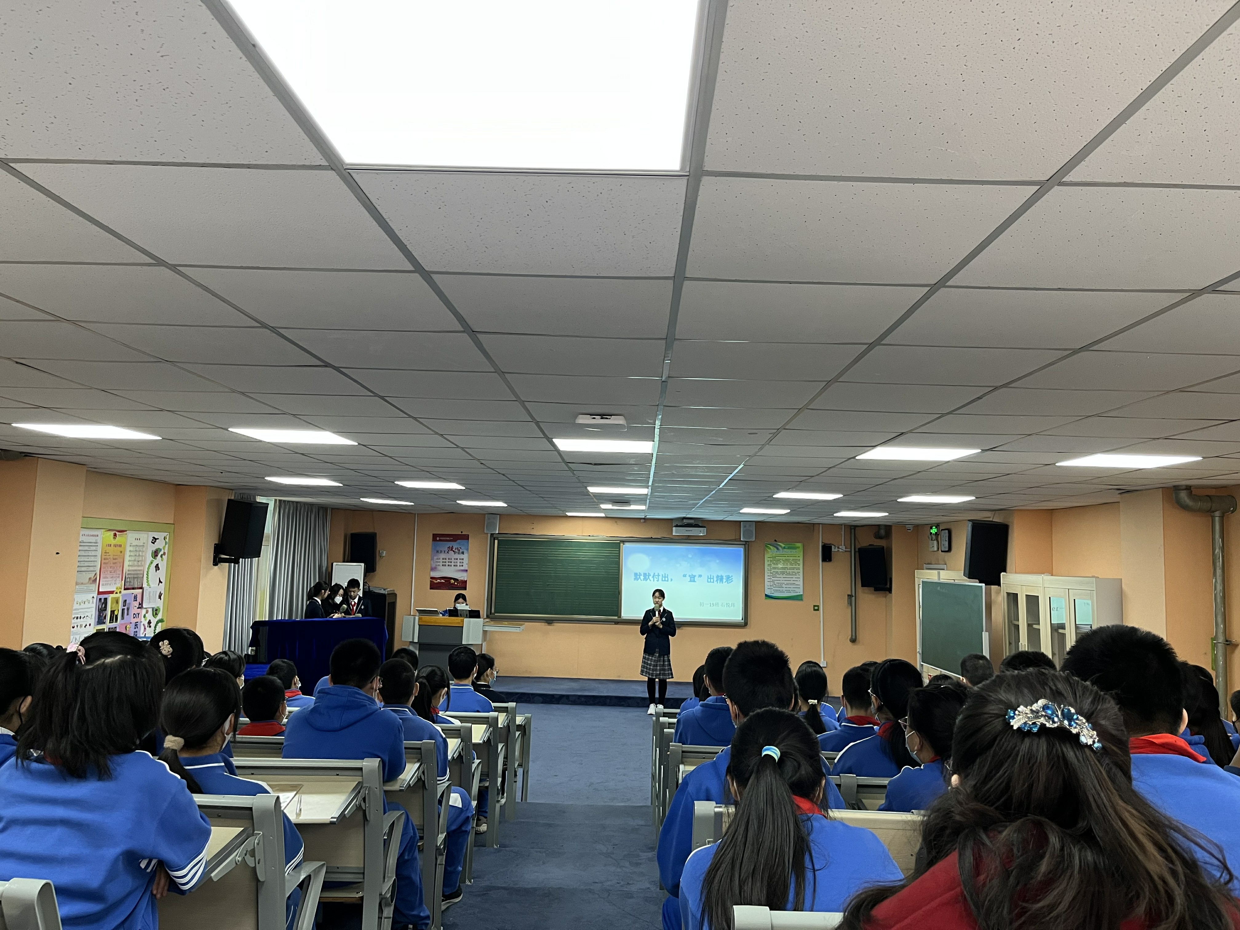 会议的第二部分是班干部代表工作交流和分享。宣传委员代表初一19班石悦晖展示他们为年级和班级文化建设 “宣”出的精彩;卫生委员代表初一20班冯丽文倡导“净能生美”,并呼吁全体同学保护校园环境;学习委员代表初一21班王小蔓期盼同学们用“心”学习,“和”出精彩,努力在学习中变得更加优秀。体育委员代表初一22班司马名芳鼓励同学们强身健体,积极锻炼,克服惰性,增强自身的体质。