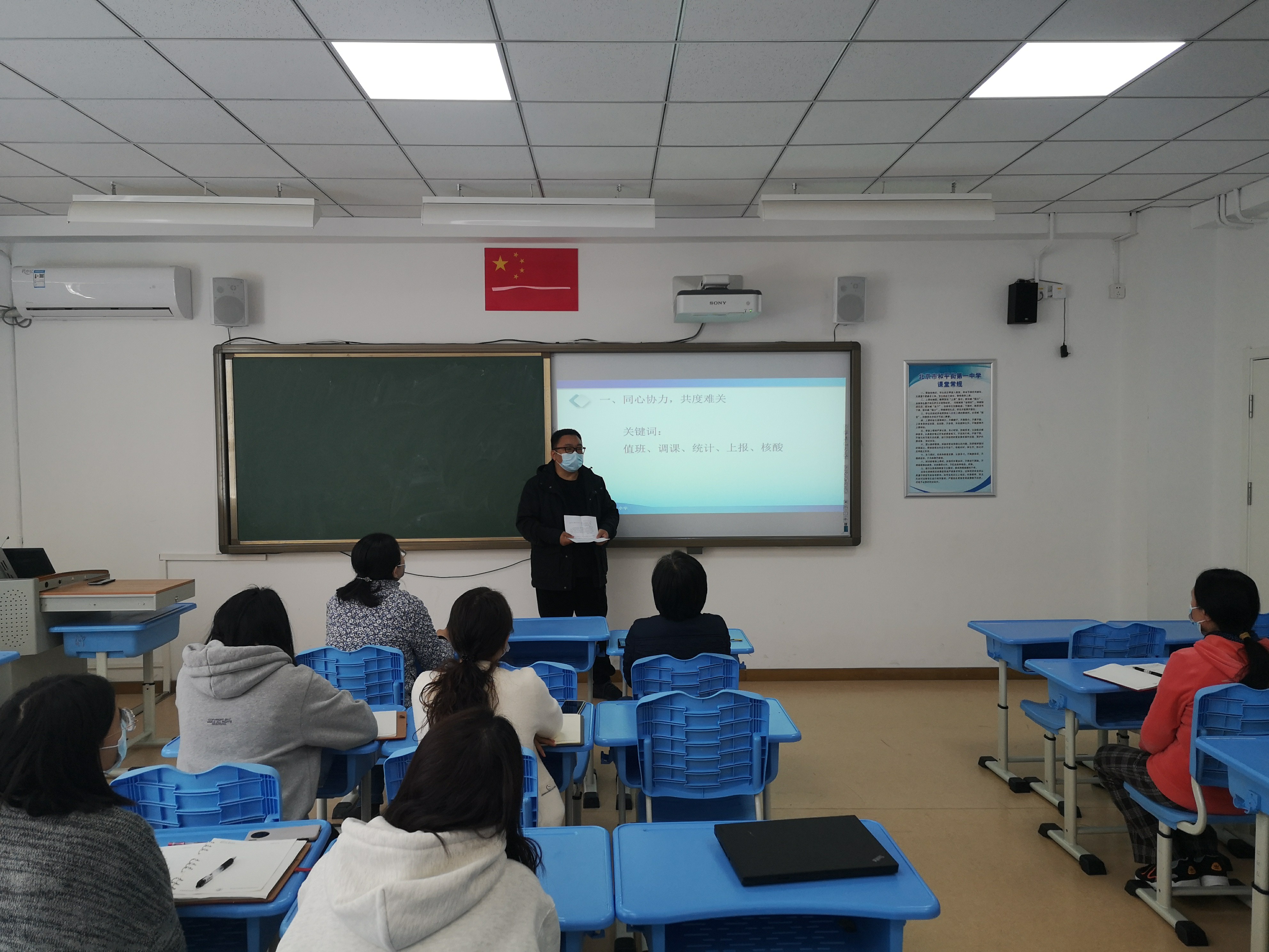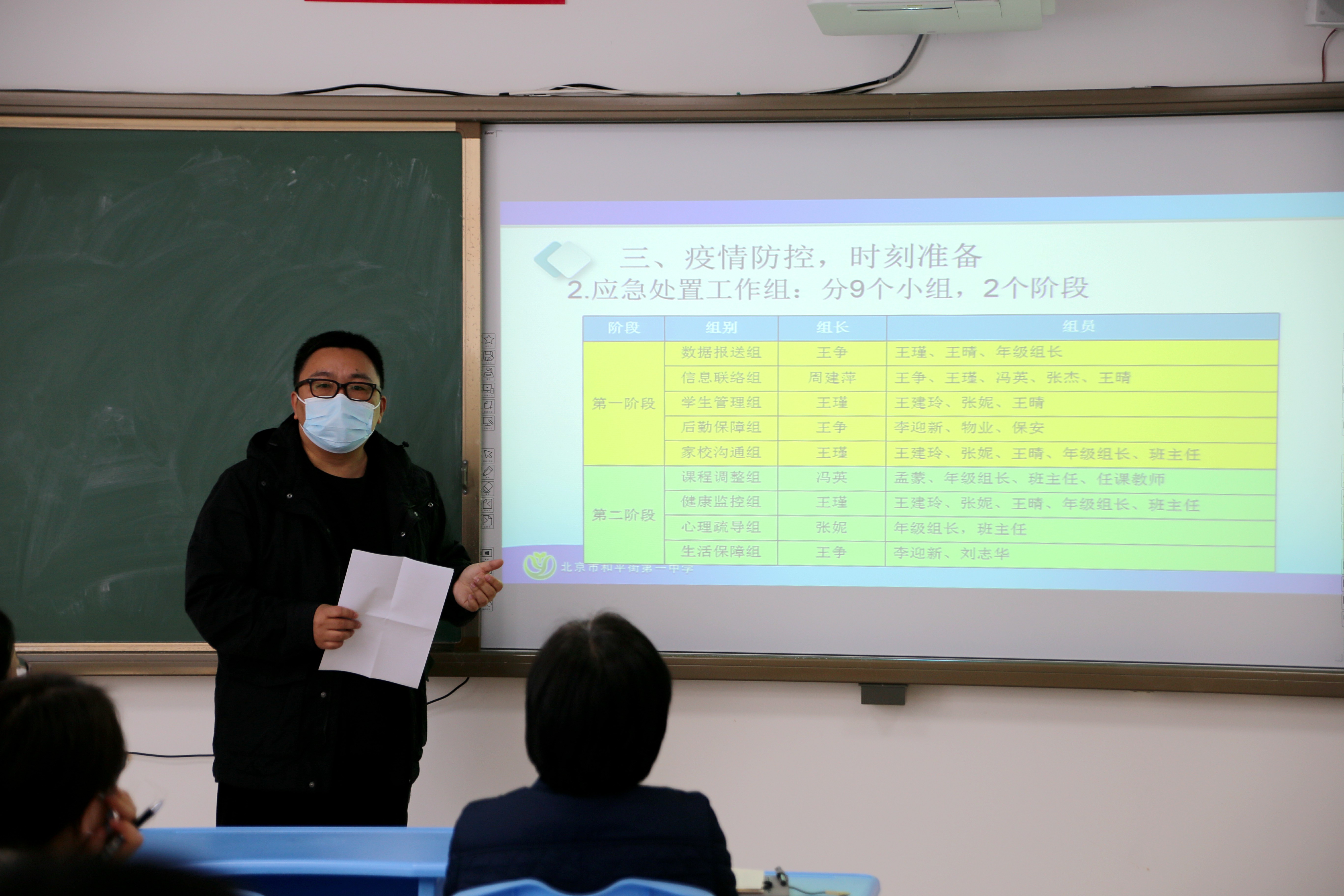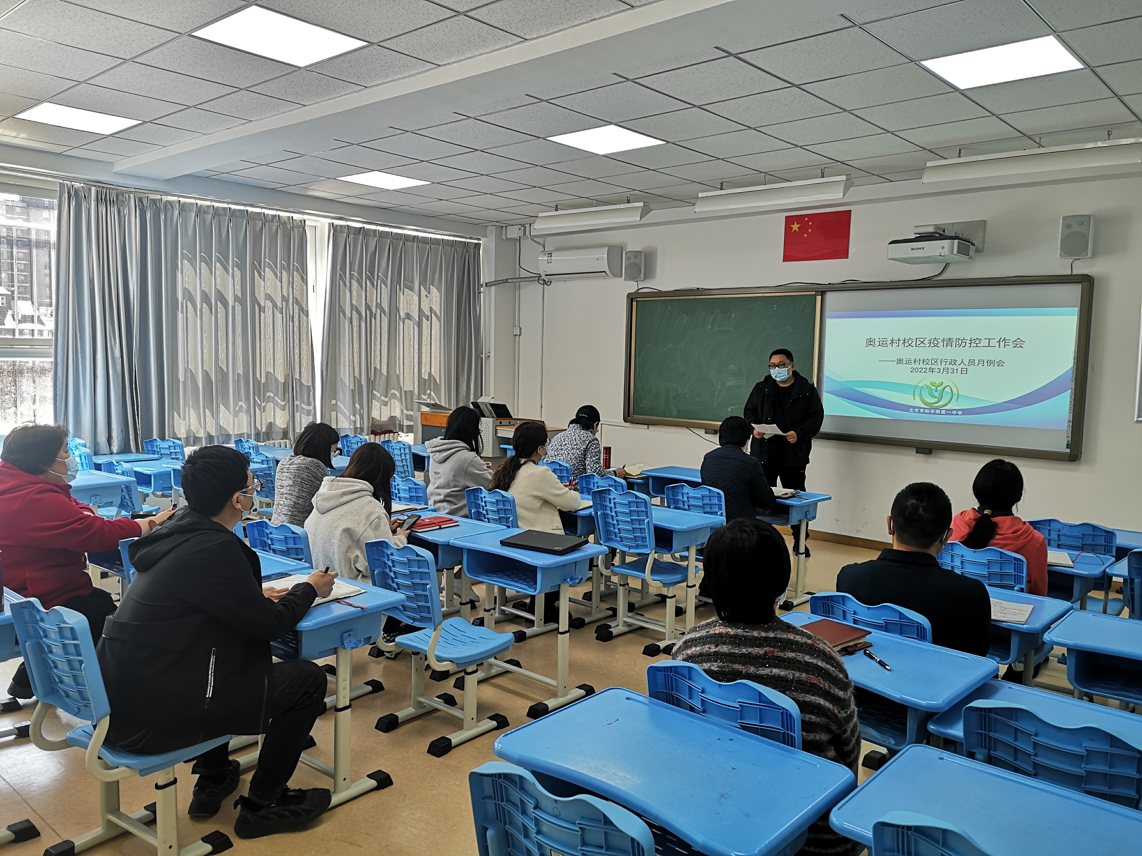 在会议上王争主任首先对开学以来的工作给予了肯定,面对疫情带来的复杂形势大家同心协力、配合得当,各项工作稳步开展。随后提醒大家注意常规工作中的新变化、加强沟通和各部门的配合,加强日常巡视和检查、发现问题要立即纠正。之后,王争主任重点解读了奥运村校区疫情防控的应急处置的工作流程,进一步明确了人员分工和责任,希望老师们各司其职,各尽其责,确保将疫情拦在校园外。