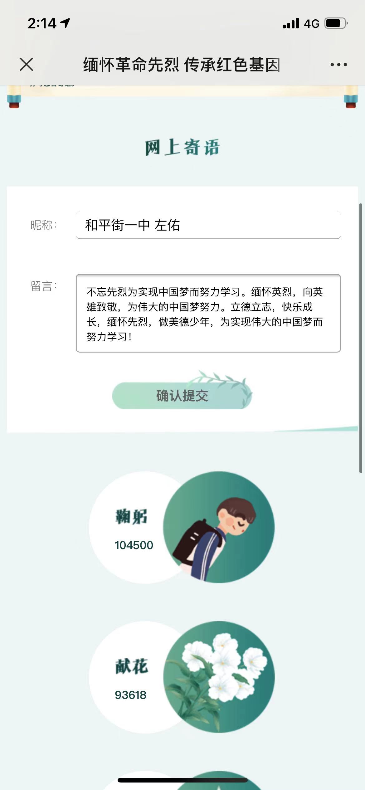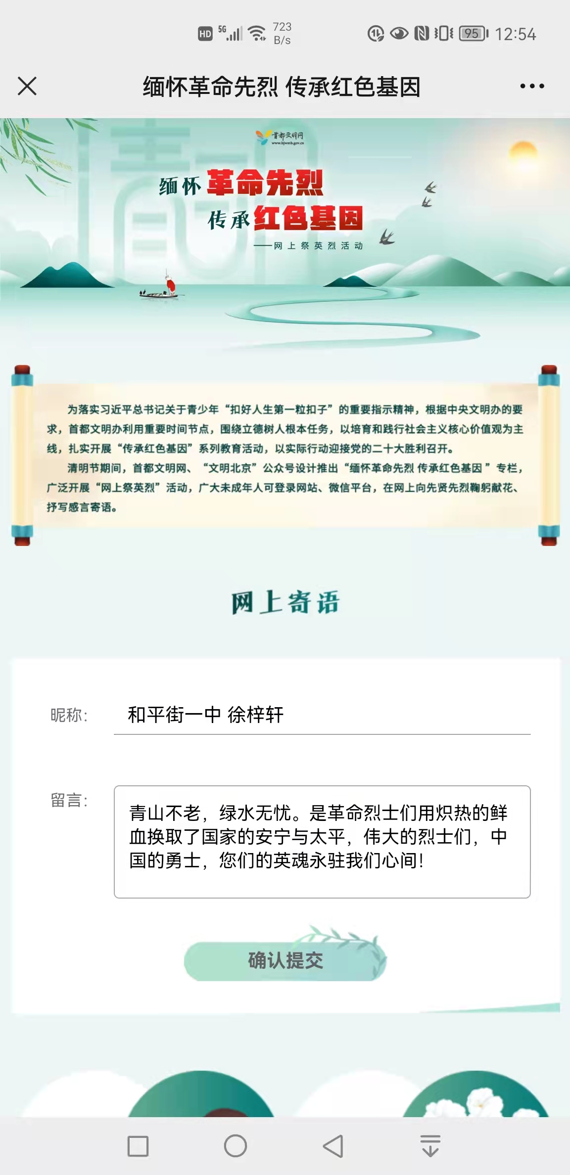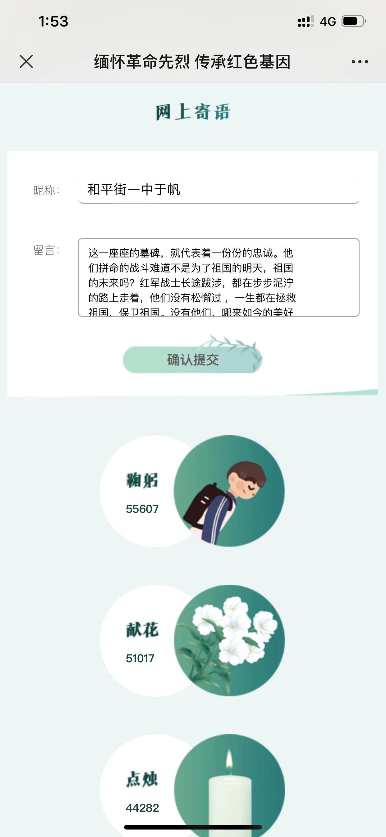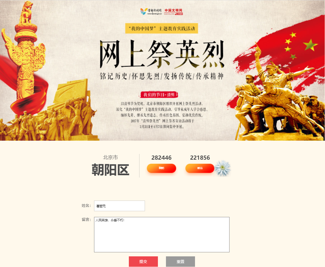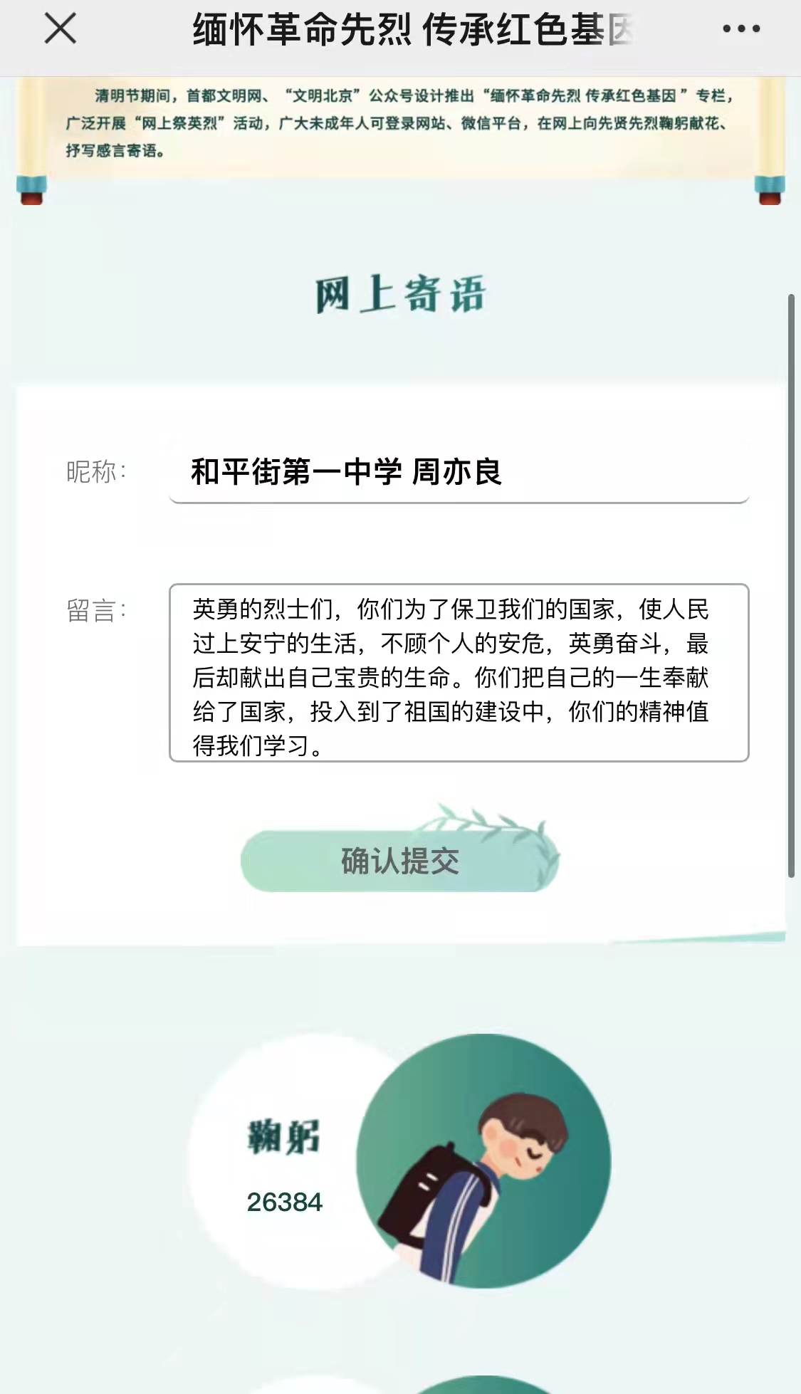 全体师生还充分利用网络平台,积极参与网上祭英烈活动,为烈士拭一遍墓碑、敬献一束鲜花,抒写感言寄语。