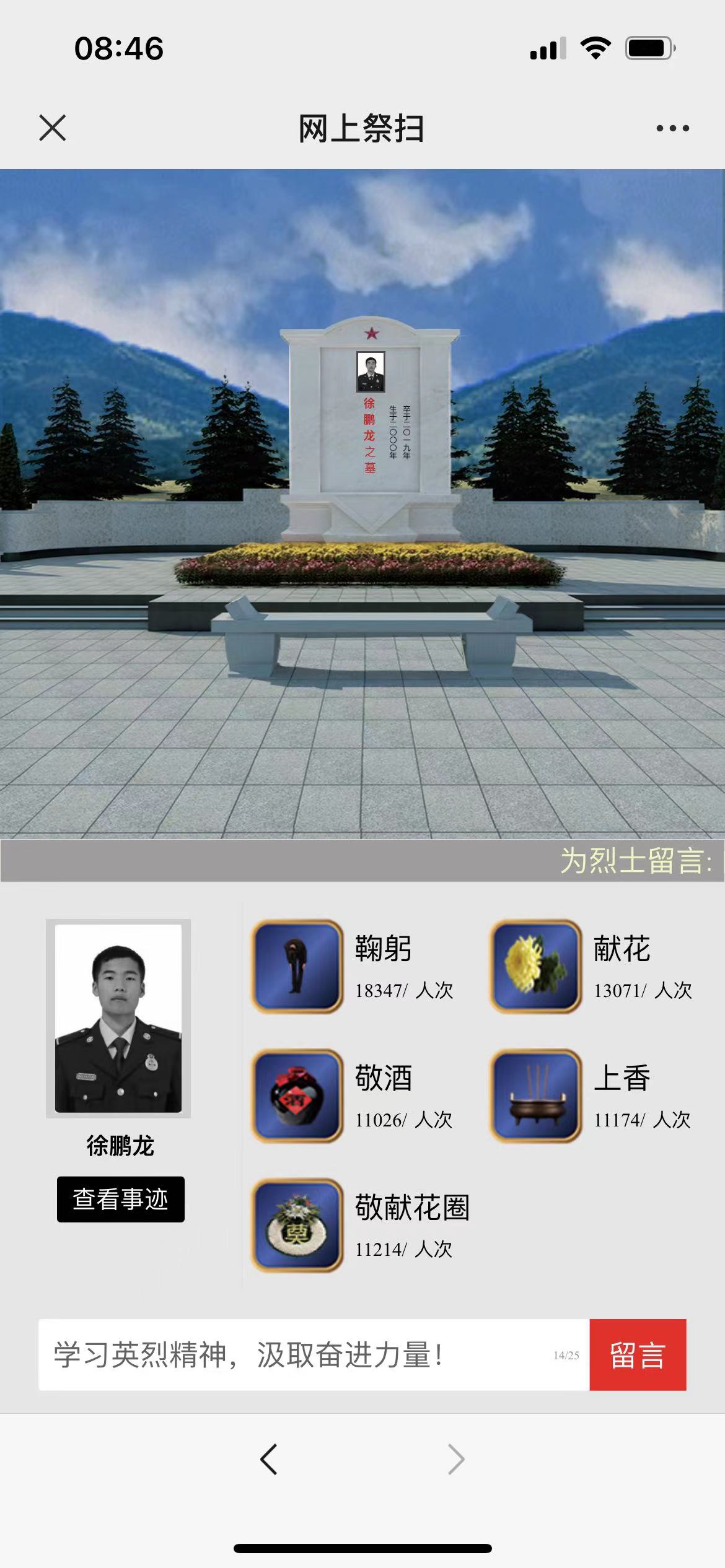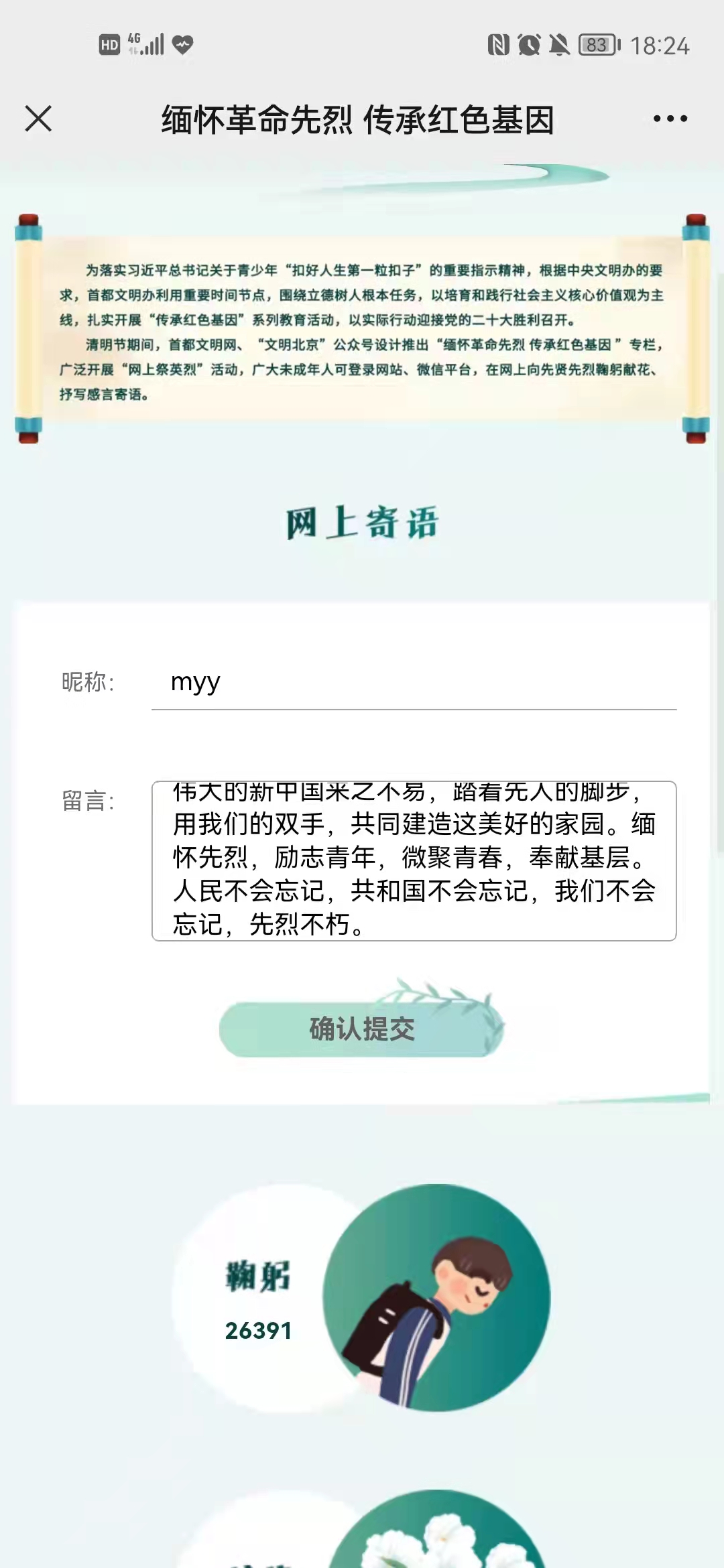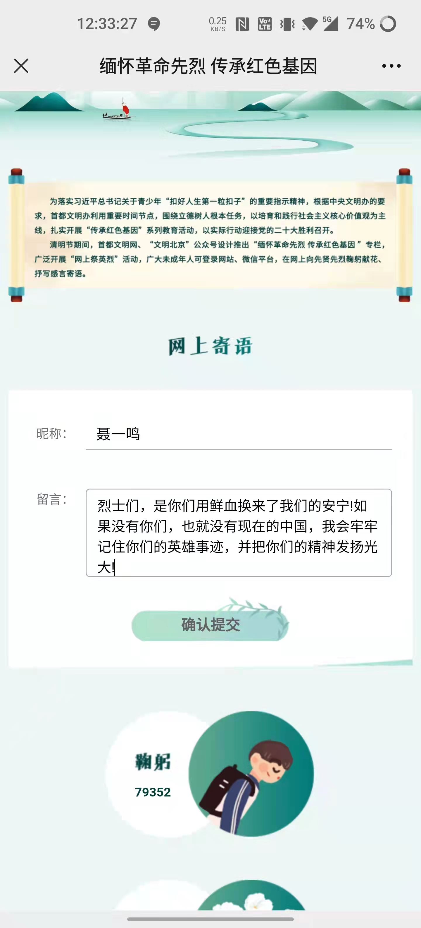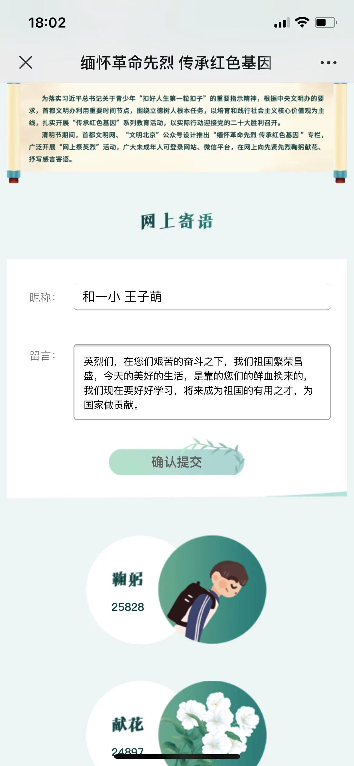 全体师生还充分利用网络平台,积极参与网上祭英烈活动,为烈士拭一遍墓碑、敬献一束鲜花,抒写感言寄语。