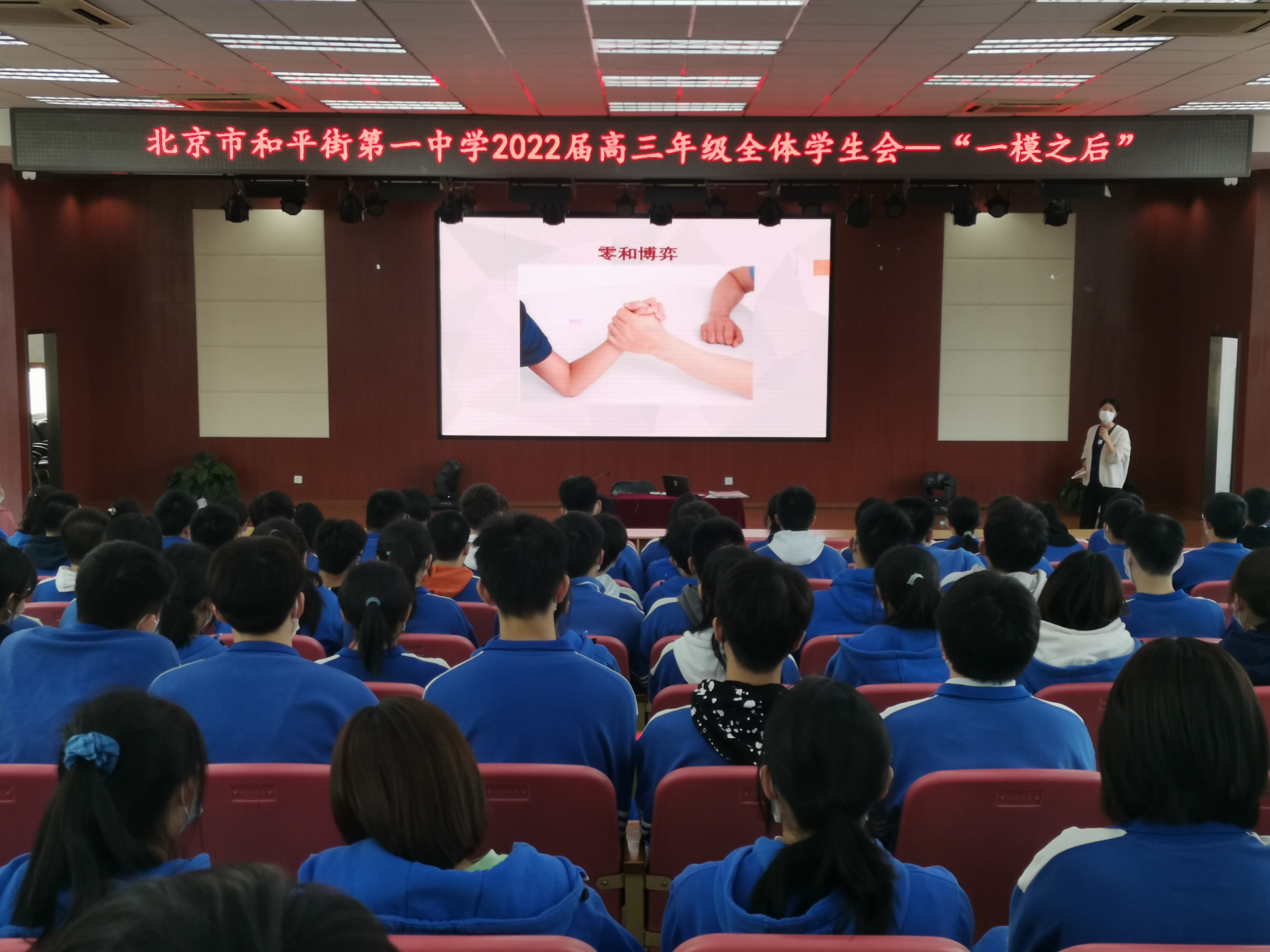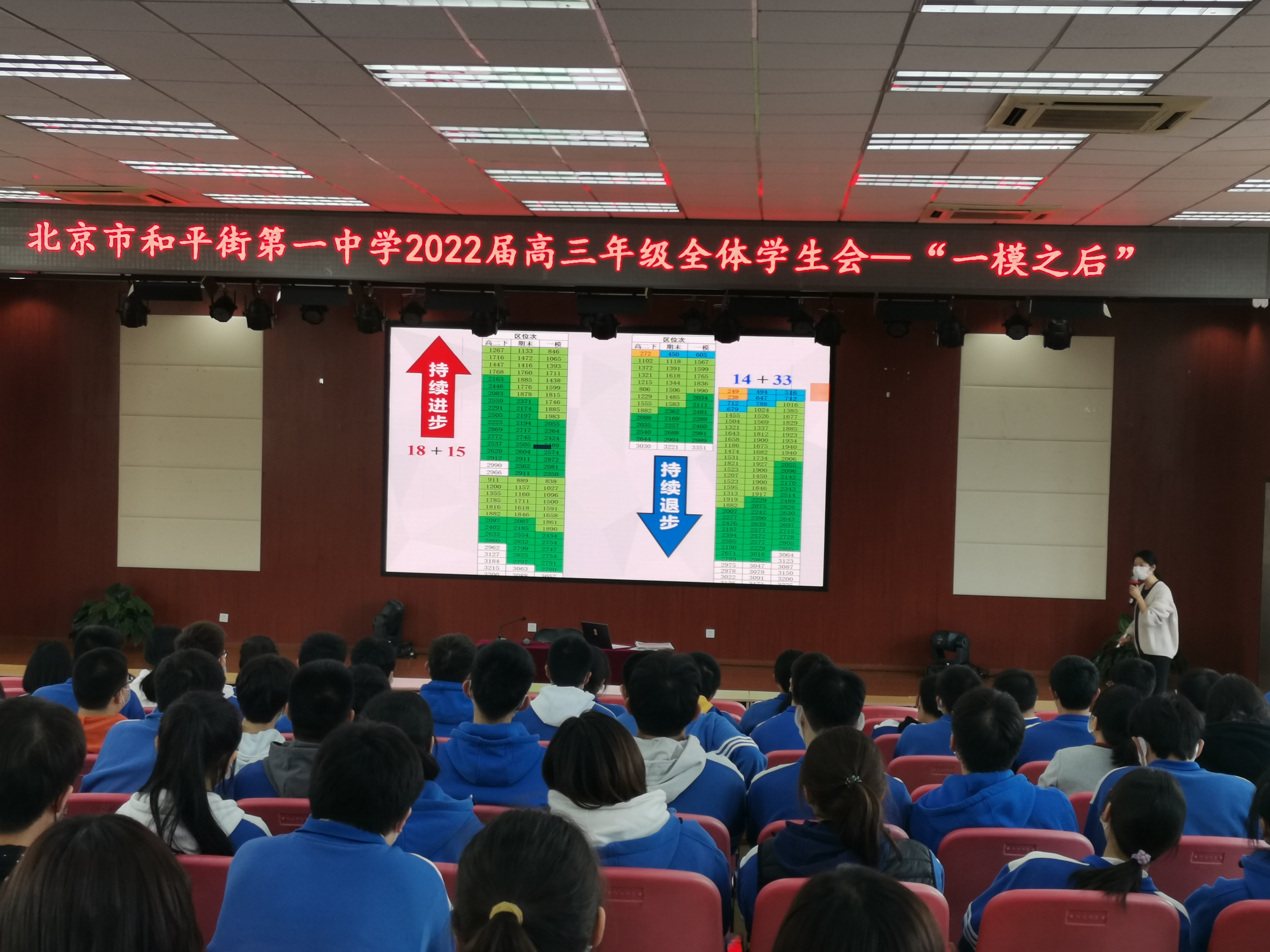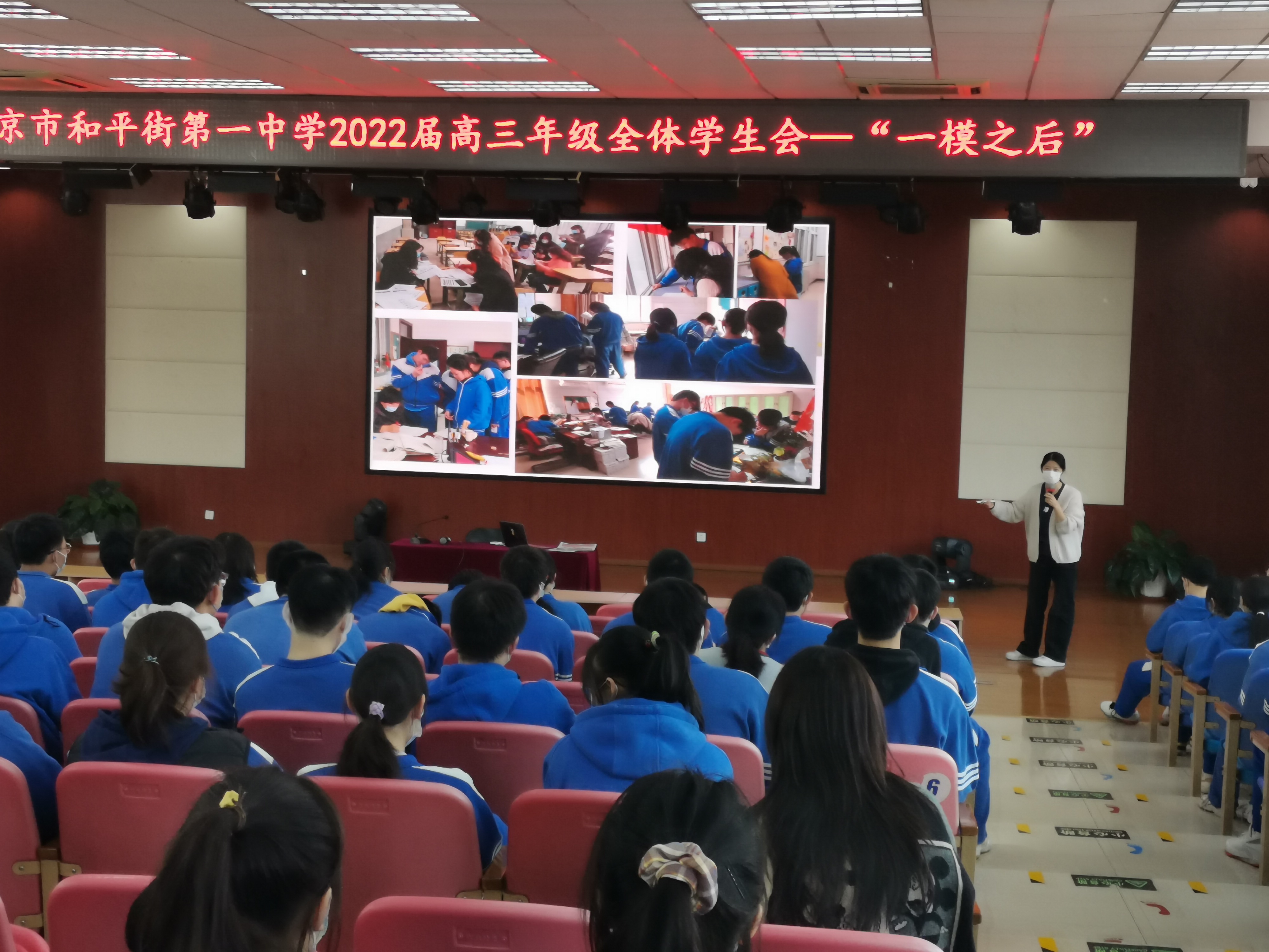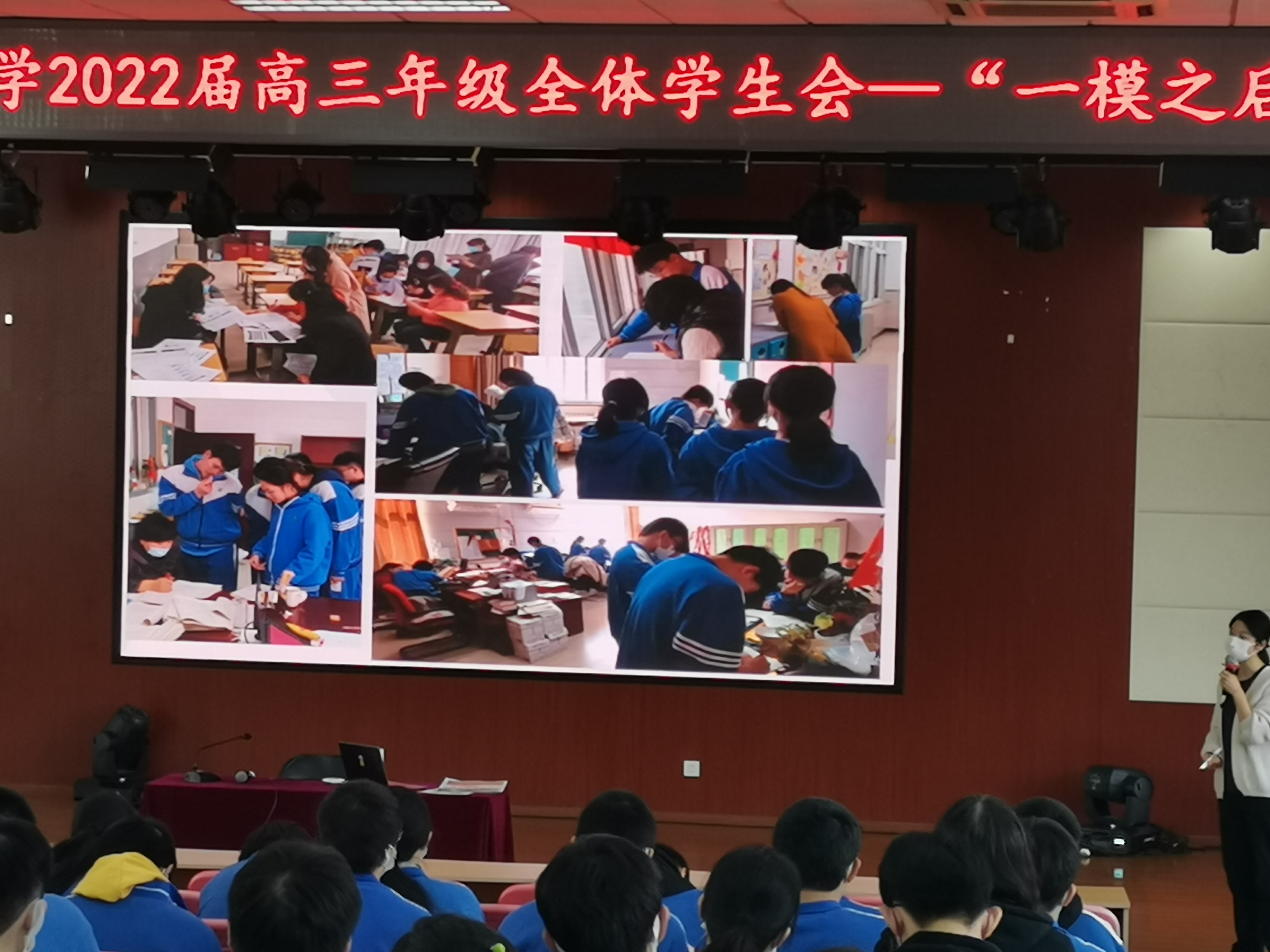 2022年4月1日结束了为期四天的一模考试后,高三全体教师针对每位学生进行的逐一分析,规划了后期对学生的重点辅导科目。2022年4月7日在五层阶梯教室召开全体学生会,高三班主任老师和全体学生参会。教务处刘堃主任为学生详细介绍后期有针对性的进行个别学科辅导的具体方法和计划。