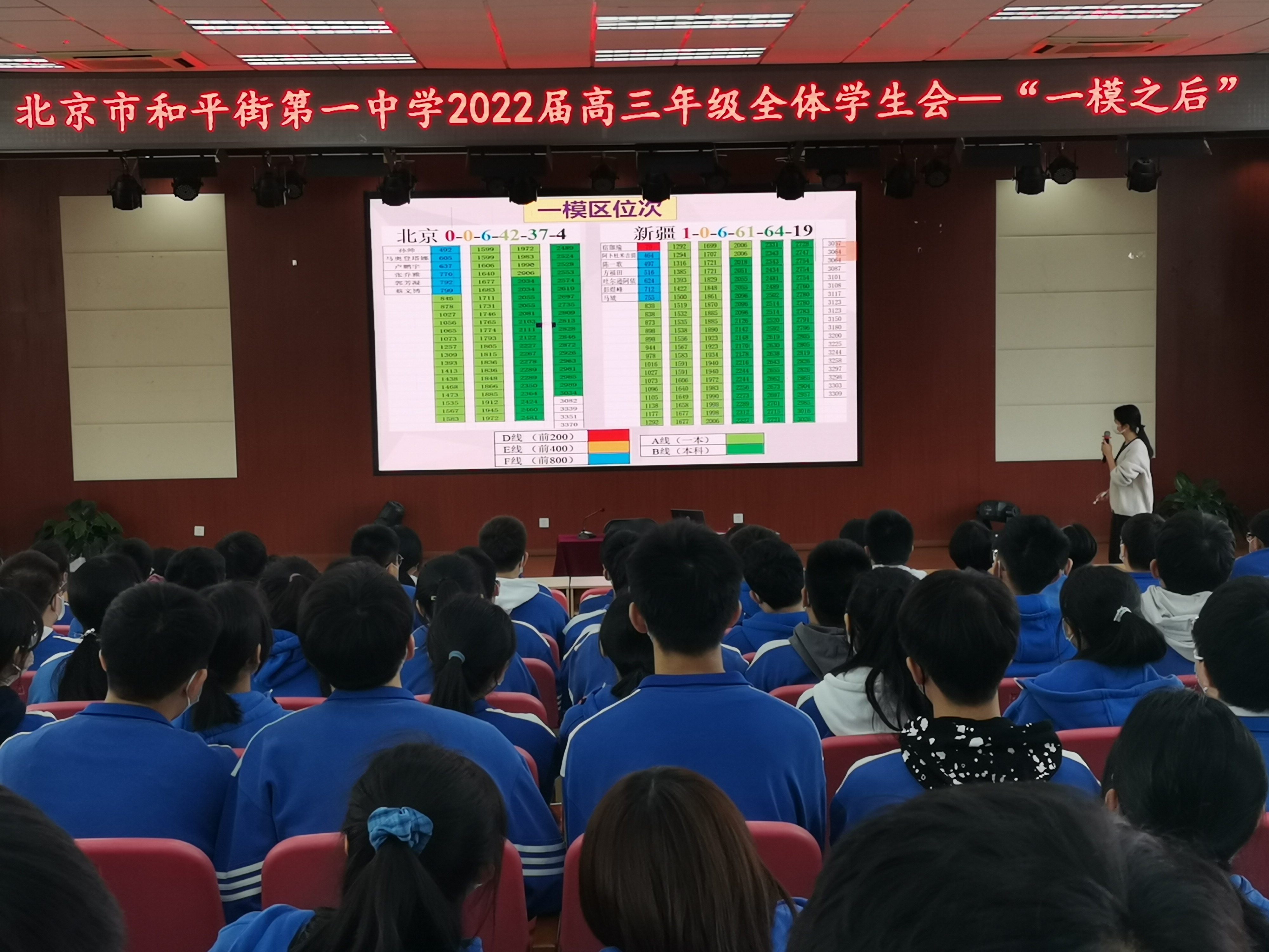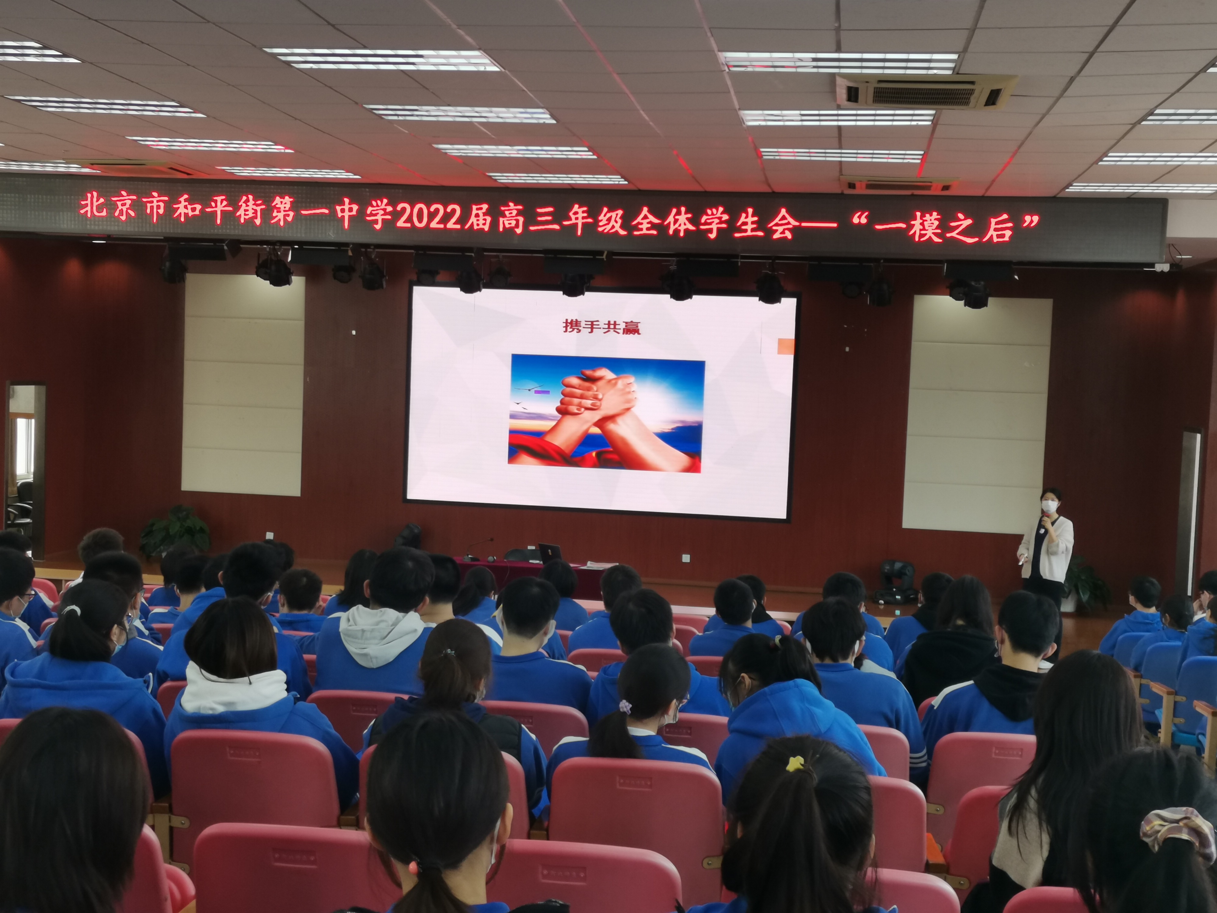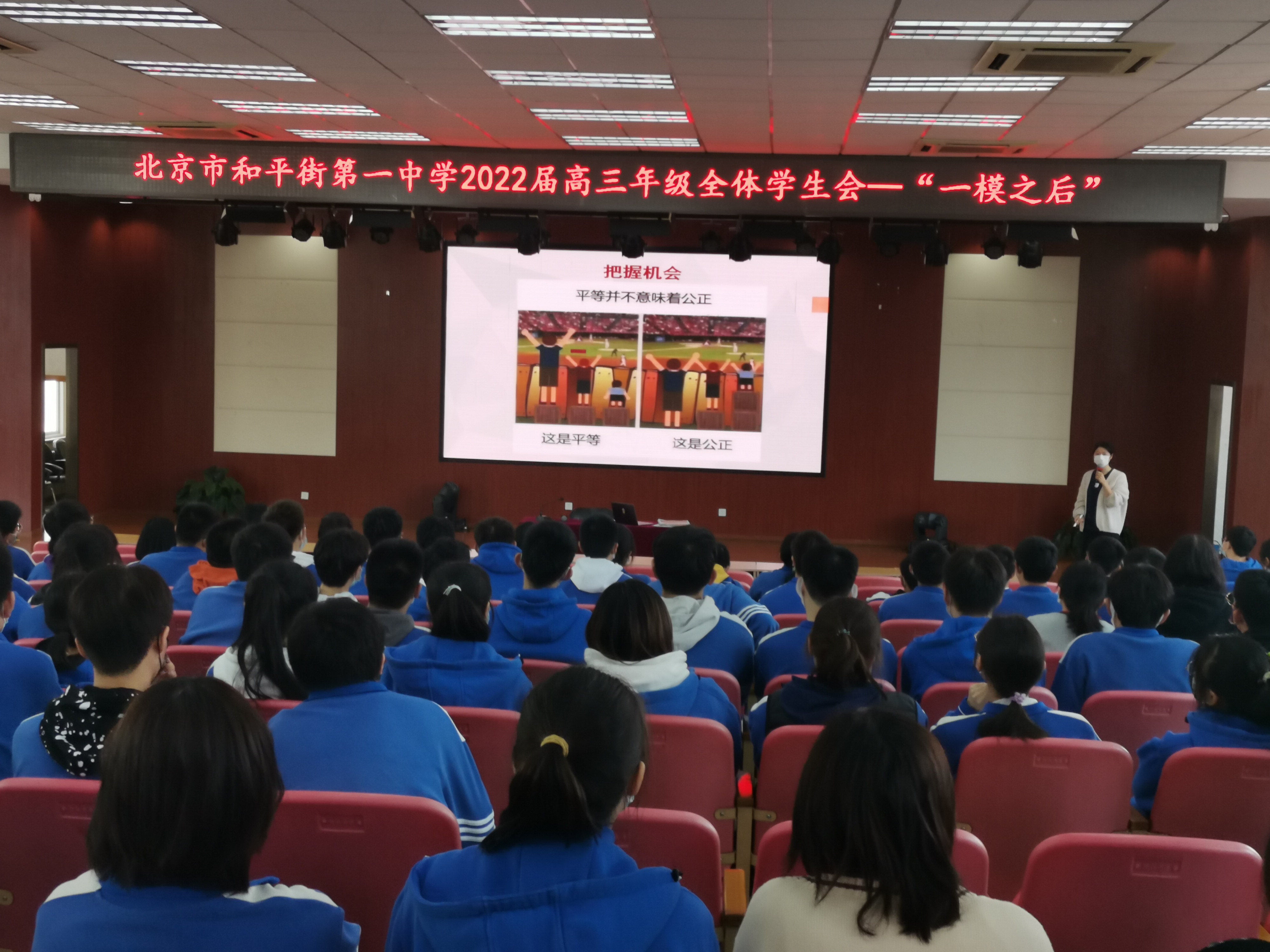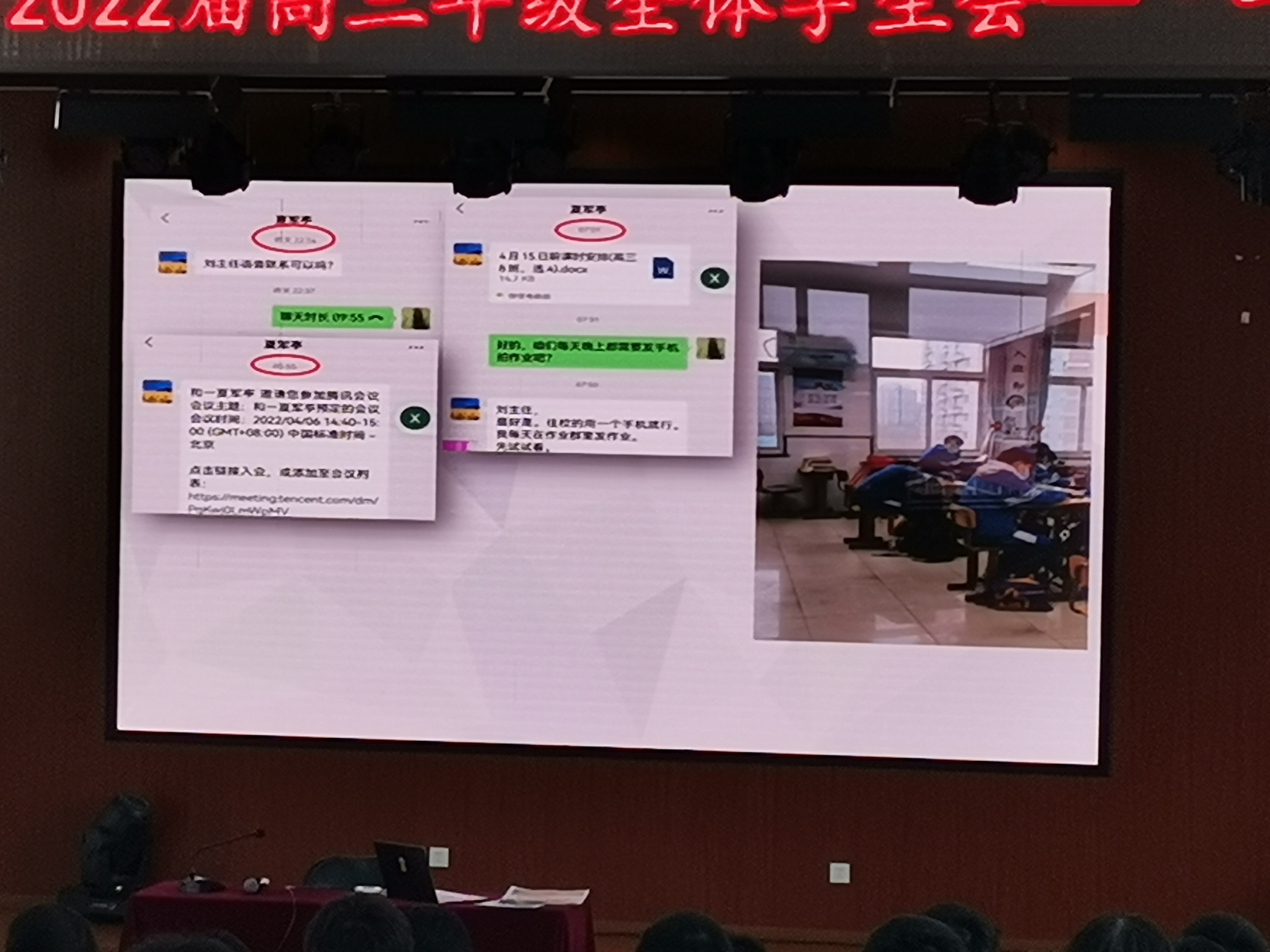 2022年4月1日结束了为期四天的一模考试后,高三全体教师针对每位学生进行的逐一分析,规划了后期对学生的重点辅导科目。2022年4月7日在五层阶梯教室召开全体学生会,高三班主任老师和全体学生参会。教务处刘堃主任为学生详细介绍后期有针对性的进行个别学科辅导的具体方法和计划。