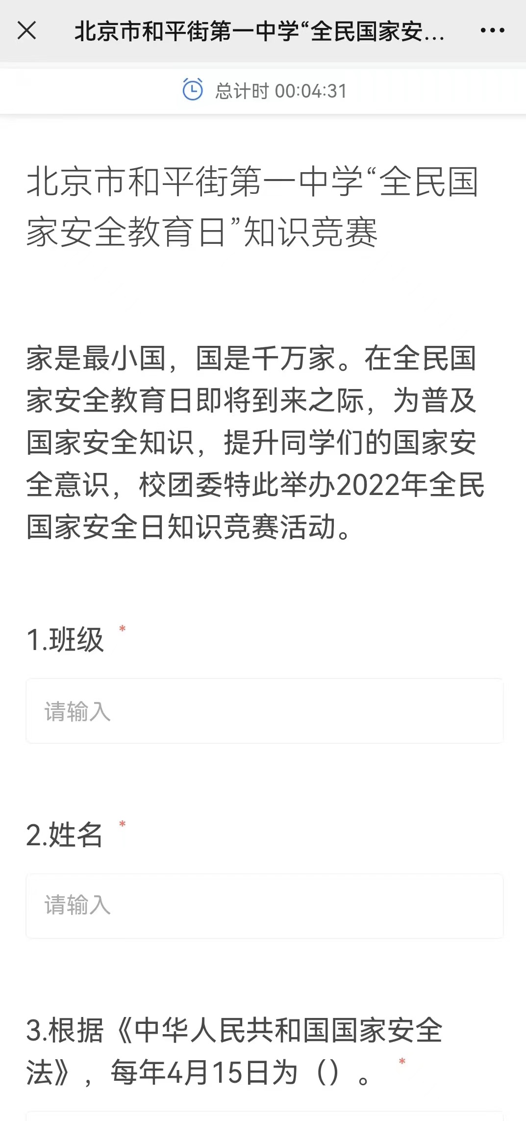 另外,学校电子屏一直循环播放着“4·15”全民国家安全宣传教育片,朝来校区面向初一、初二、初三年级开展国家安全知识竞赛。