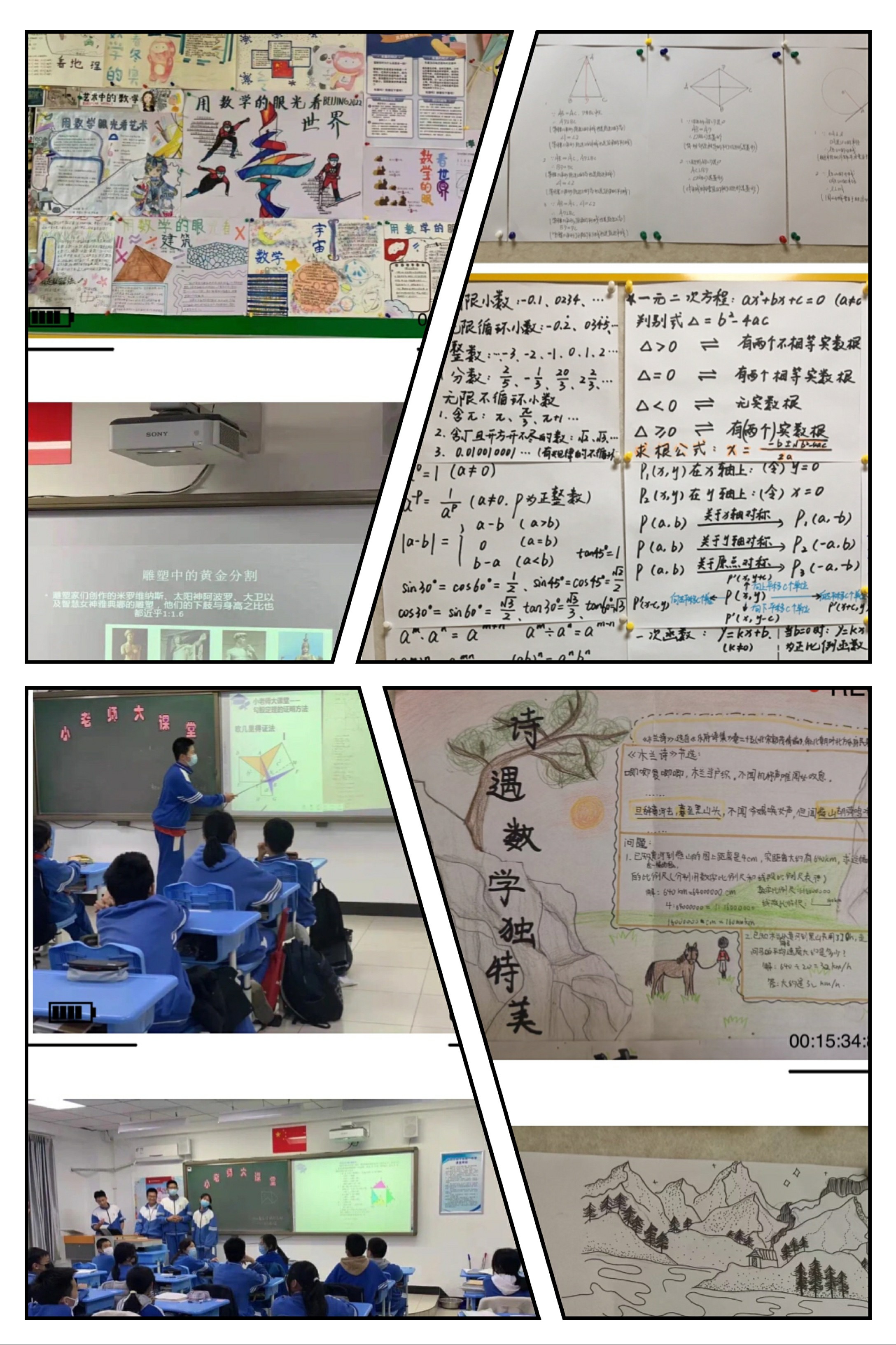 在教学实施过程中落实好四个细节为抓手提升课堂落实效益。一是板书示范通过主、副、辅助三种板书、多种颜色粉笔的合理使用,充分体现所学知识体系的结构、关联和重难点,并起到规范示范的作用二是深度学习通过合理的问题驱动、追问、等待、自主表述等教学策略,突出学生主体参与,实现深度学习;三是学法指导强调阅读题目要勾画,图形中要标注,笔记要用多色笔,学生在理解基础上言简意赅动笔写(而不是抄笔记),提升课堂落实效度;四是反馈评价在教学中提倡即时性评价,在每一项学习任务(活动)后予以评价,促进学生养成反思习惯,提升认知能力。在互动式、启发式、探究式、体验式等多样态的教学方式中,体现学生的主体性。不同课型都有学生的归纳、概括、总结活动设计,有让学生自主完善学科知识体系、问题解决策略体系的学习活动。无论是常态课、青年教师镜子课,还是骨干教师示范引领的 “课堂质量年”研究课都对照《朝阳区普通初中学校课堂评价量表》从教学目标、学习条件、学习指导、学习活动、学习评价、特色创新等几方面进行打分评定等级,进行课堂听评课交流。