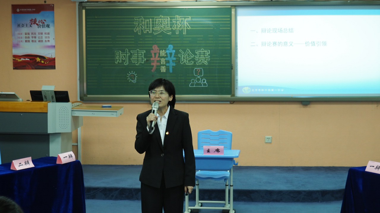 赛后,苏丽娜老师对本次辩论赛做了全面总结,她引用北宋思想家、理学家张载的诗“为天地立心,为生民立命,为往圣继绝学,为万世开太平"寄希望于奥运村学子——更加自信阳光,将来长大了走向社会,能够成为各行各业德才兼备的精英。为了正义,成为能言善辩的律师;为民发声,成为据理力争的人大代表;为维护司法公正,成为刚正不阿的检察官。