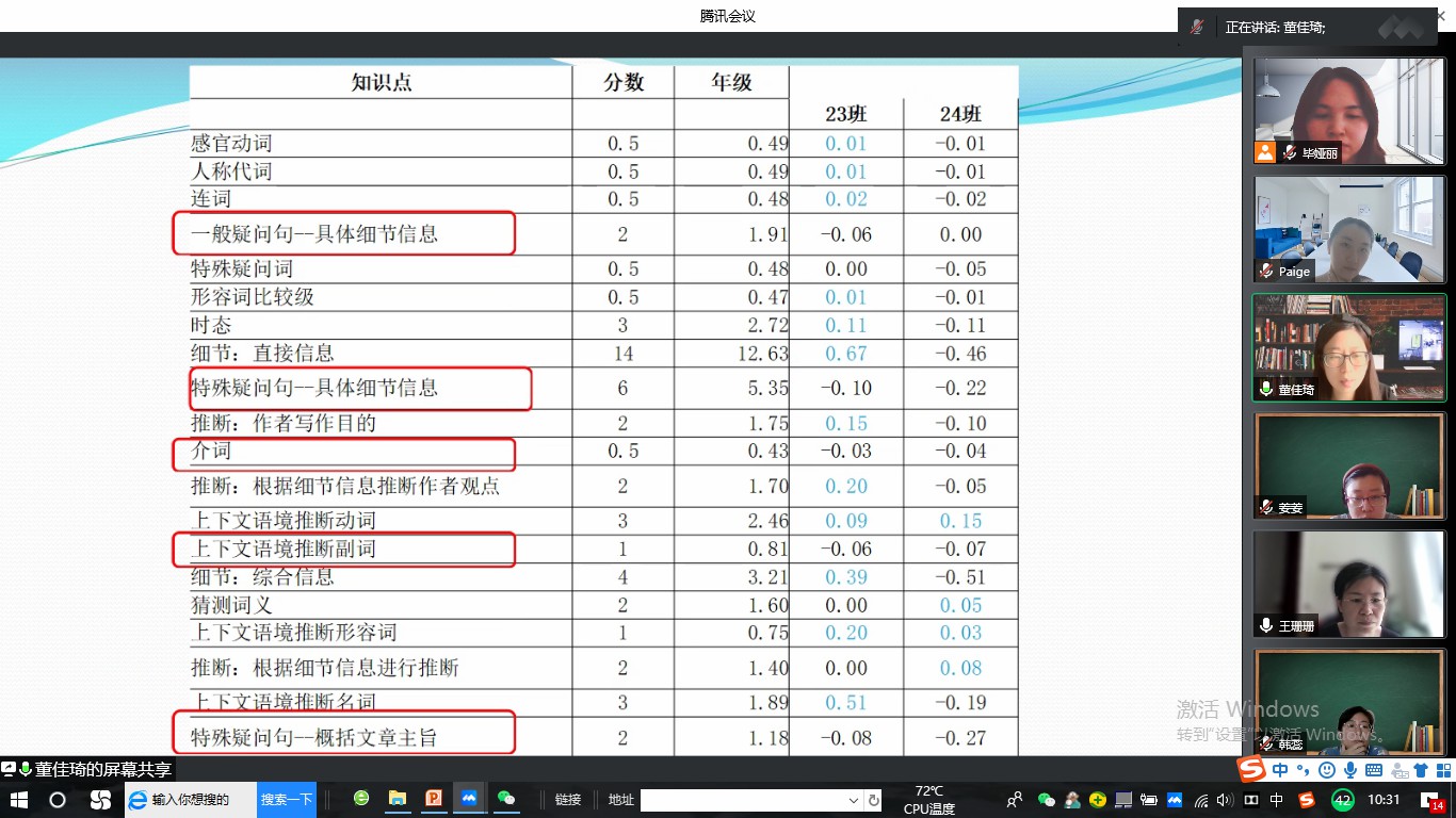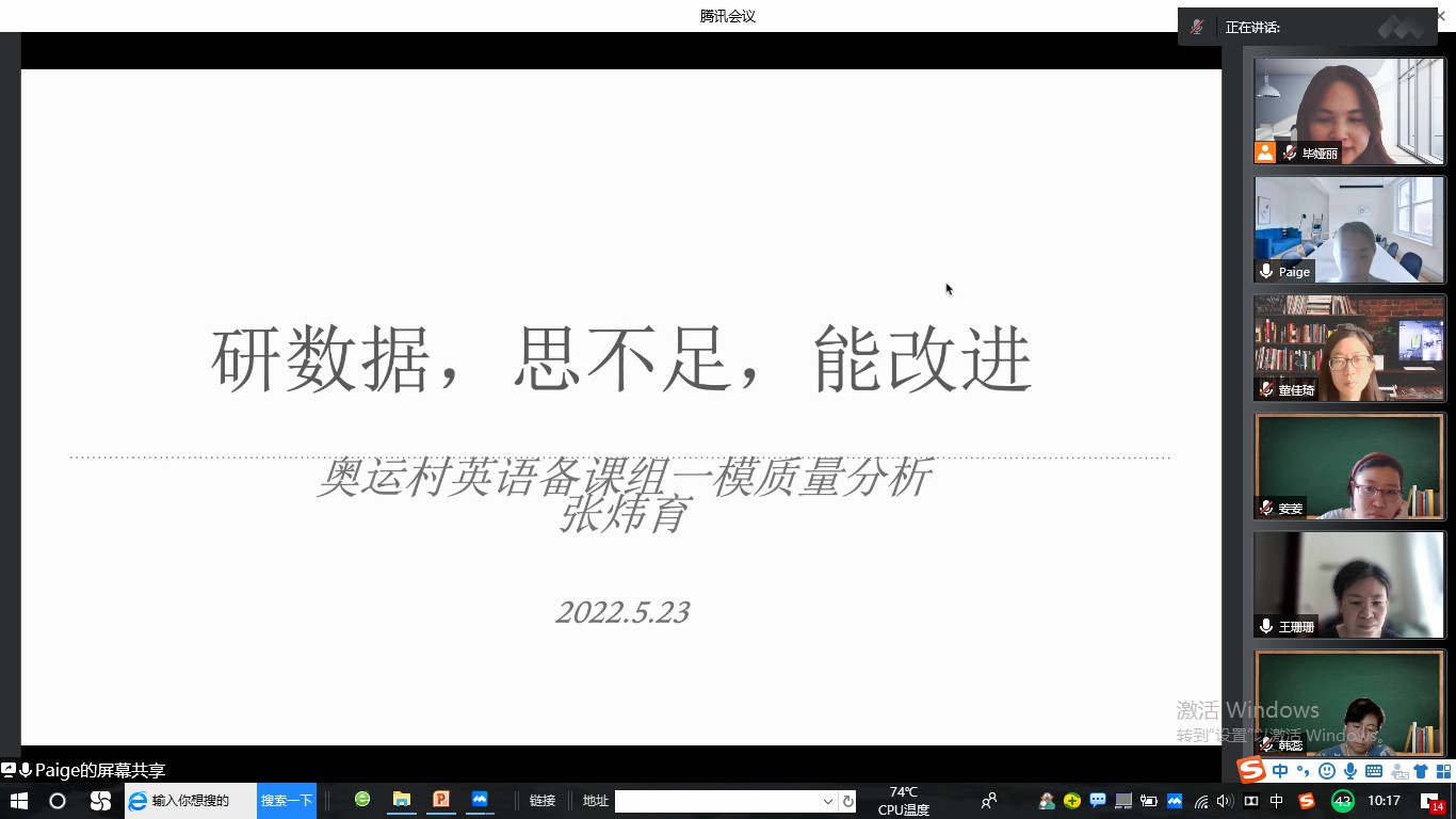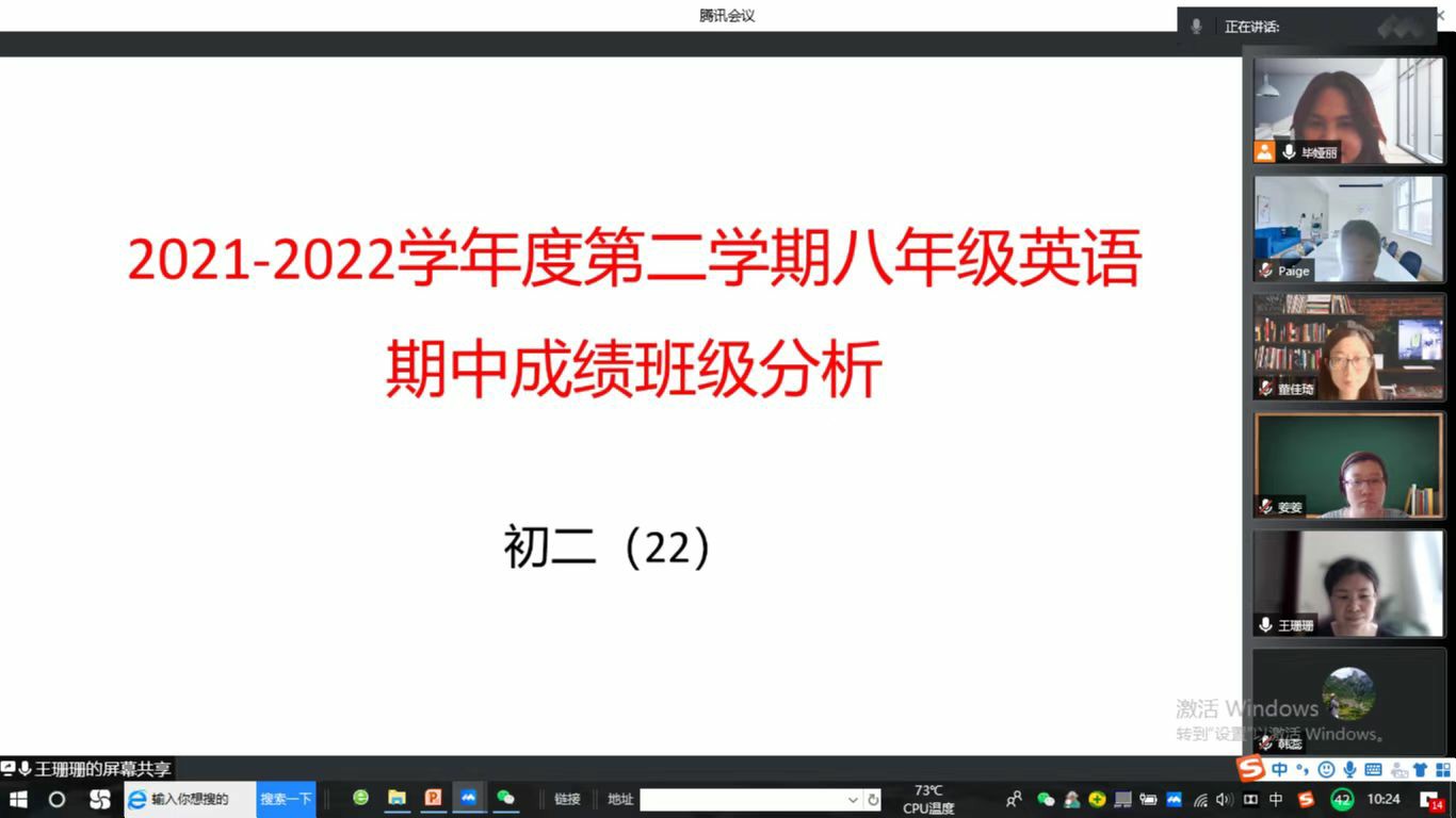 为了进一步总结上半学期的教学工作,使后一阶段的工作再上新台阶,奥运村校区英语教研组于2021年5月23日上午线上举行期中教学质量研讨会。三个备课组基于前期的数据分析,展示了教学中的成绩优势和工作亮点,同时也查找问题分析原因,并提出了相应的解决措施。
