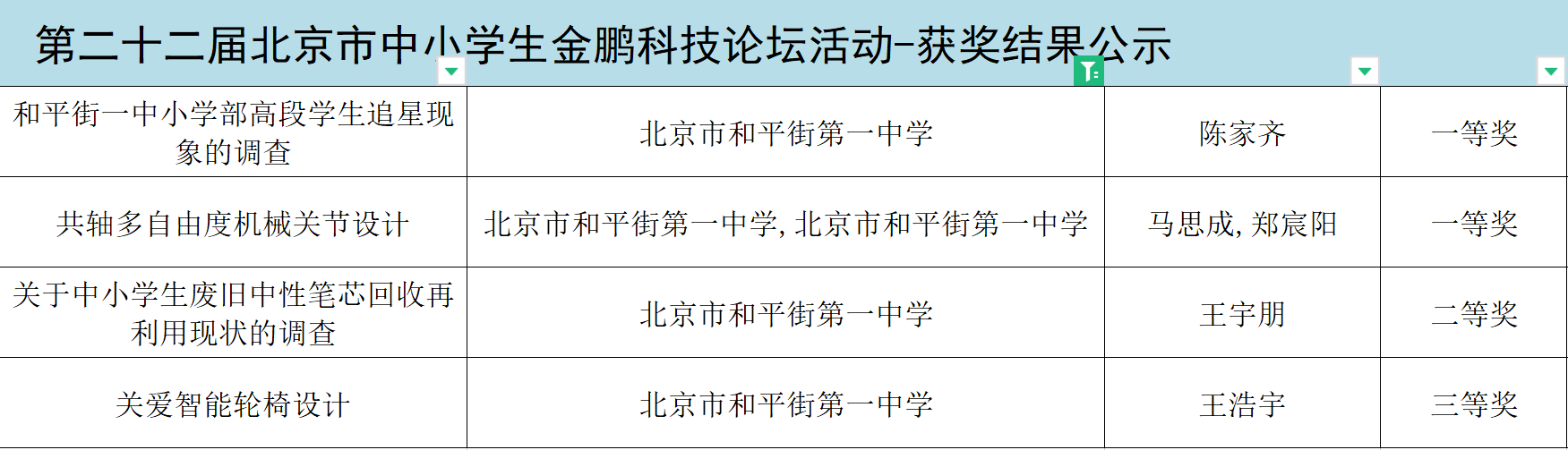 在刚刚结束的第22届北京市金鹏科技论坛活动中,和平街一中师生积极参加,经过专家初审、复审和终审,最终取得了一等奖2项、二等奖1项和三等奖1项的优异成绩。