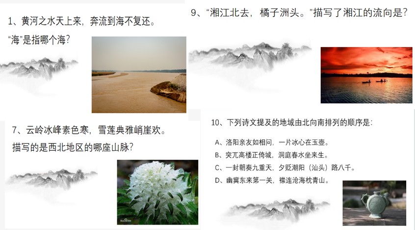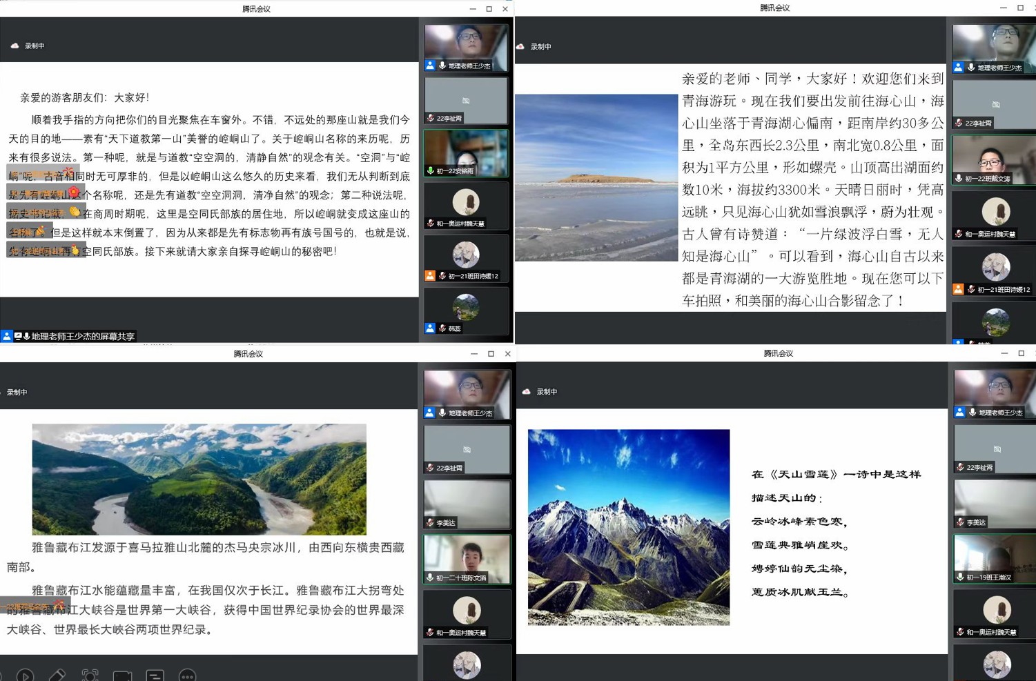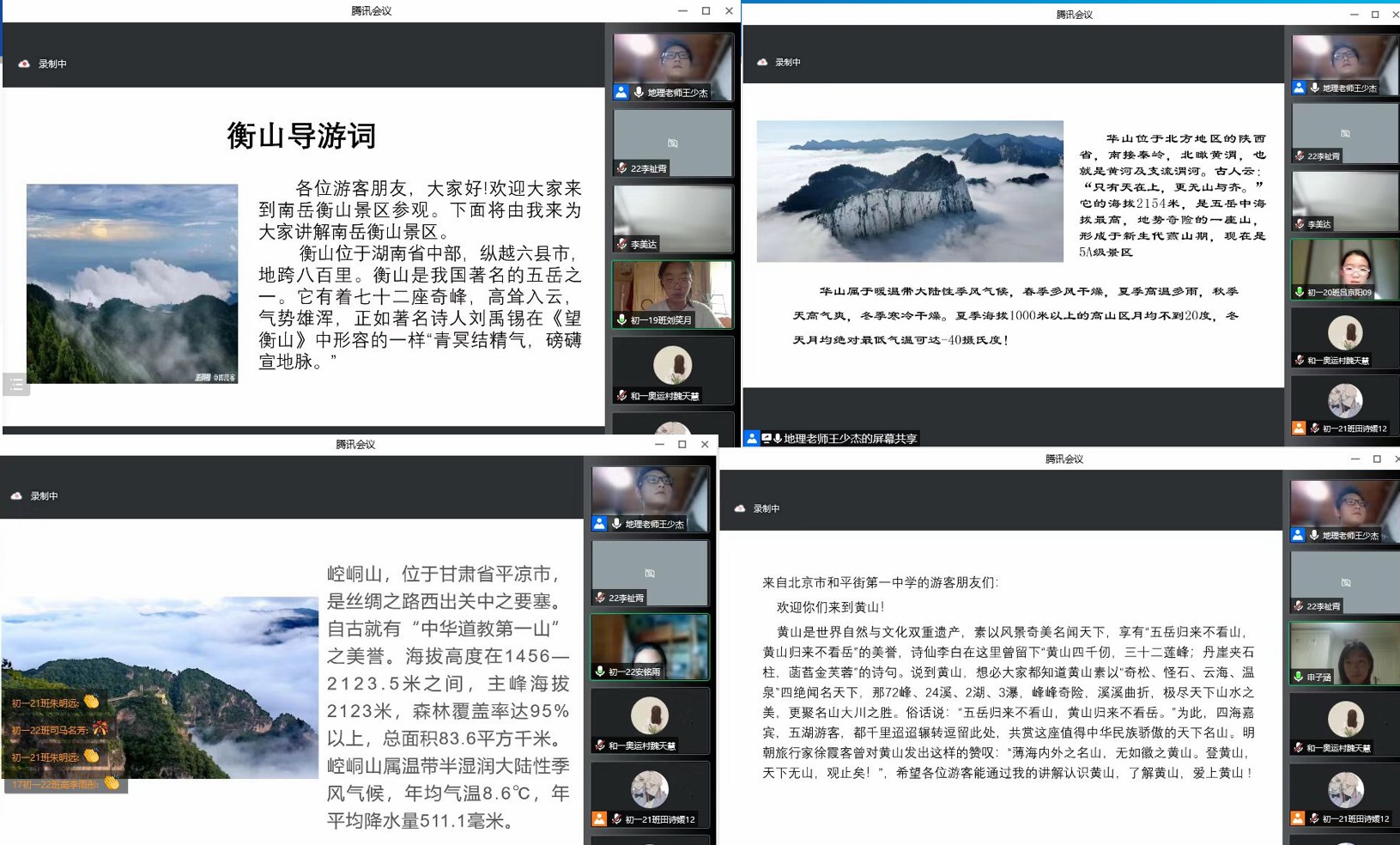 在本次跨学科活动中,奥运村校区初一年级的同学们积极参与,利用端午假期,以小组合作的形式查找了丰富的资料、撰写了严谨的导游词、制作了精美的PPT,利用班会课的时间进行了精彩的展示汇报。一组二组聚焦南方地区,分别介绍了衡山的气势雄浑和黄山的著世“五绝”;三组四组选择北方地区,一起介绍了有“华夏之根”美称的华山;五组六组则将目光投向西北,分别介绍了神话小说经常提到的天山和被誉为“天下道教第一山”的崆峒山;七组八组穿越到青藏地区,分别介绍了位于青藏高原青海湖中的海心山和拥有世界最深最长大峡谷的雅鲁藏布江。