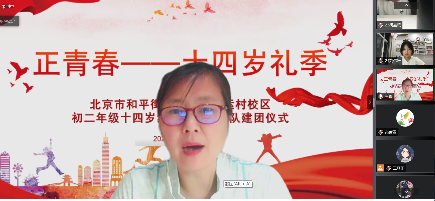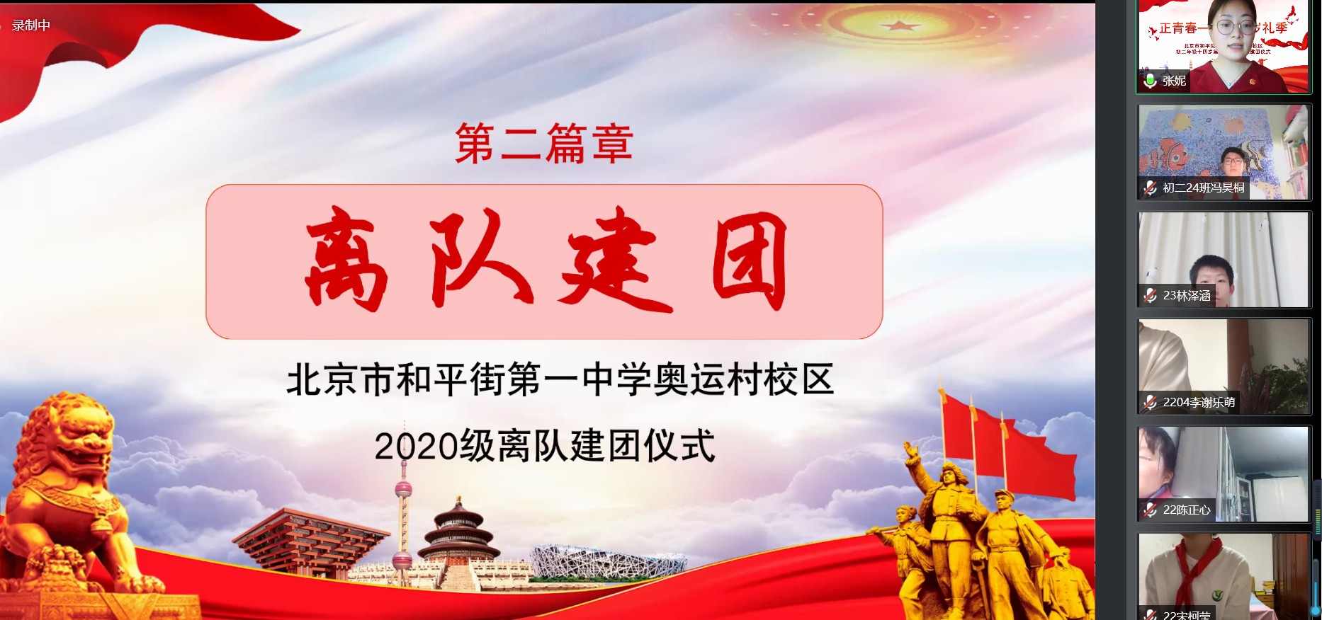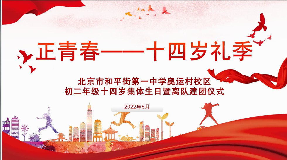2022年6月7日晚,和平街一中奥运村校区初二年级全体师生家长相聚云端,共同举行“正青春——十四岁礼季”初二年级十四岁集体生日暨离队建团仪式。