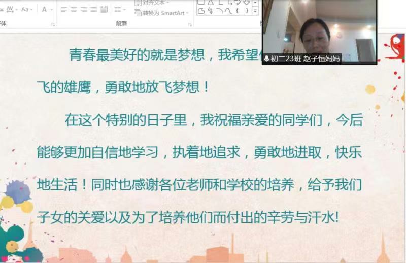 虽然我们各自居家,但距离隔绝不了老师的关心和同伴的支持,当学生看到来自老师、同伴和家长真挚深情的信件后,都被她们的真情深深感动,纷纷表达了当时激动的感受。赵子恒妈妈作为家长代表向同学们表达了迈向青春大门的祝贺和殷切期望,并感谢老师和学校的培养。年级组长王珊珊老师对线上教育教学期间给予年级组工作支持的家长们表示感谢,家校合作共育共赢。插入图1-8