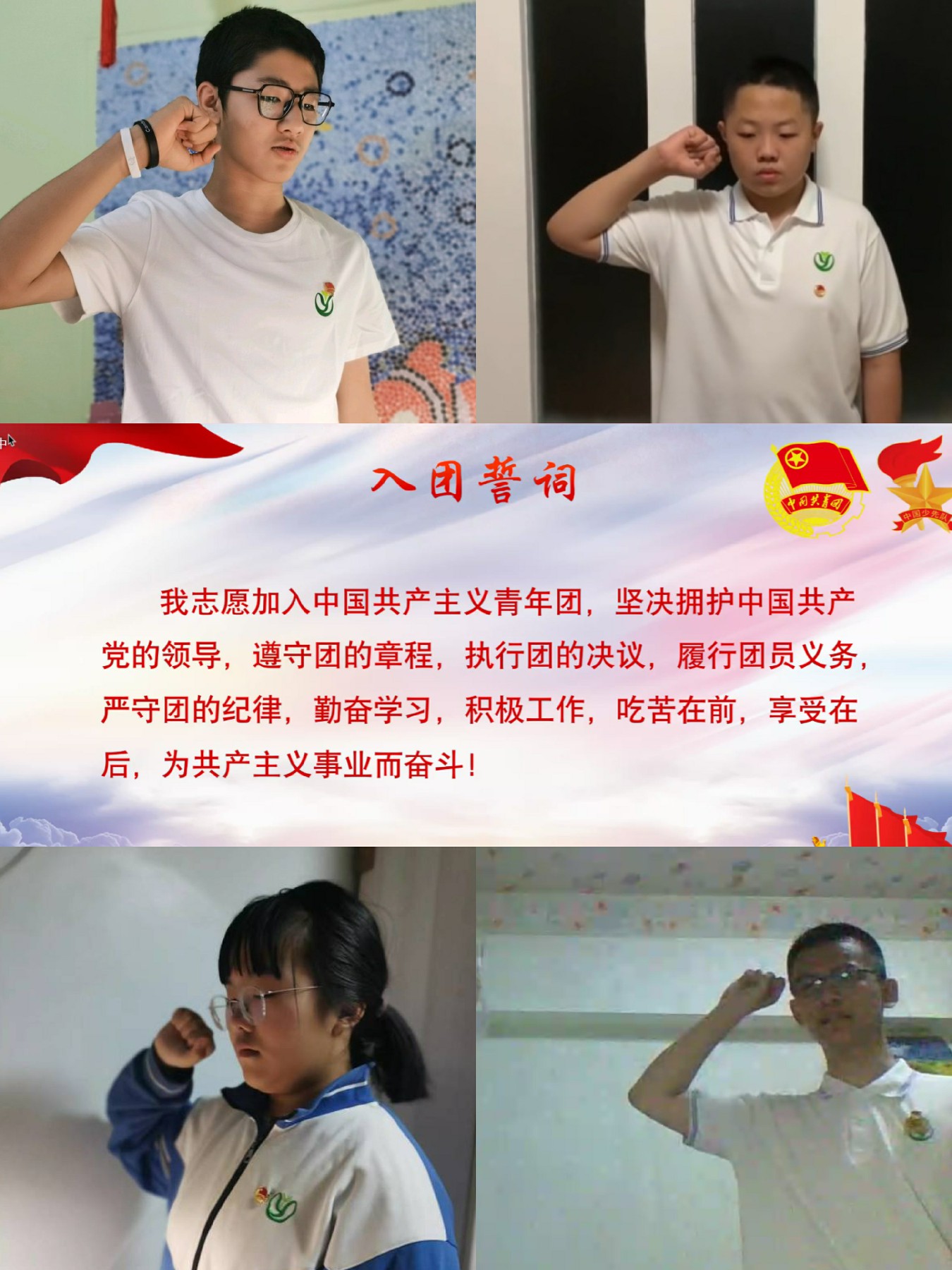 习近平总书记曾说:入队、入团、入党,是青年追求政治进步的“人生三部曲”。今年是共青团成立100周年,初二年级有12位同学在这个光荣的时刻迈向了人生新的阶段,成为了光荣的共青团团员。家长们为他们佩戴上了闪亮的团徽,他们在团旗下庄严宣誓。