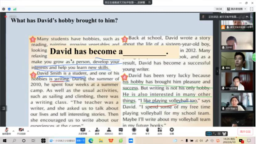 研究课上,教师精心设计问题,引导学生思考。宋莹老师的授课内容是2022朝阳一模D篇的讲解。宋老师从中考为切入点,引发学生对“竞争和合作”这一话题的思考。然后,宋老师引导学生绘制文本大纲的方式梳理文章信息,帮助学生把握文章内容。最后,教师基于文本内容,引导学生进一步探索作者观点意图,引发学生的深入思考。裘文文老师的授课内容是八下M6U2,围绕“爱好”进行探究。裘老师在课前为学生播放“爱好”的相关视频,氛围满满。课上,裘老师引导学生绘制思维导图,帮助学生梳理文章信息。然后,裘老师通过问题链的方式,引导学生对文章写作手法、写作意图进行深入探究。最后,学生由彼及己,认识到爱好对个人成长的意义。课堂上,学生积极参与,通过线上批注等方式与老师互动思考,表现出色。