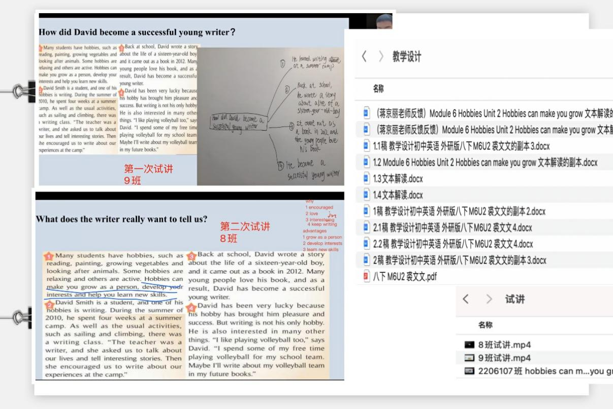 研究课前,教研组认真研读,集思广益,共同备课。一堂好课,离不开前期充分的准备。对于此次研究课,和平街英语教研组高度重视,教研组长张燕英老师积极组织全组老师研读文本,共同备课,希望以此提升两位青年老师和全组老师的文本分析能力。首先,老师们认真研读文本,梳理文本内容,探究作者观点意图,充分挖掘文章背后的价值。磨课如磨刀,刀越磨越快,课越磨越精。教学思路确定后,教研组老师协调时间,进行试讲评课,打磨课堂细节,不断精进完善。虽然疫情居家有诸多不便,但是英语教研组克服困难,多次进行线上会议,帮助两位青年教师梳理思路,优化细节,尽可能给学生带来最精彩的课堂。