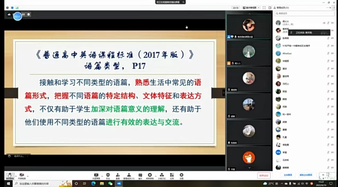 为了进一步增强教师文本研究能力,提高线上课程质量,2022年6月10日,和平街初中校区开展了教师研究课活动。和平街一中三个校区全体英语老师齐聚云端,观摩了宋莹老师和裘文文老师的线上研究课,并进行了在线评课研讨。此次活动由张燕英老师主持,市教研员蒋老师指导,老师们受益匪浅。