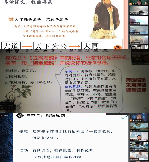 宋斌老师执教的《大道之行也》一篇思辨性阅读文章。宋老师把理解释义和文章内容自然结合,让诵读贯穿始终,同时让学生转换否定句和肯定句,把学习内容融入到思辨性任务群中,提升学生的高阶思维。