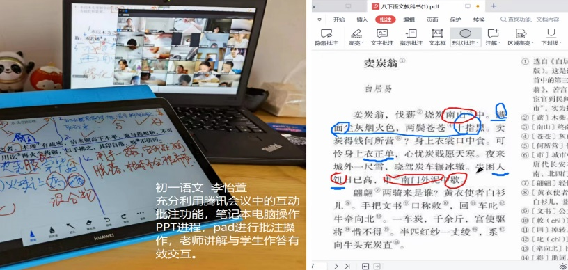 为了能让线上教学有更好效果,语文组老师也在教研时相互交流,彰显组内教师个体优势,形成集体智慧。例如学习任务前置,培养学生自学能力,充分利用腾讯会议的互动批注、