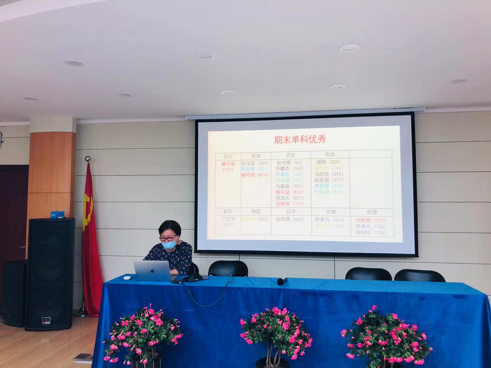 首先,年级组长程瑞芬老师对高一年级的期末考试情况进行整体介绍。程老师利用平台数据,从上线情况、平均分、各层次学生等角度分析考试状况,反思前一阶段教学目标的完成情况,在总结经验、查找问题、确定措施的基础上明确新学年教学目标与方向,明确暑期的学生管理措施。程老师还分享了高一年级组在习惯培养上的具体做法,总结了高一年级一学年的习惯培养成果。