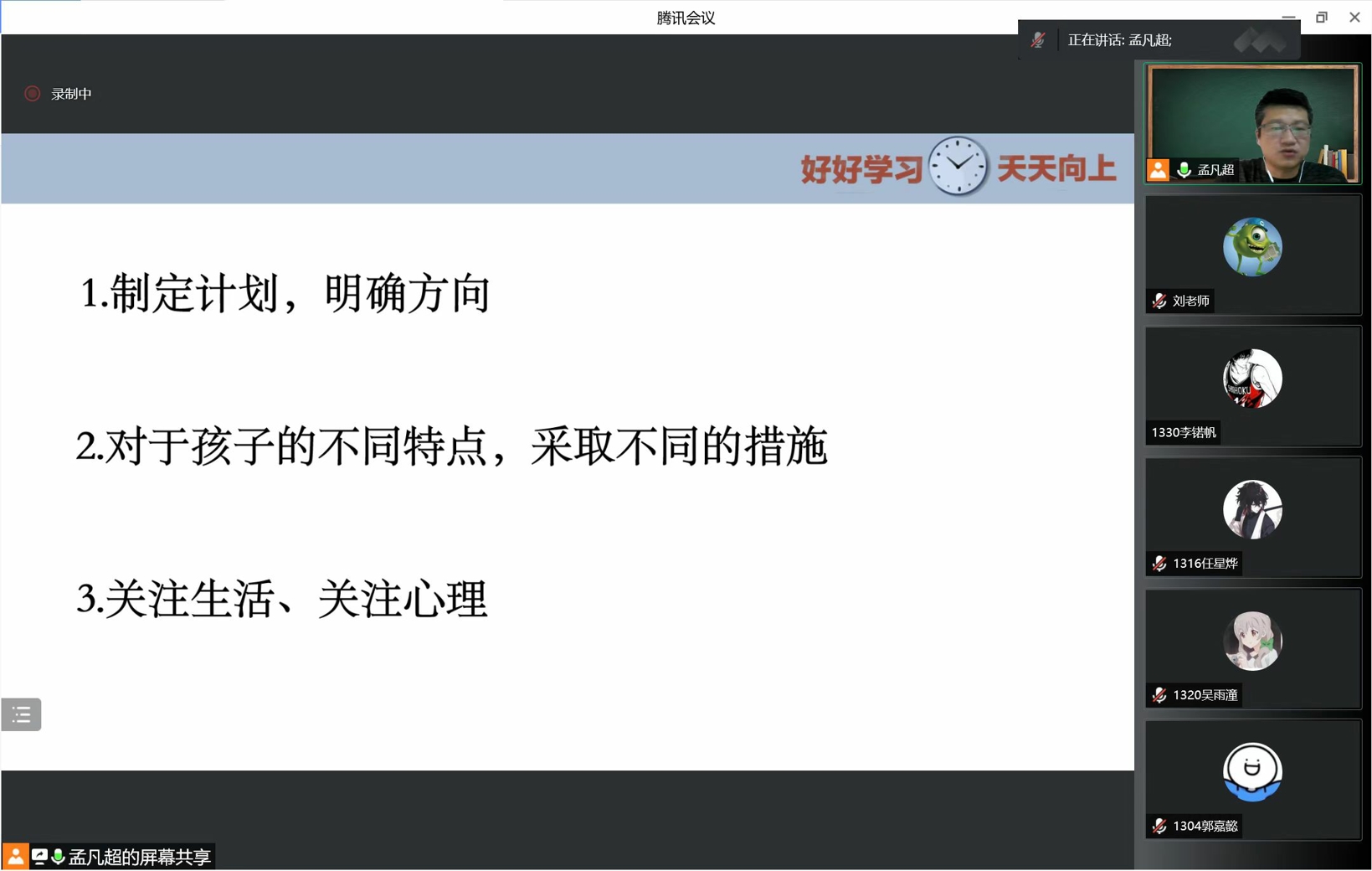 会议第二阶段在各班腾讯会议室召开,会议由各班班主任主持,班主任就班级特色以及本学期学生的学习情况进行交流,各科老师针对不同类型孩子的核心特点,提出了暑期的学科学习建议,帮助家长从孩子的角度出发给孩子更切实的帮助,制定详尽的计划让孩子的生活有规律,督促孩子认真完成假期作业,为迈向初二年级做好准备。