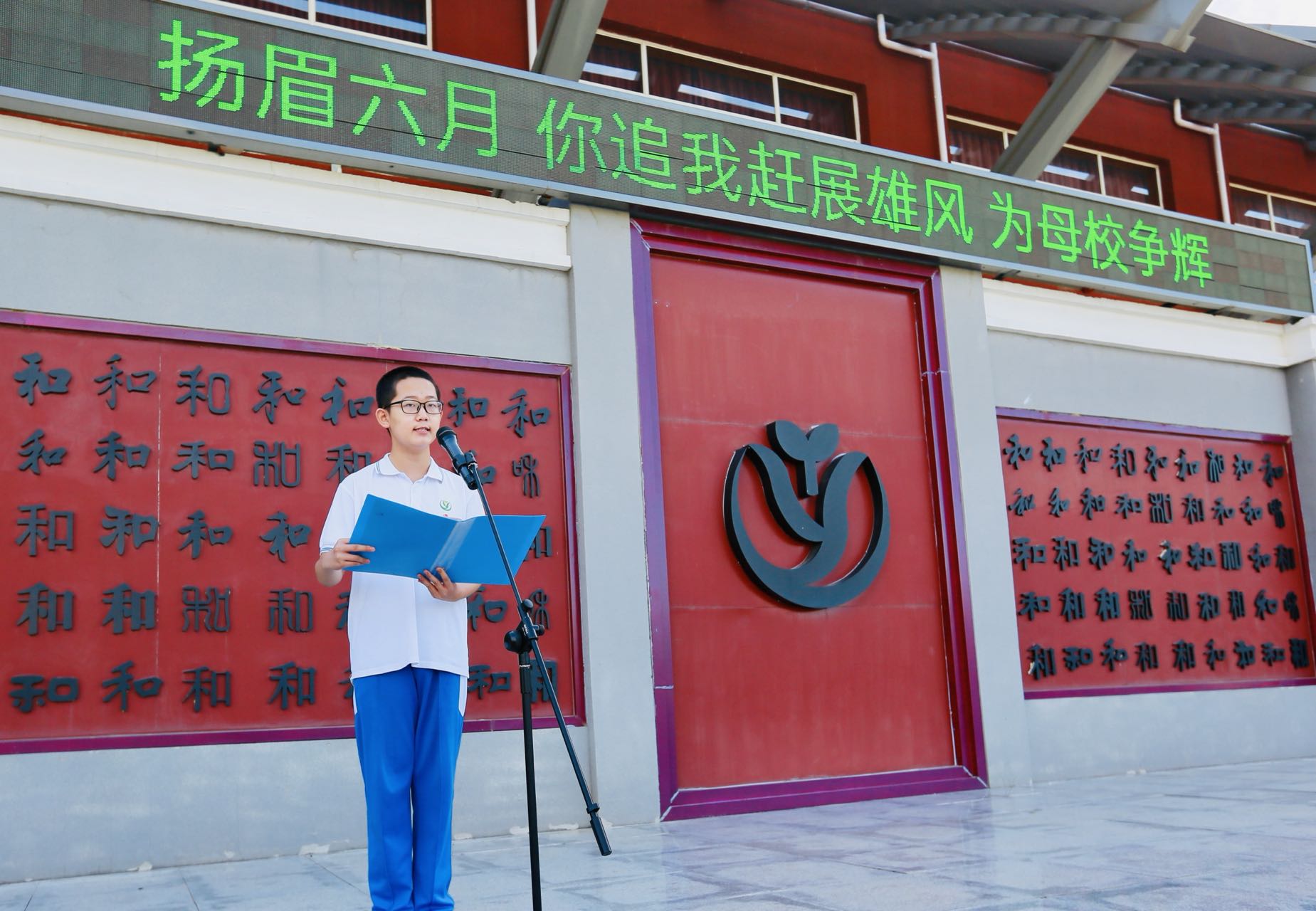 在聆听了领导和老师们的殷殷叮咛后,王爽同学代表新初三全体学生发表了感言。“奋战一年,争分夺秒凌绝顶,让青春无悔;扬眉六月,你追我赶展雄风,为母校争辉!”王爽用一幅对联与同学们共勉。