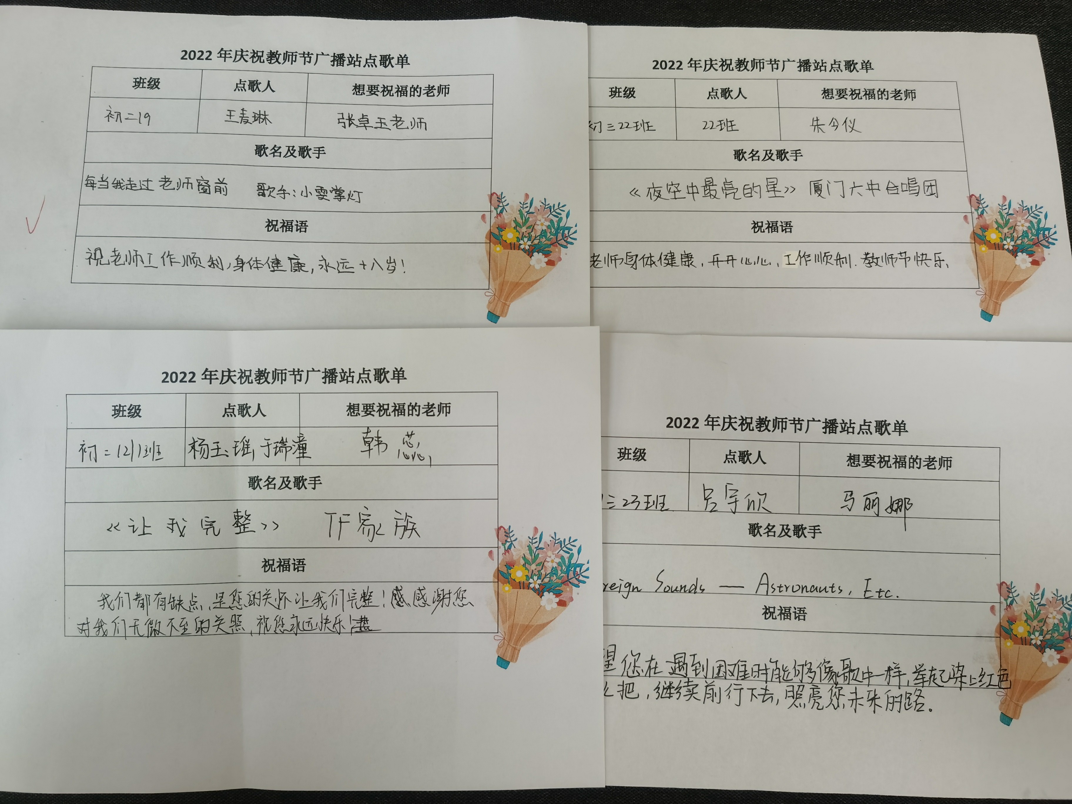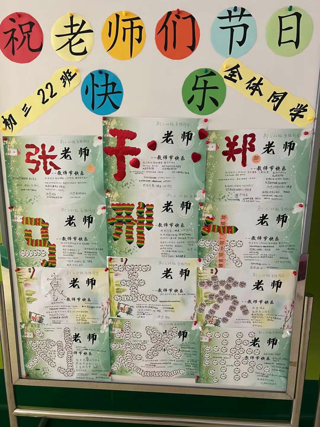 学生会开展了为期一周的“我为恩师点首歌”活动,用歌曲表达对老师们的感恩与祝福。各班同学通过展板、手工、绘画等形式向老师们倾诉着浓浓的师生情。