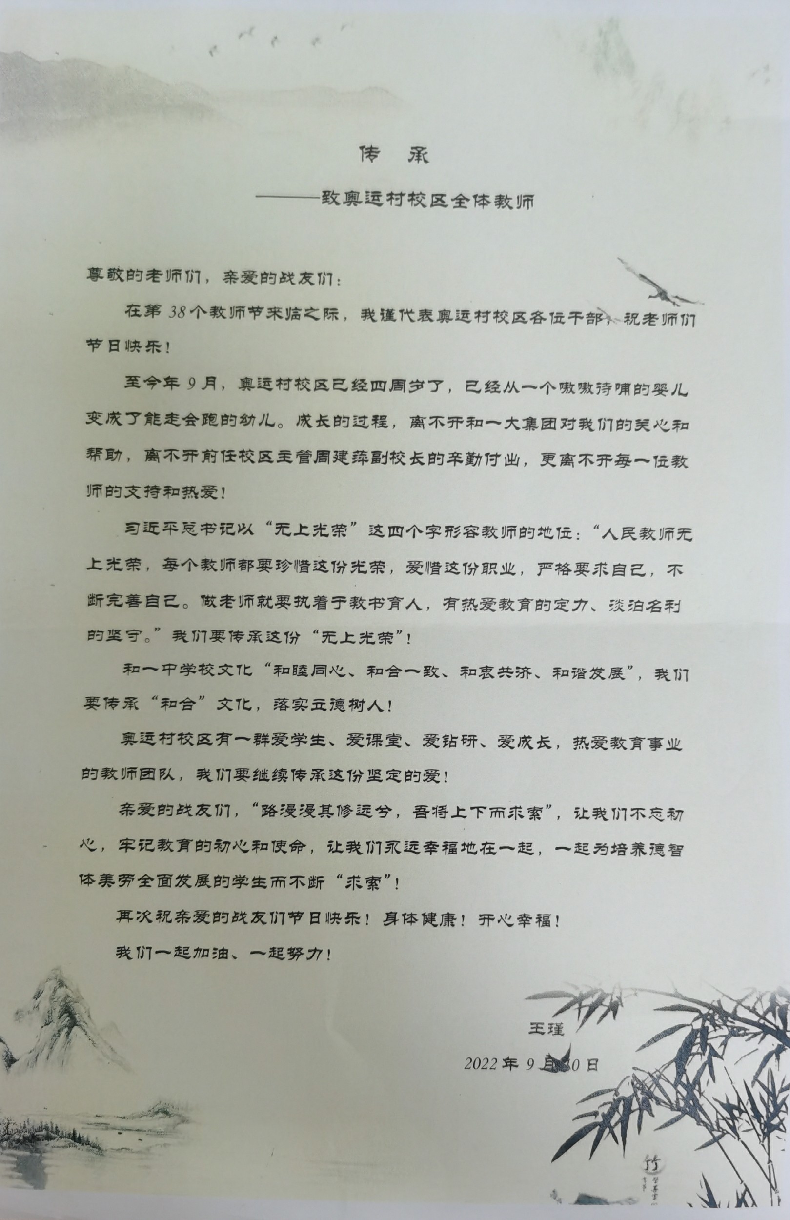 一支粉笔,两袖微尘,三尺讲台,四季耕耘。在第38个教师节来临之际,北京市和平街第一中学奥运村校区开展了丰富多彩的庆祝教师节系列活动,为全体教师送上节日的祝福。